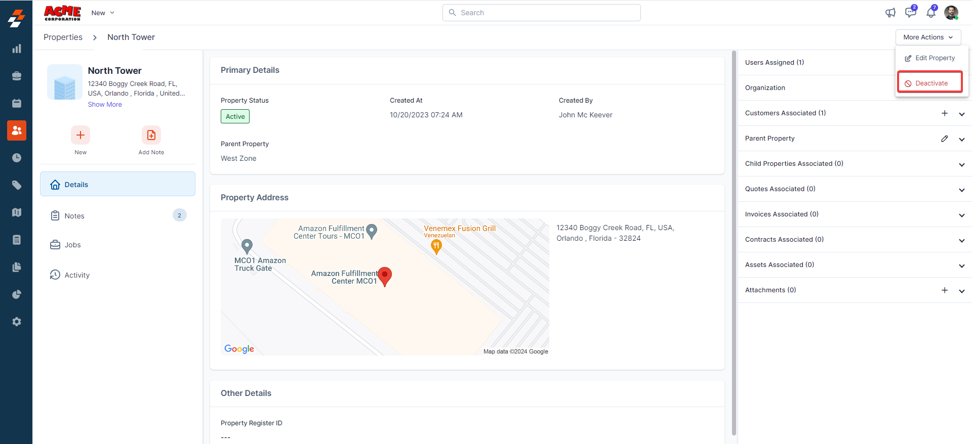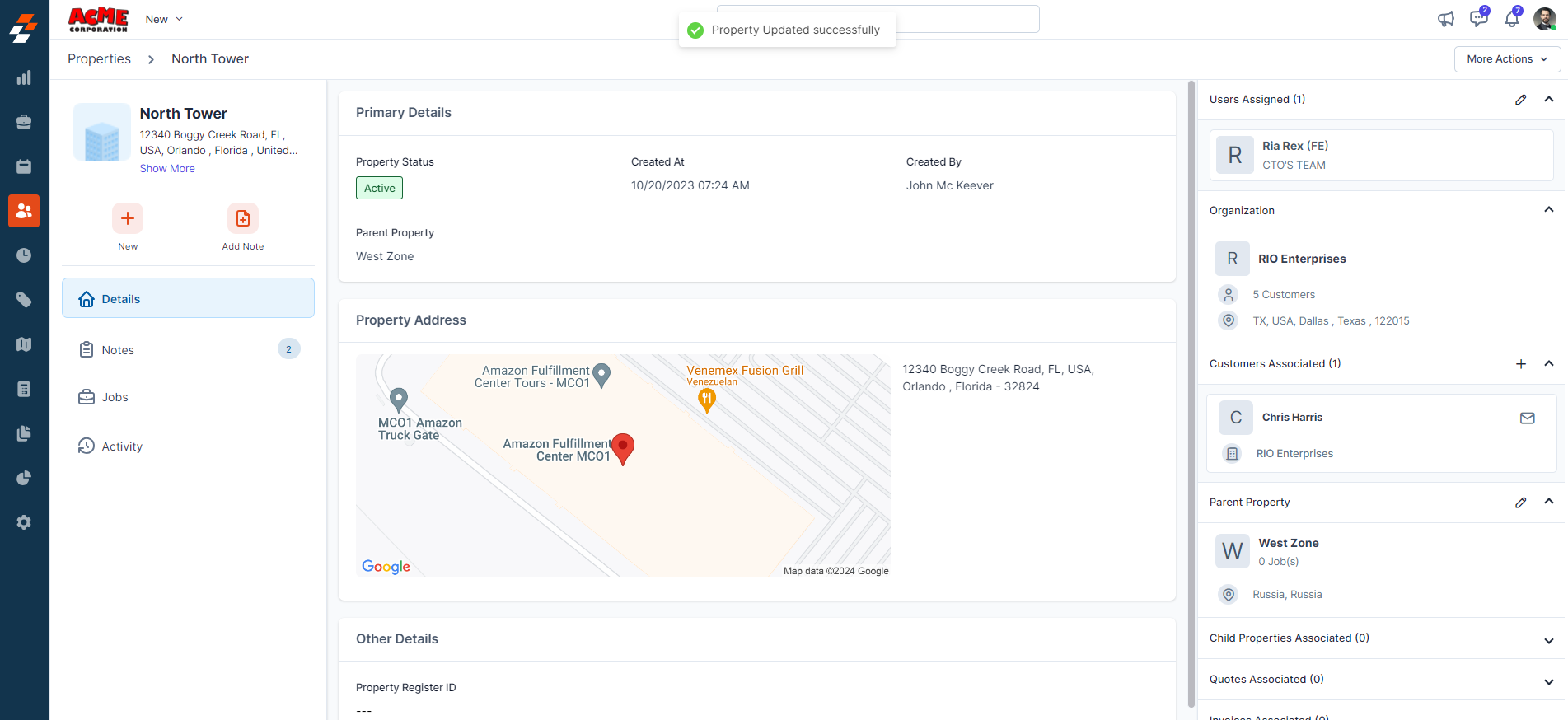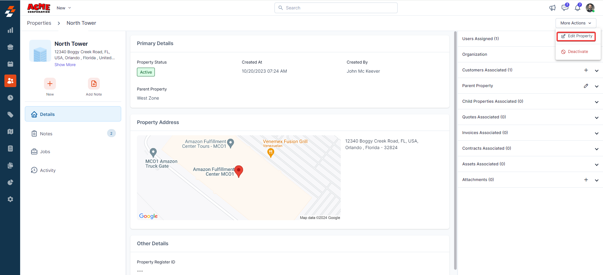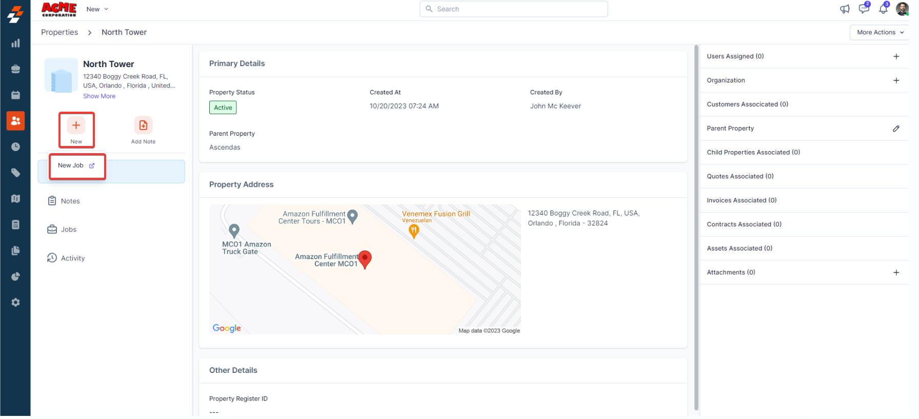 Below the quick actions bar, you can find the property details, notes, jobs, and activity.