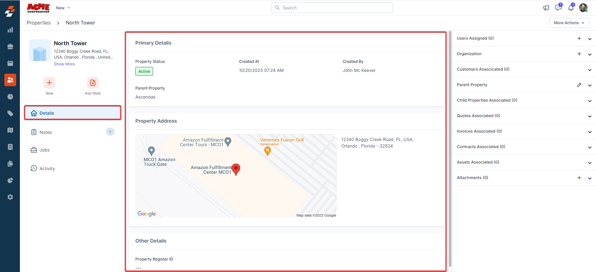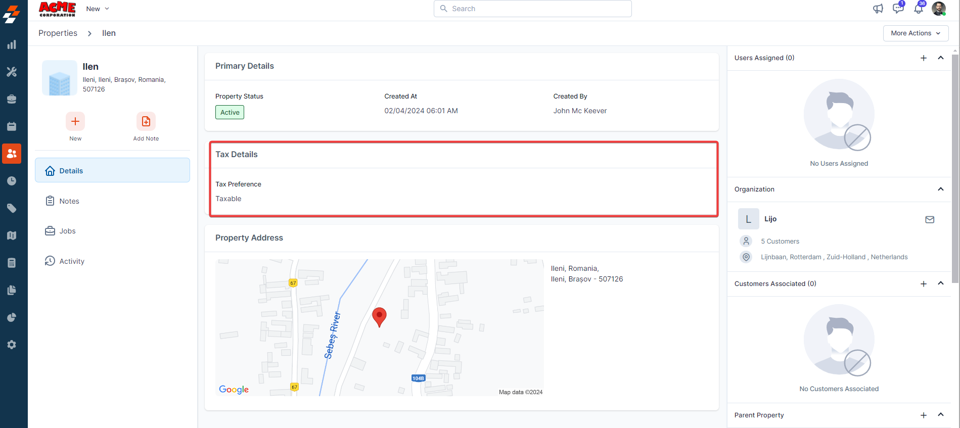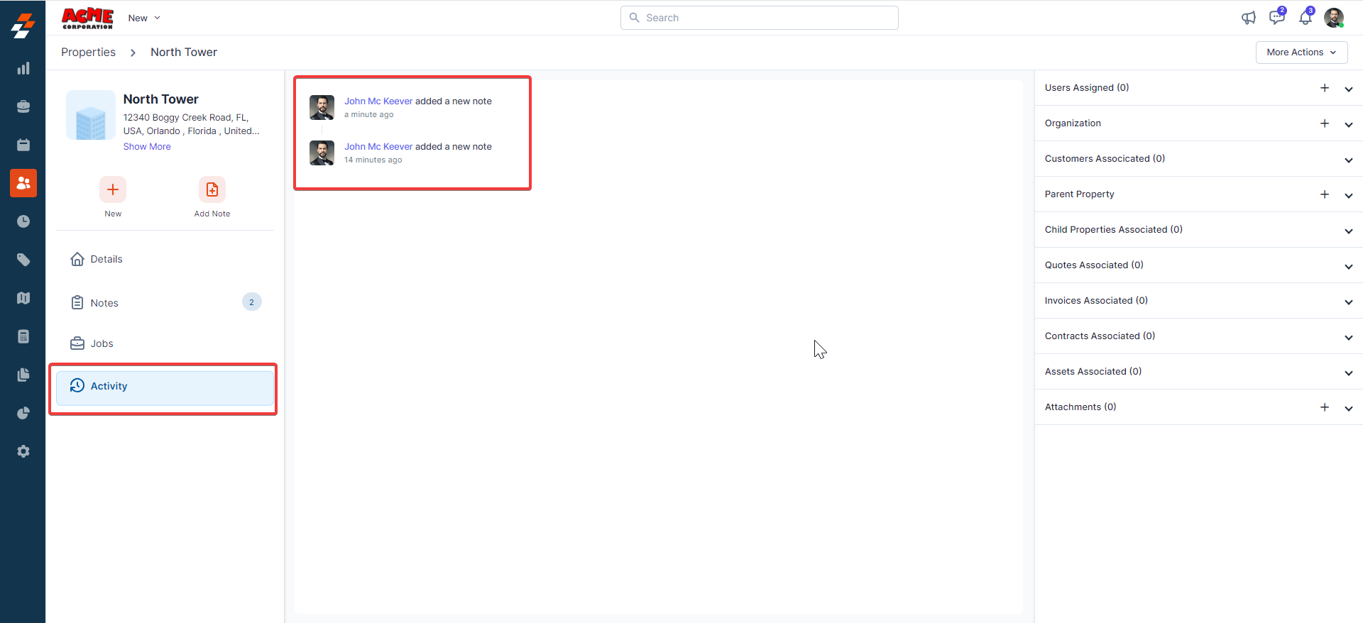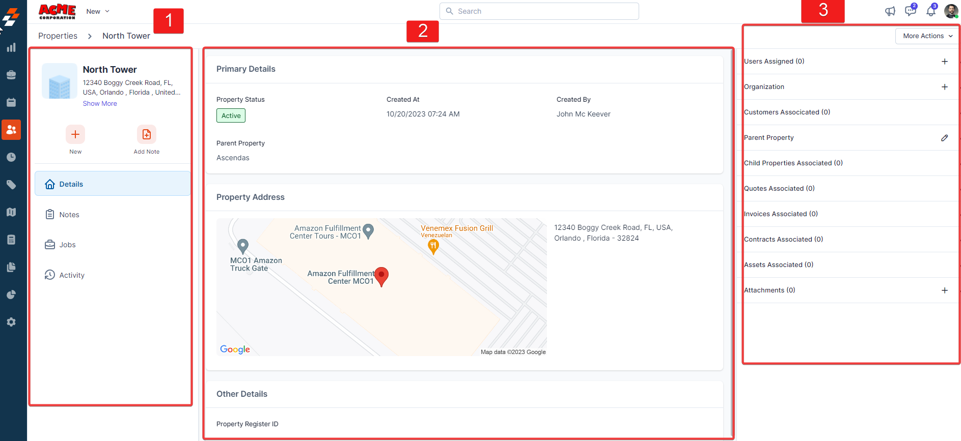 Below the quick actions bar, you can find the property details, notes, jobs, and activity.