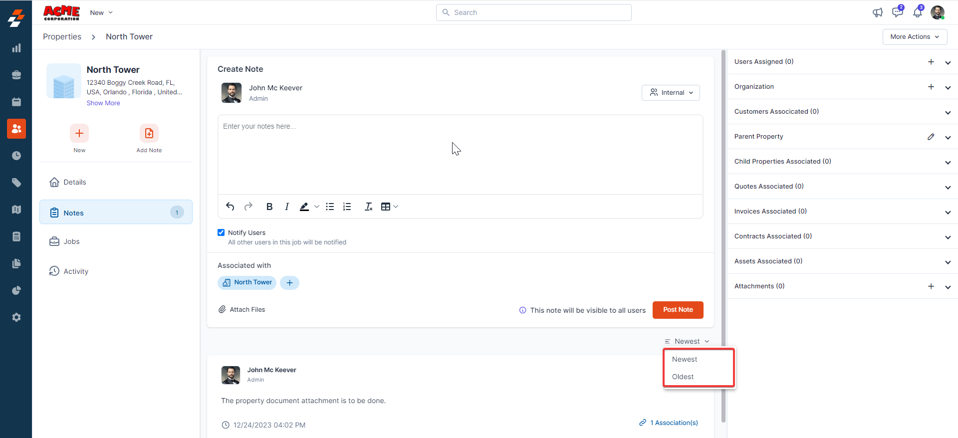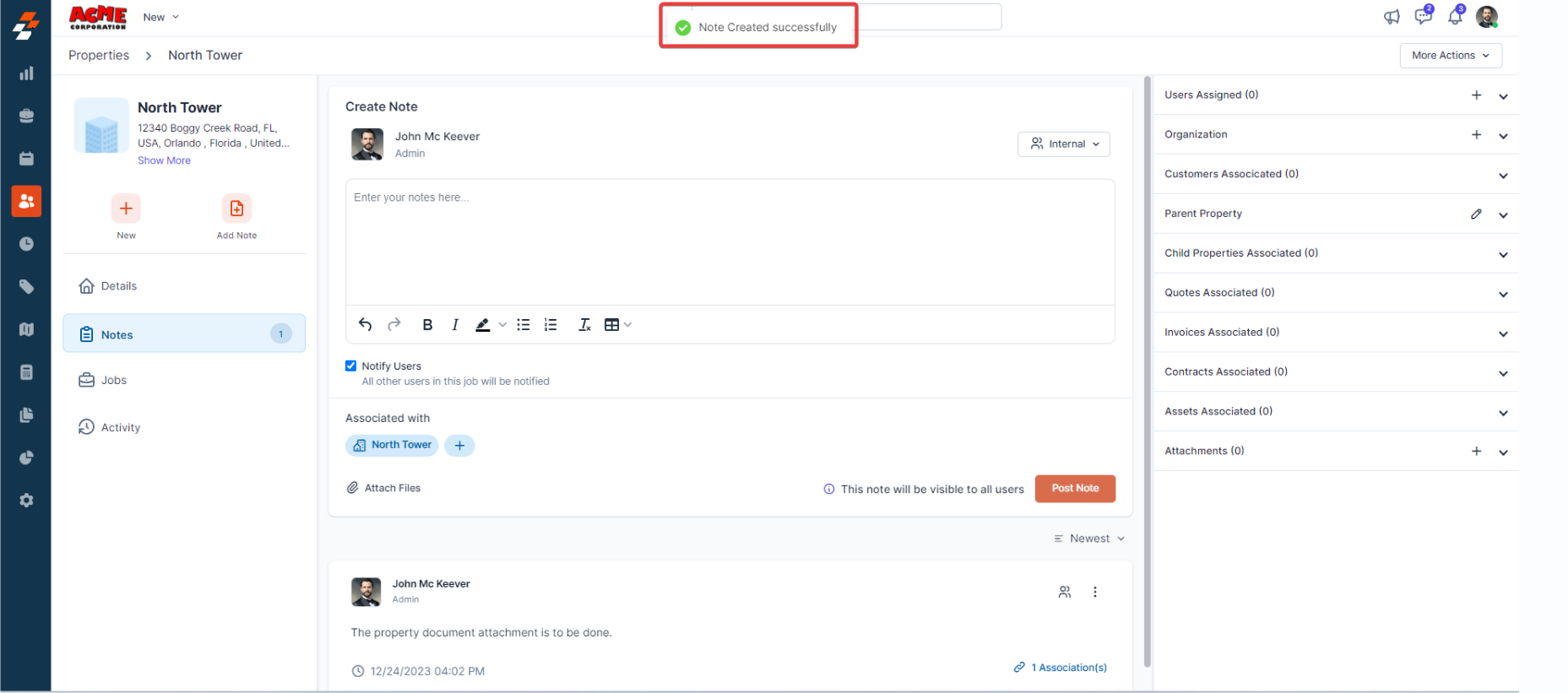 Property Notes are comments or information that are added to an properties module over its course. These notes add more context to the Property. Your notes can be anything ranging from a simple text reminder to an image of the item service and video or document. All added notes can be viewed under the Notes Section in the left pane of the Property Details Page.