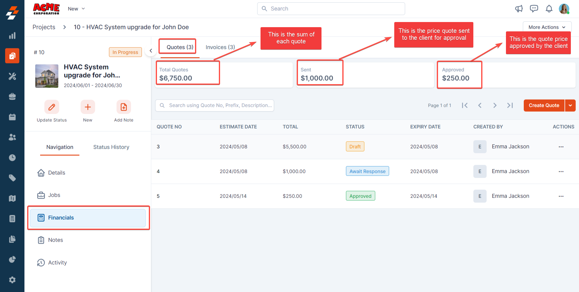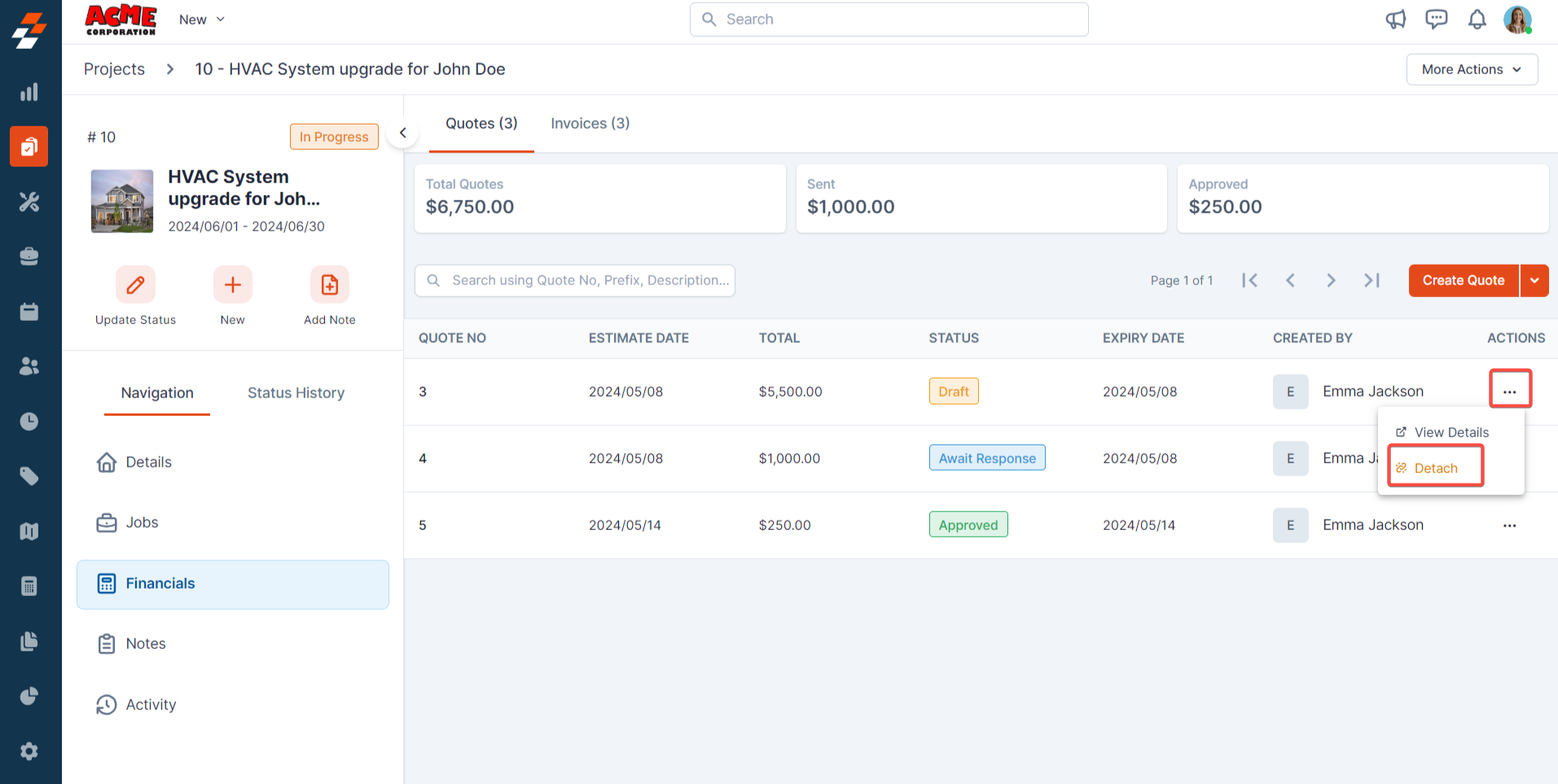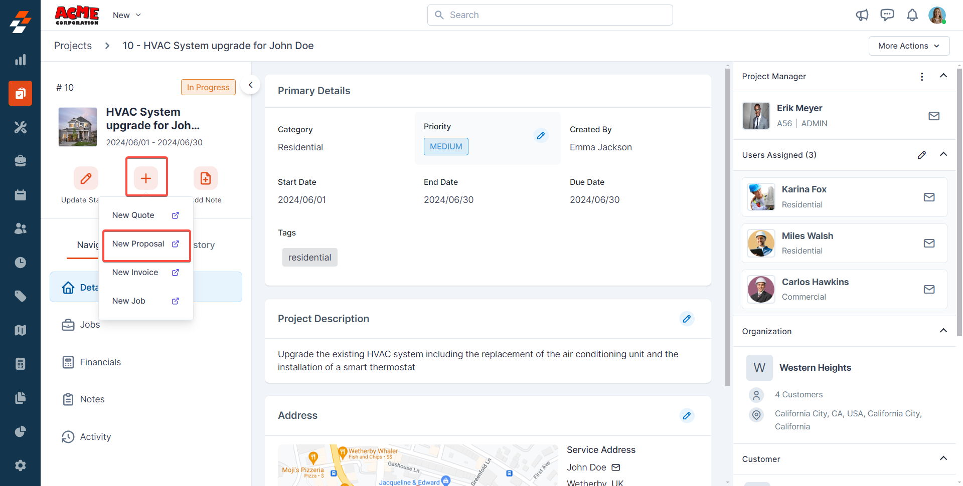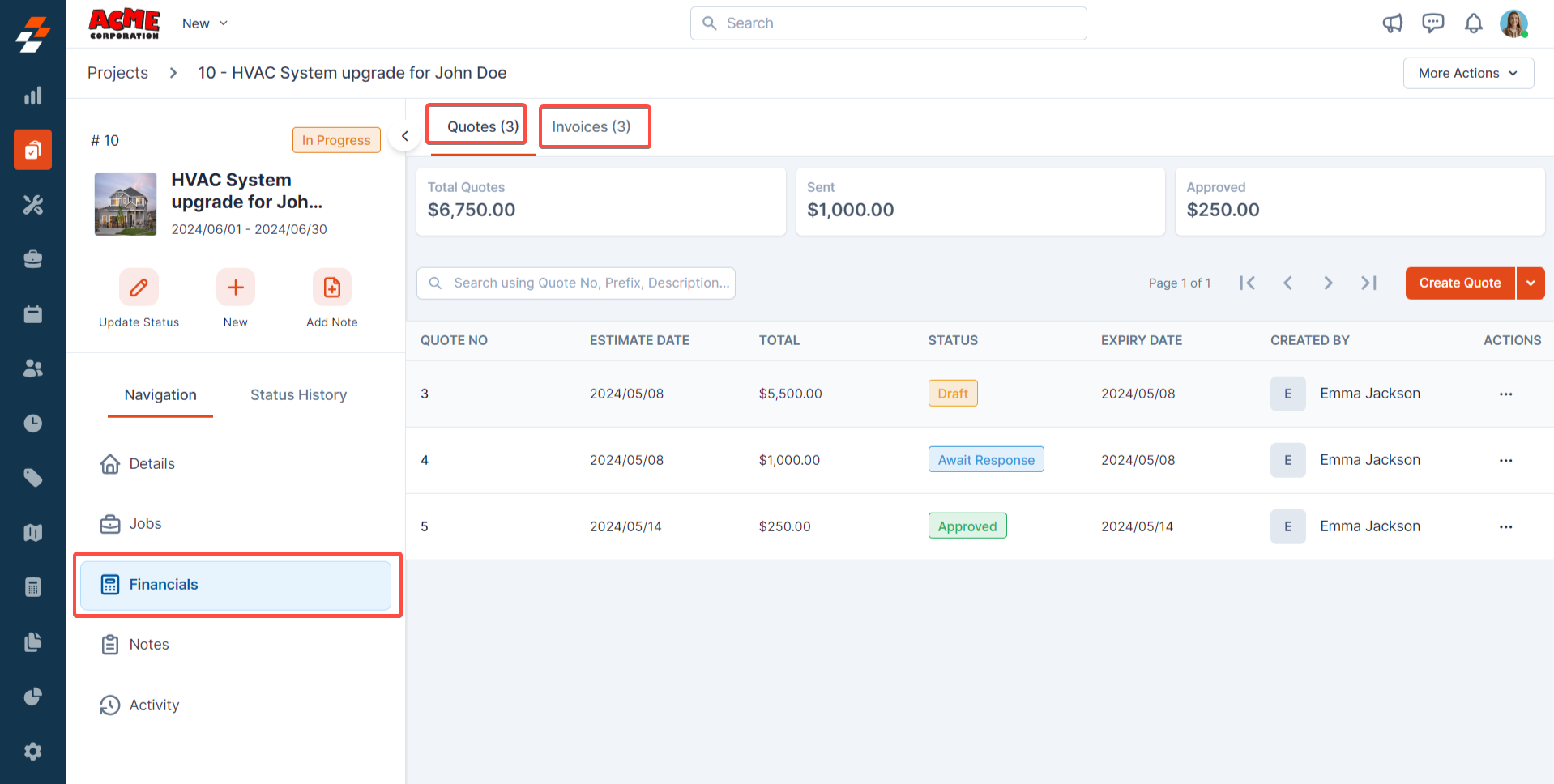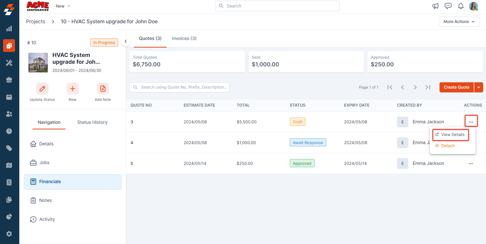 The quick actions bar lets you quickly update the project status, schedule a project, and add a new quote, proposal, invoice, job, and notes.