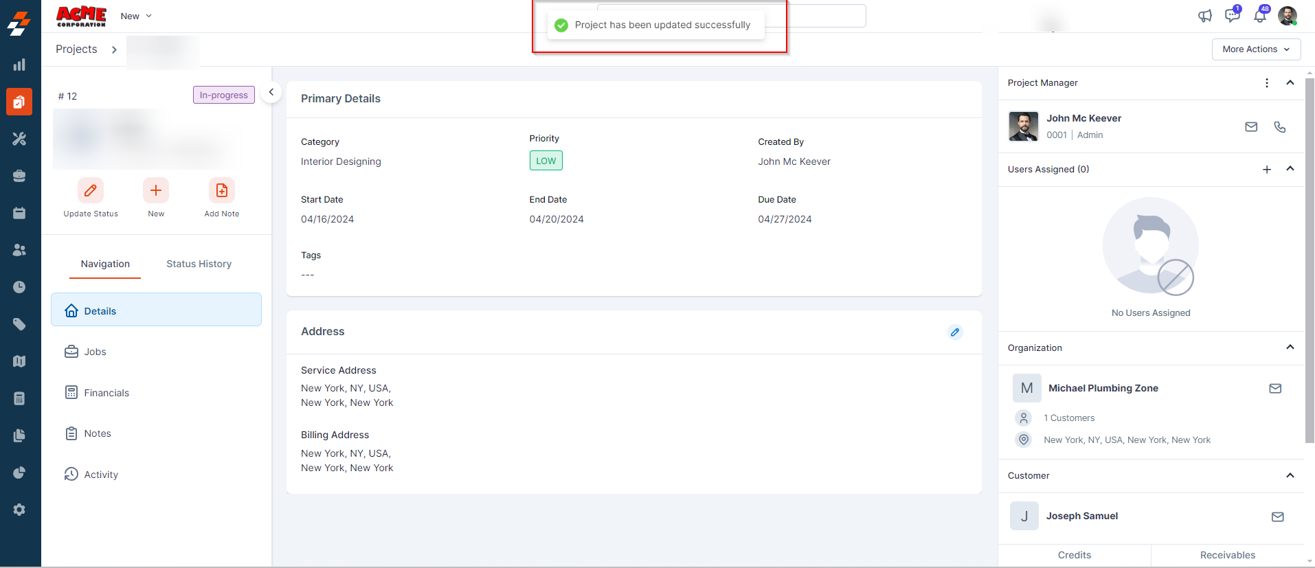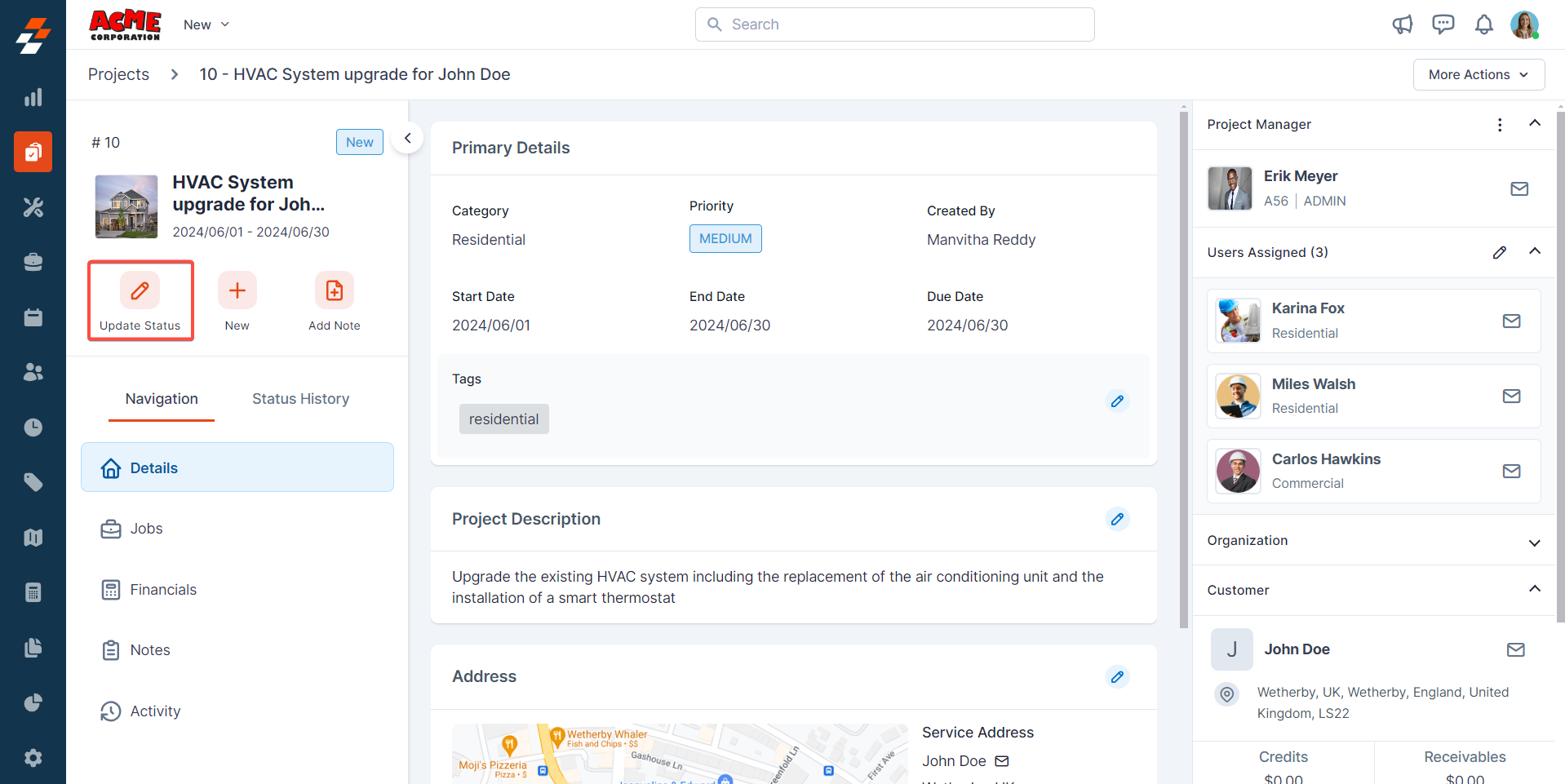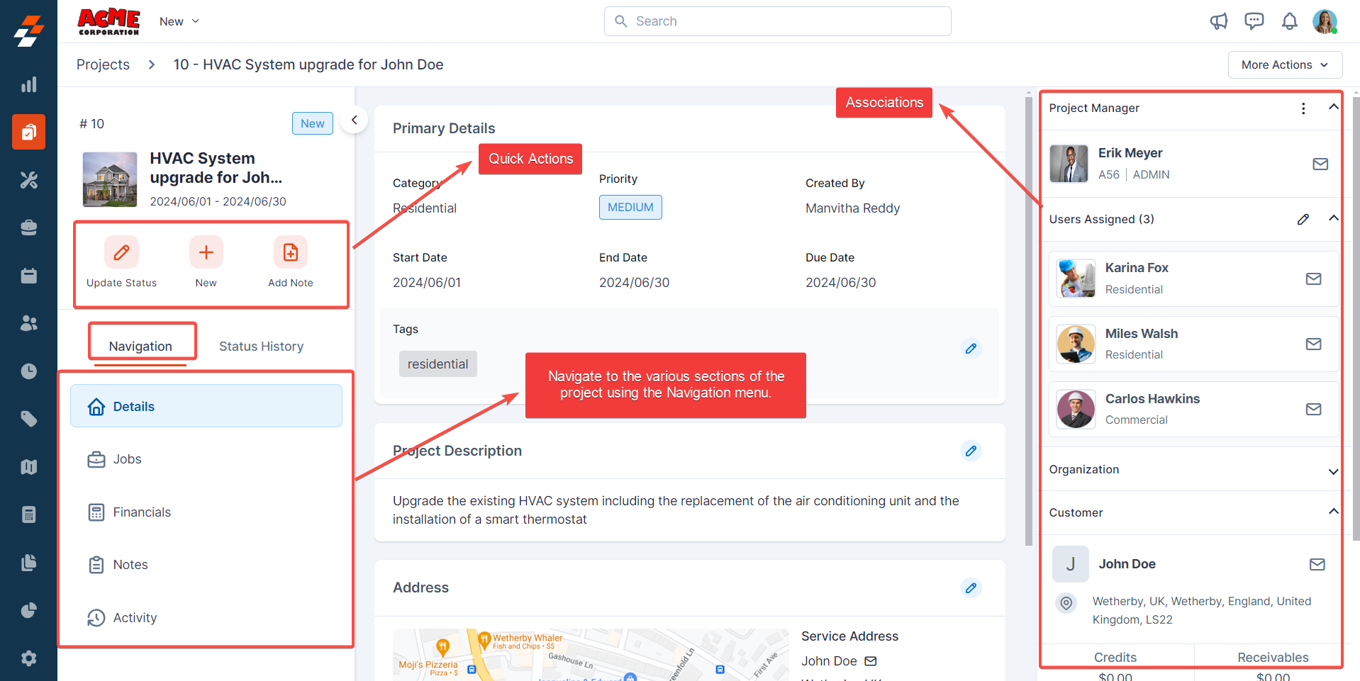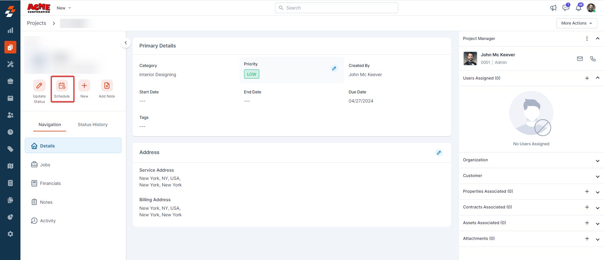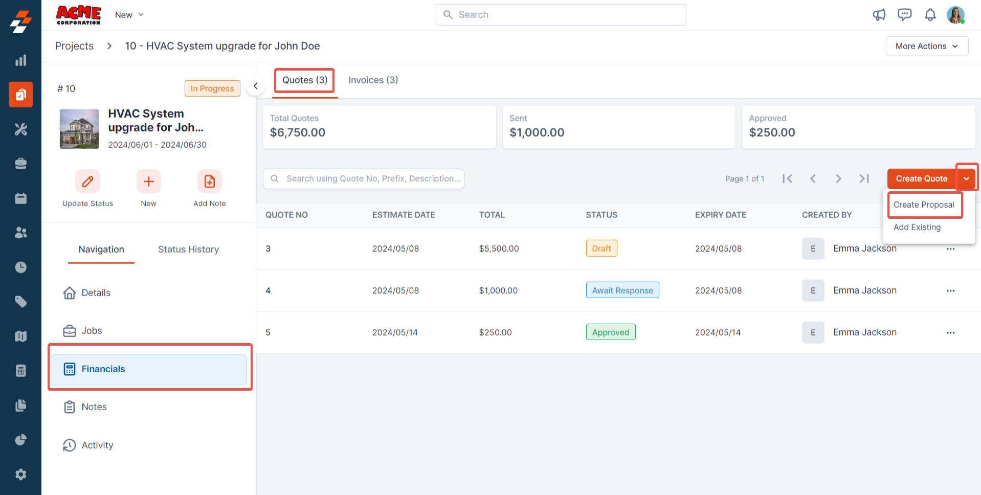 The quick actions bar lets you quickly update the project status, schedule a project, and add a new quote, proposal, invoice, job, and notes.
