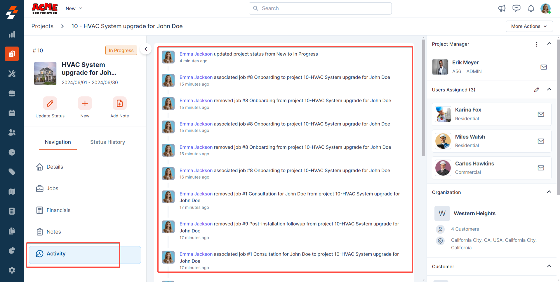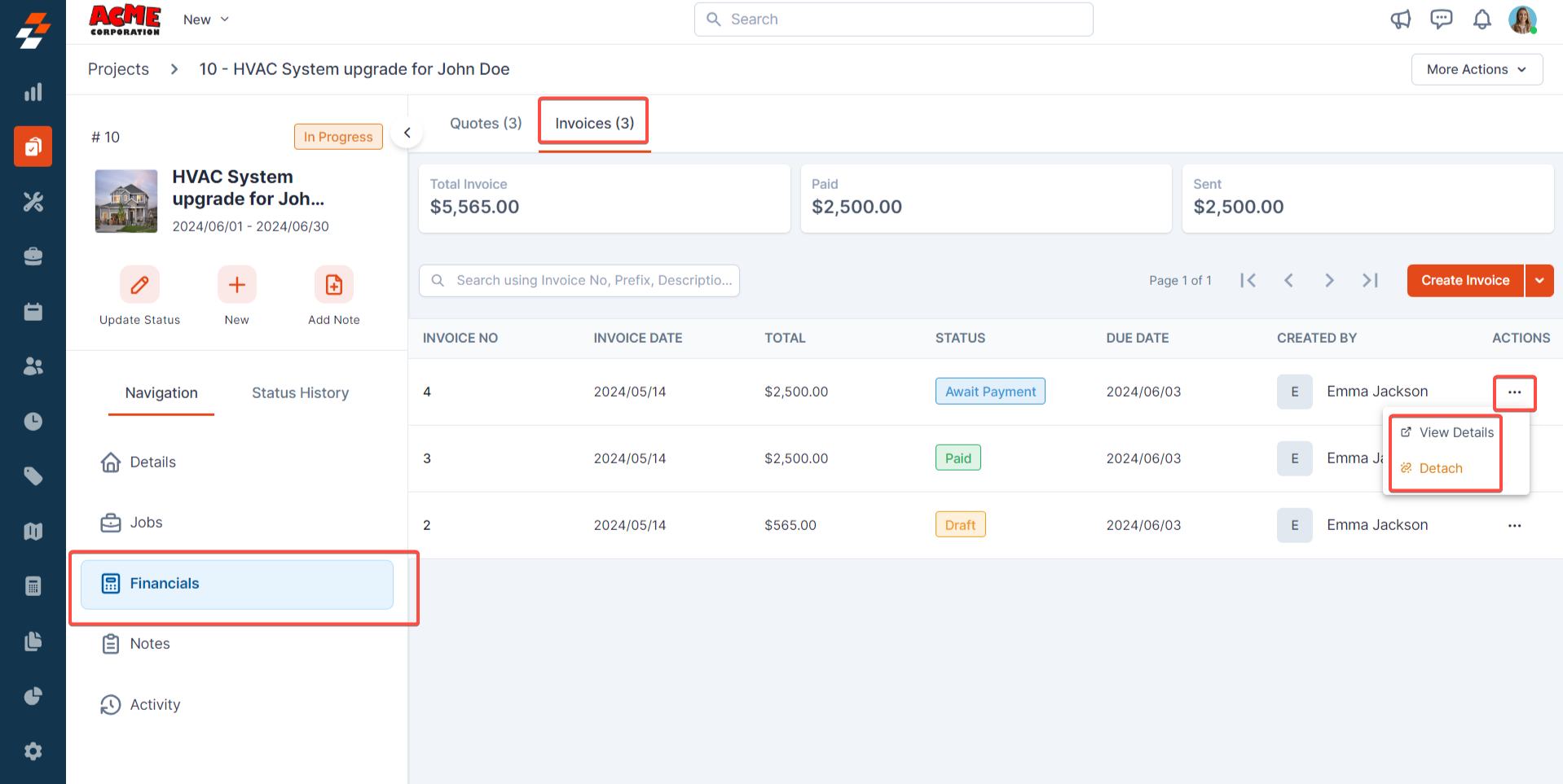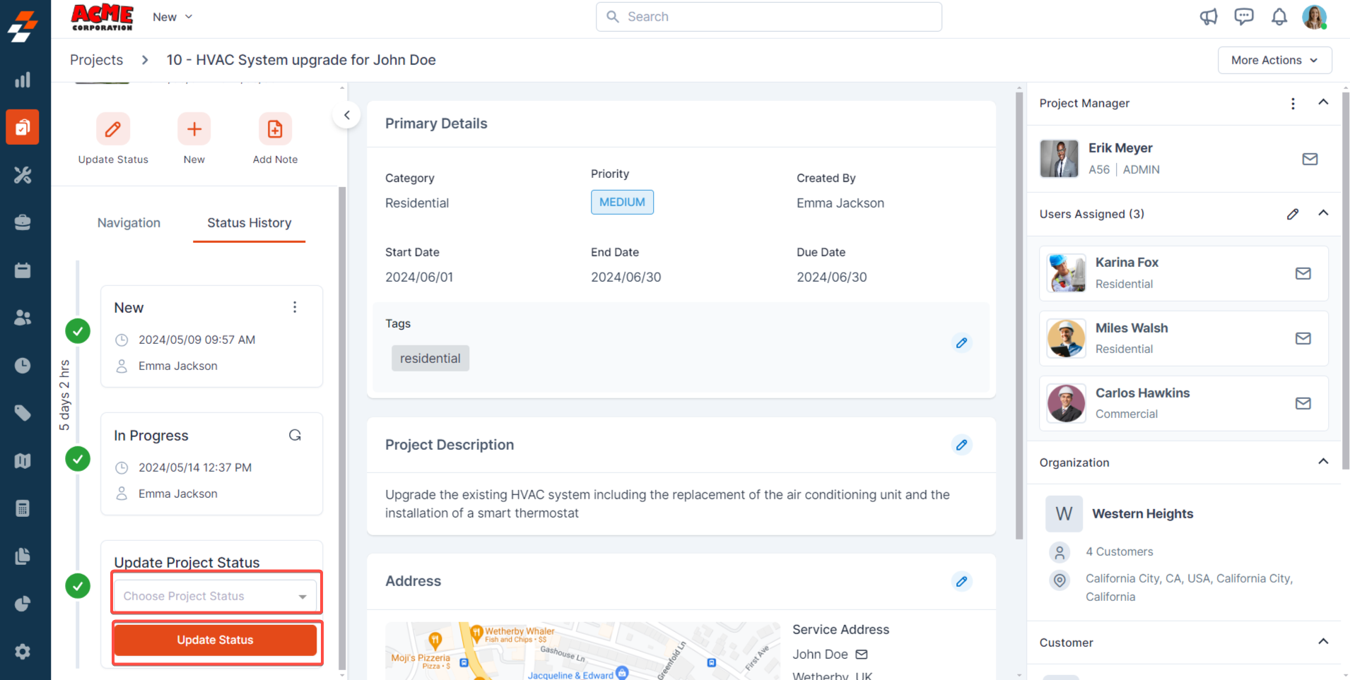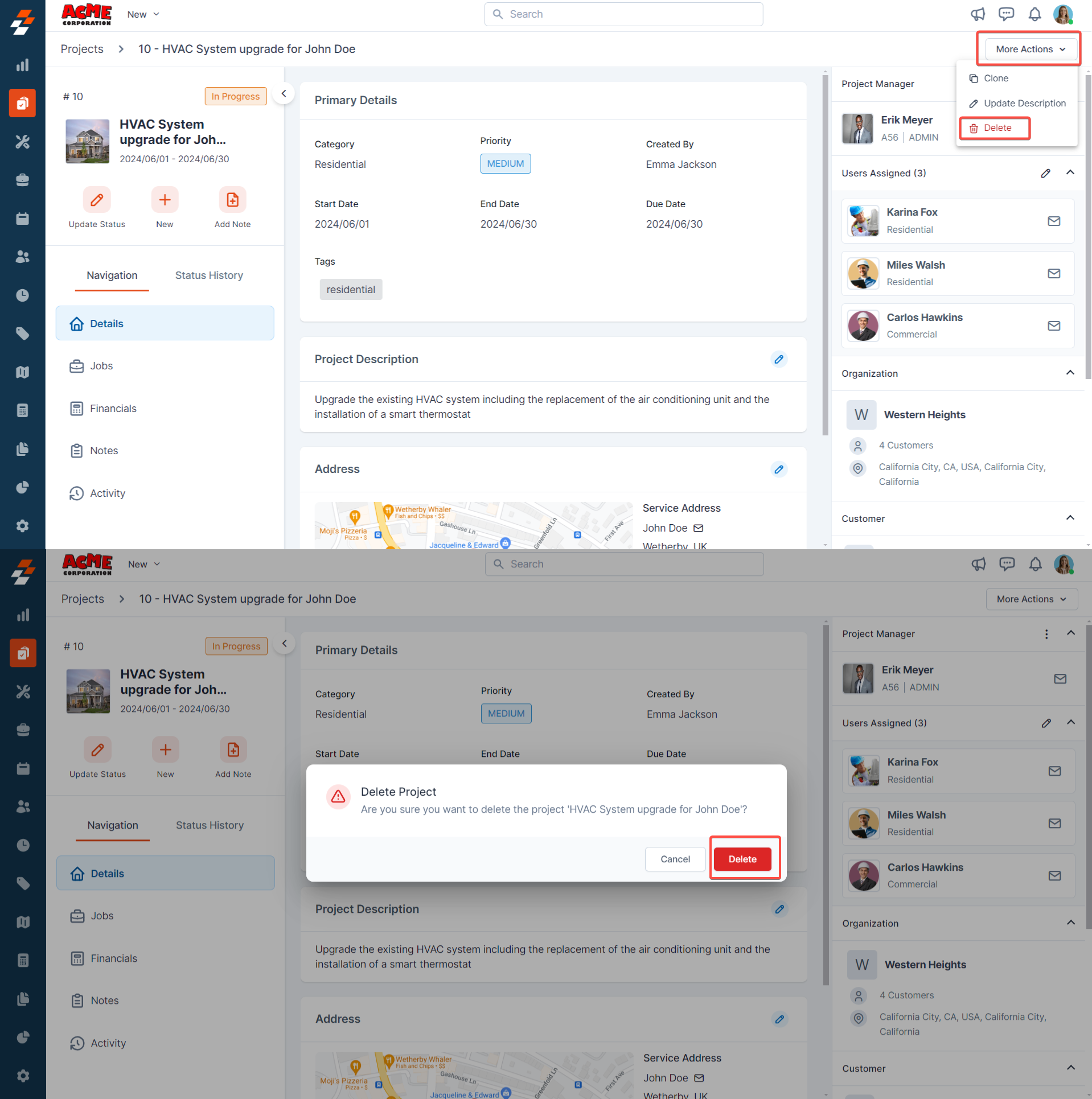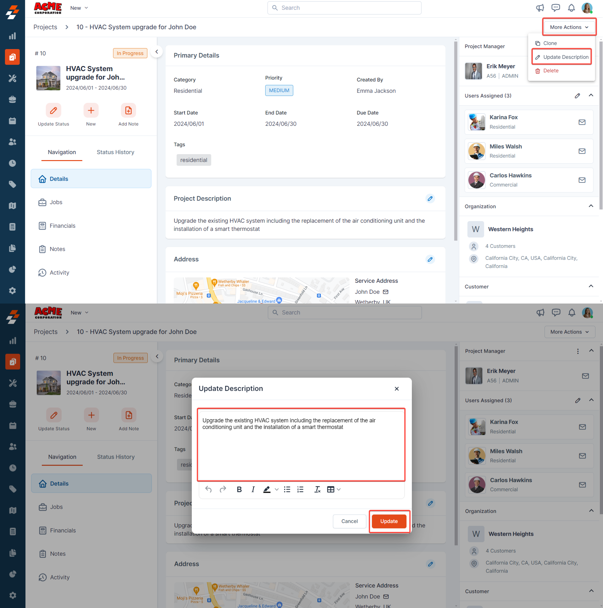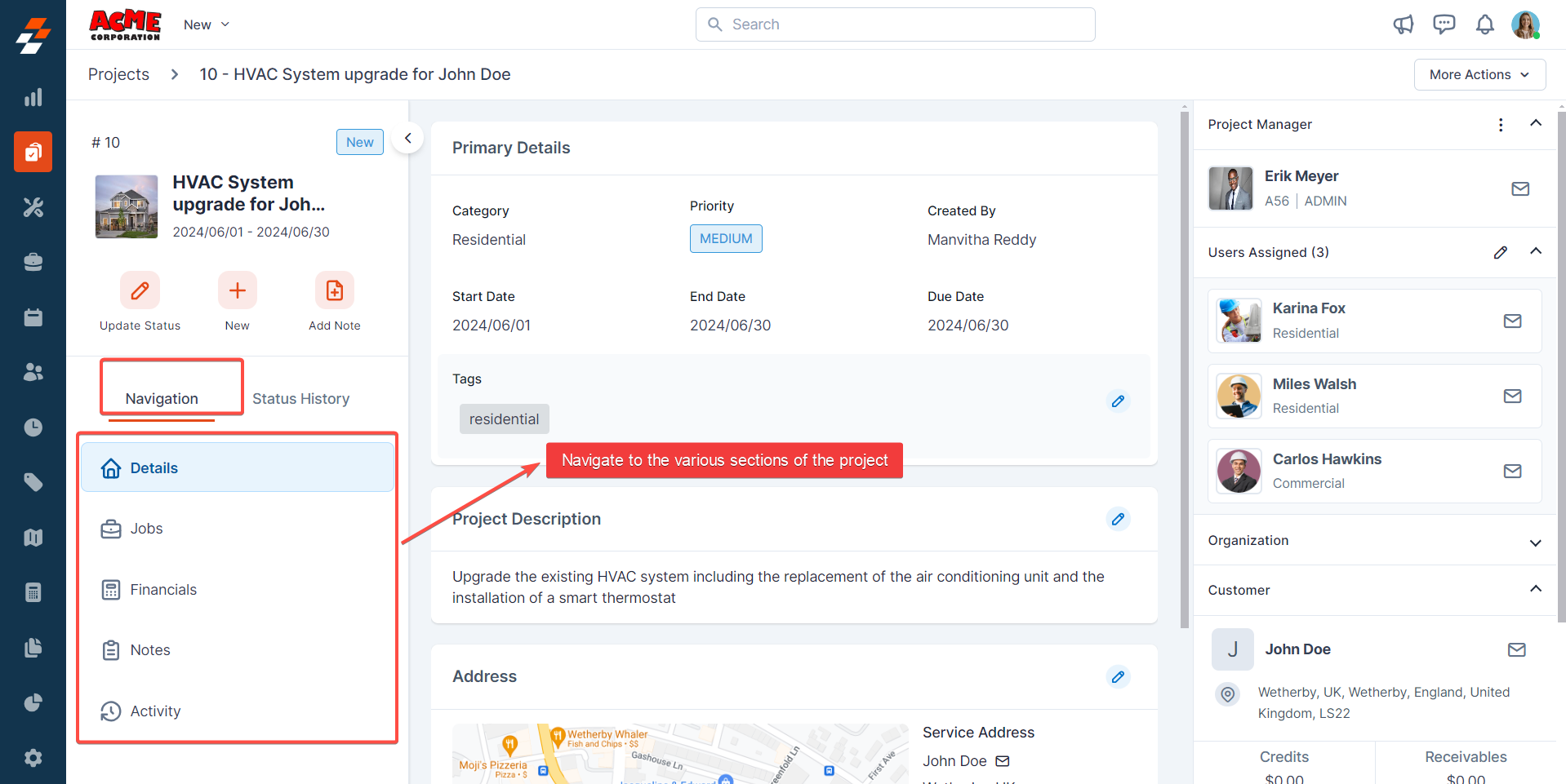 The quick actions bar lets you quickly update the project status, schedule a project, and add a new quote, proposal, invoice, job, and notes.