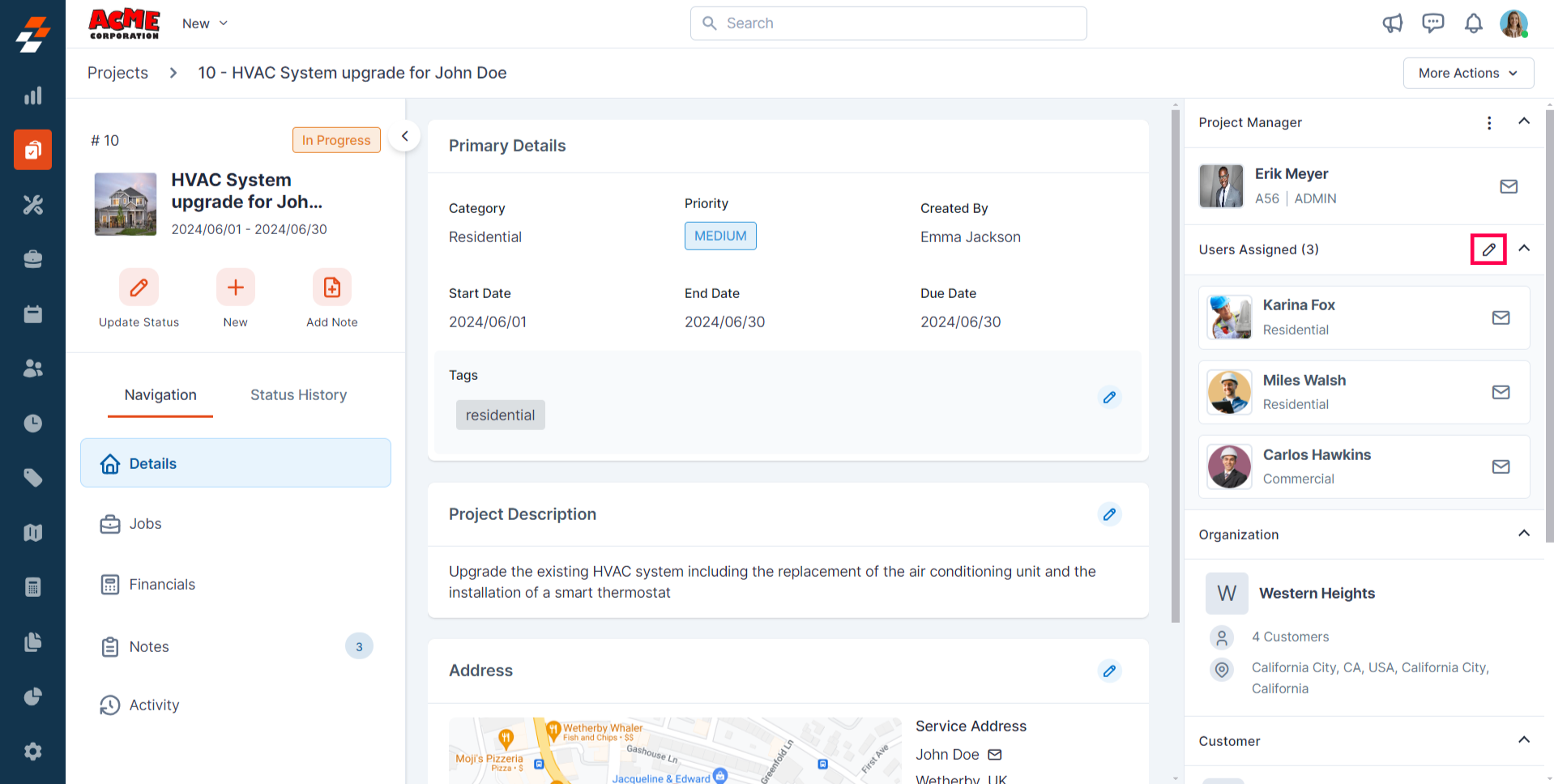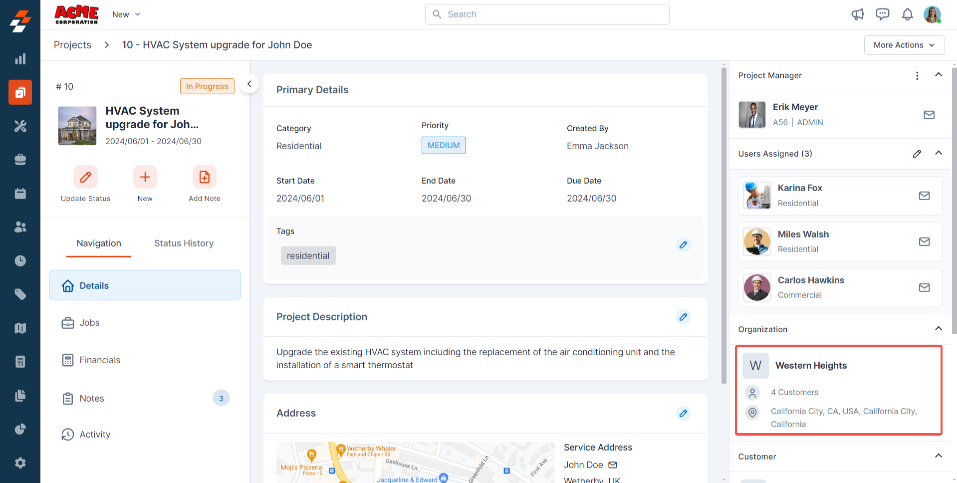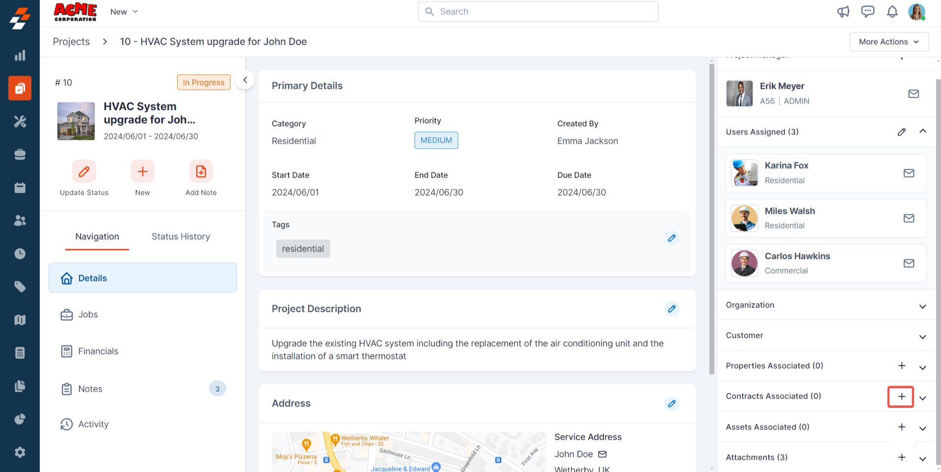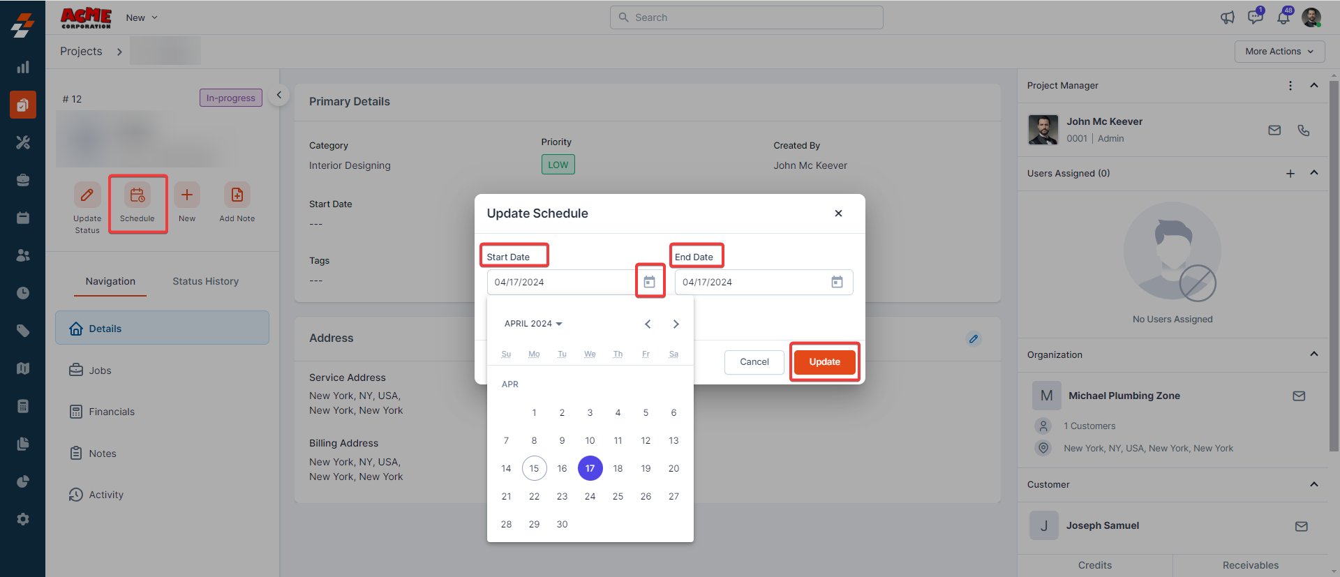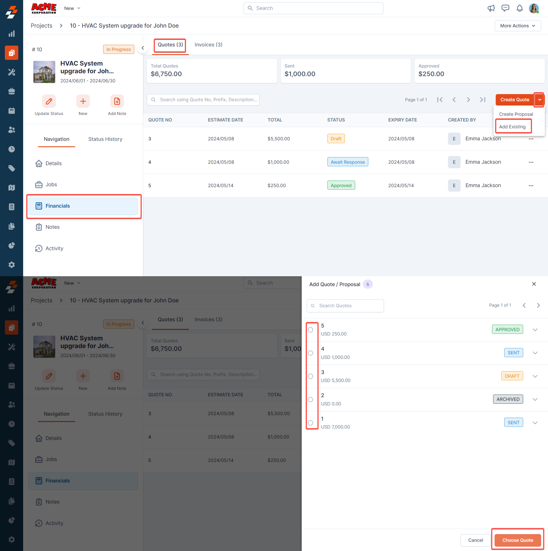 The quick actions bar lets you quickly update the project status, schedule a project, and add a new quote, proposal, invoice, job, and notes.