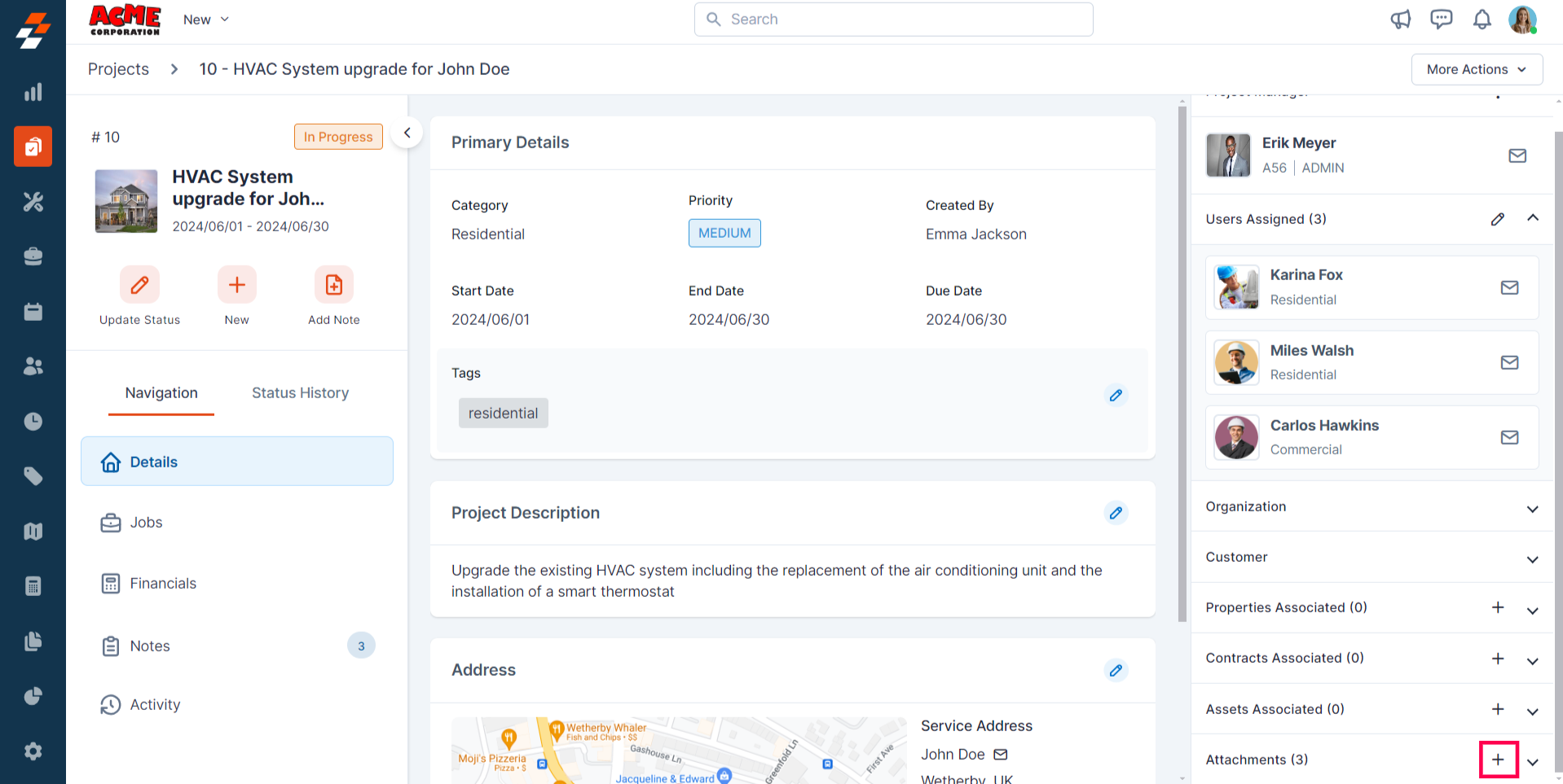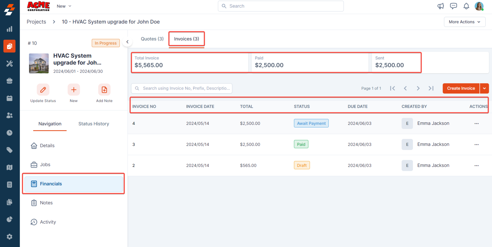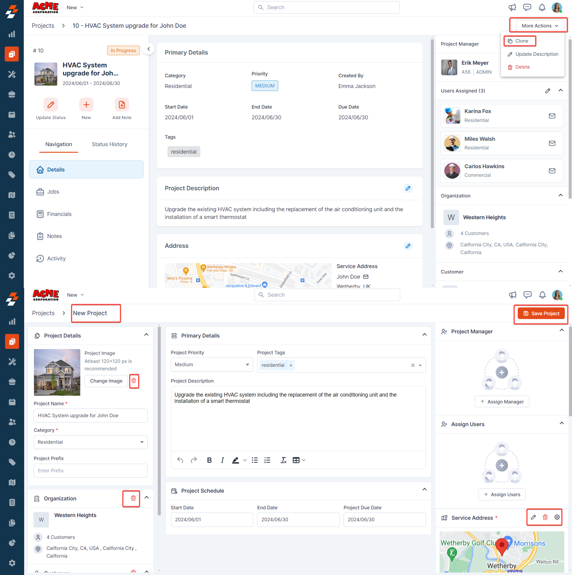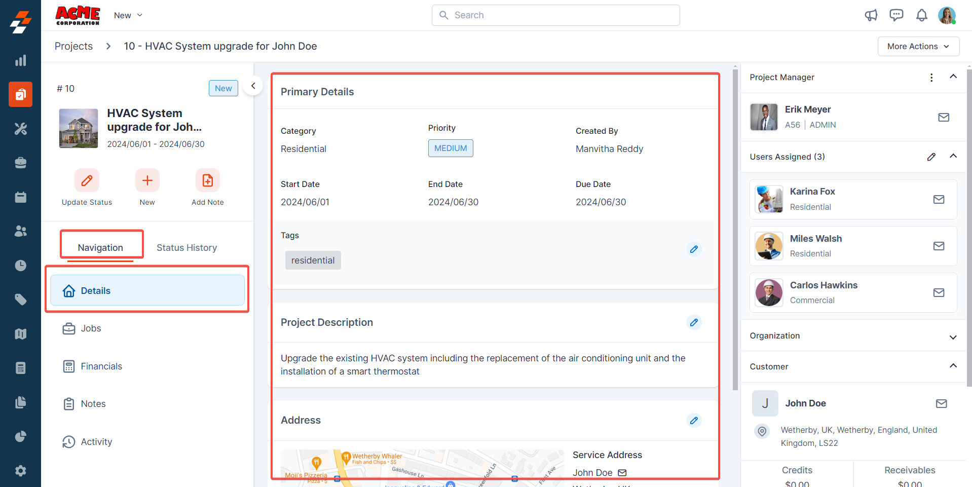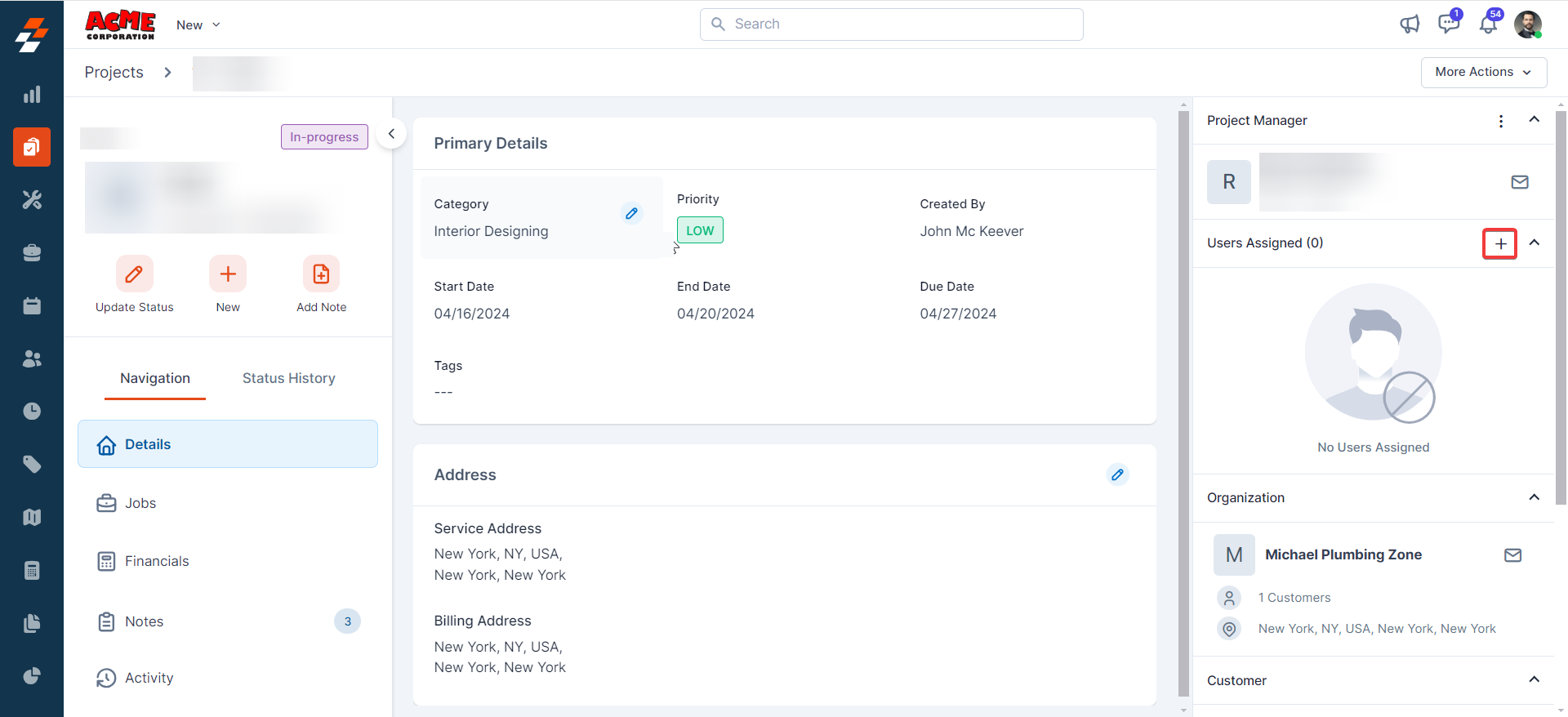 The quick actions bar lets you quickly update the project status, schedule a project, and add a new quote, proposal, invoice, job, and notes.