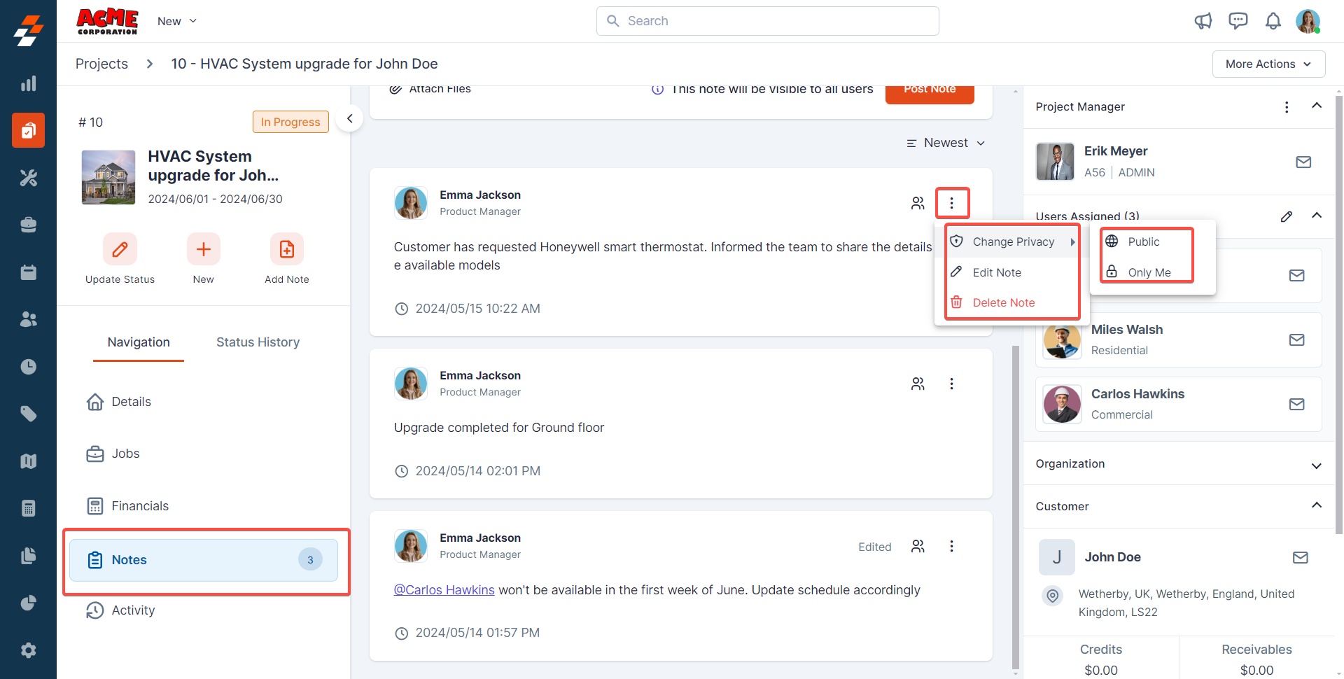 5. Upon posting the notes successfully, you can edit/delete or change the privacy settings from Internal to Public or private and vice versa by clicking the "Kebab" icon next to the note.
