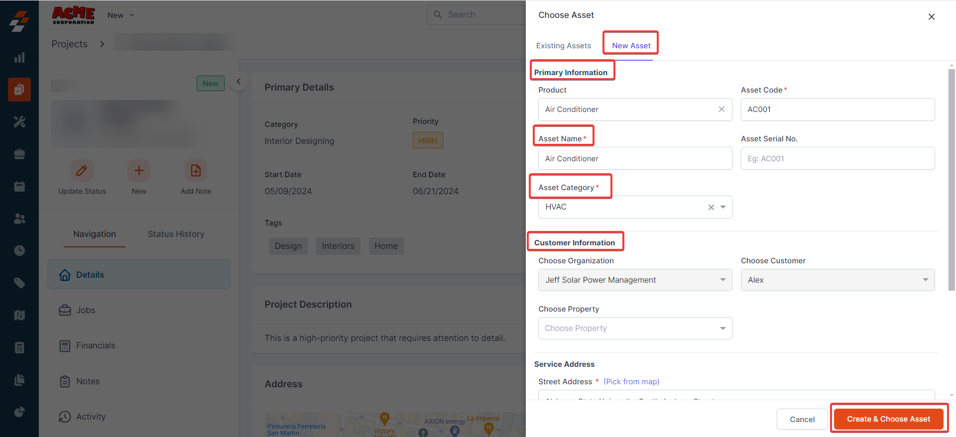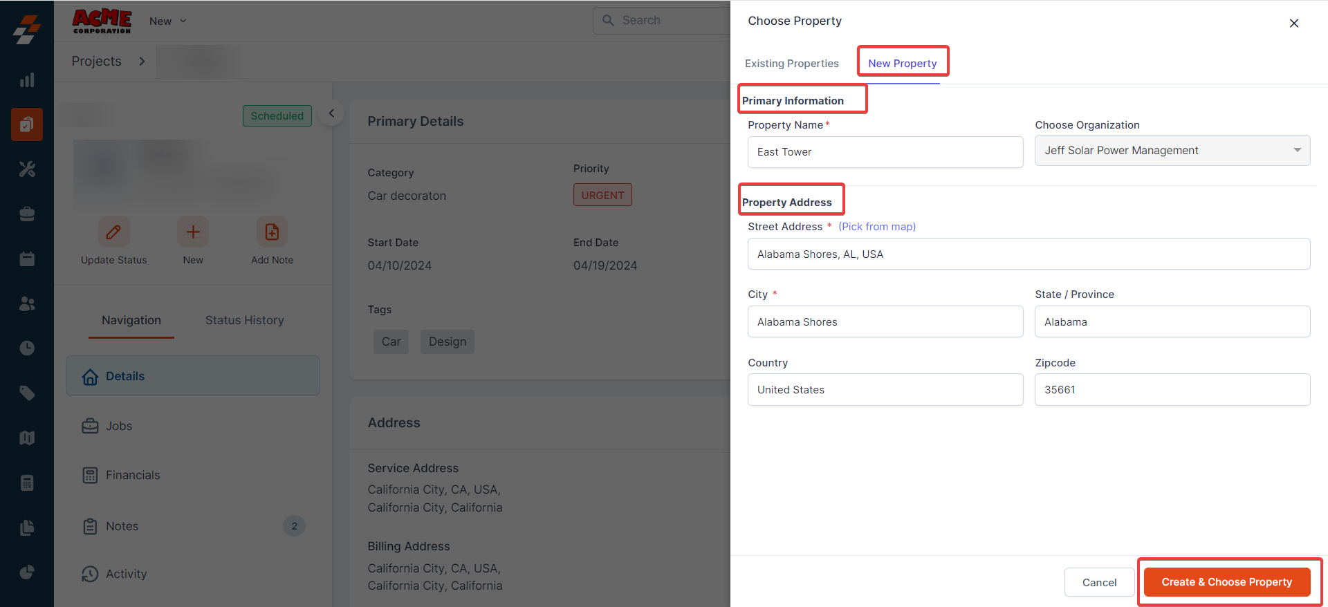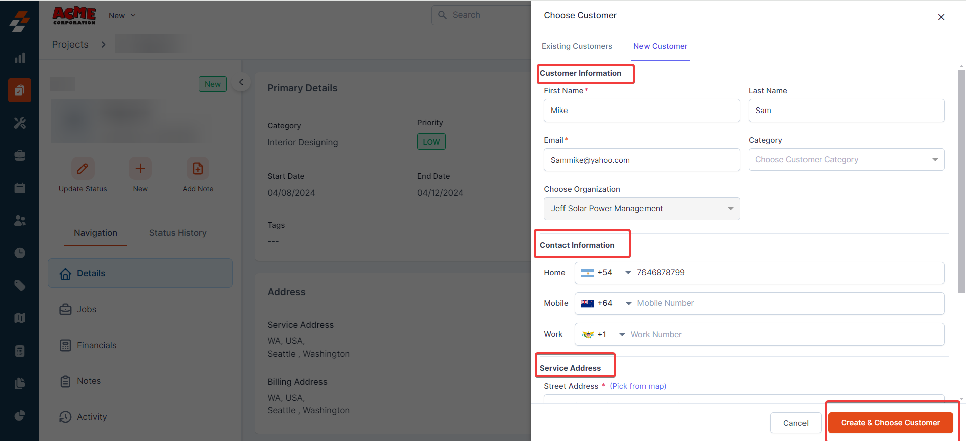 4. Add customer details such as their first name, last name, email, contact information, service address, and billing address. Once done, click the "Create & Choose Customer" button. The Customer will be added to the Project successfully.