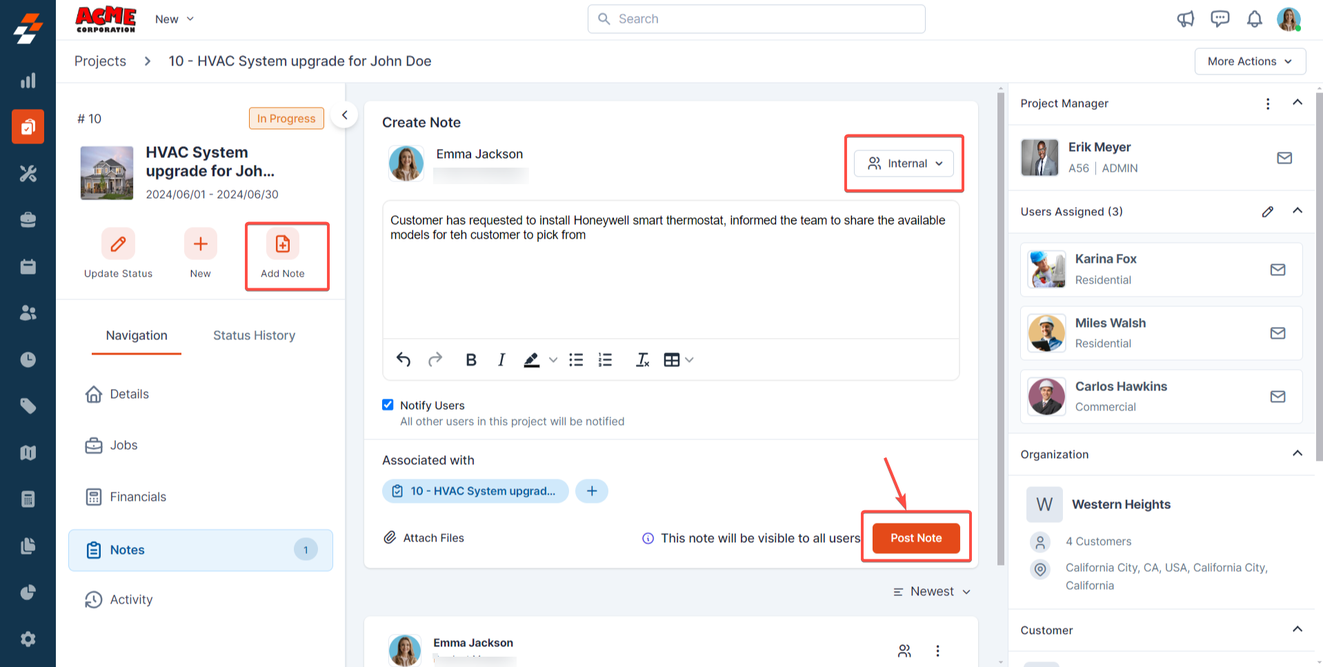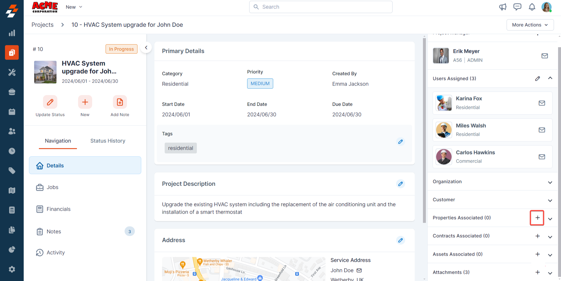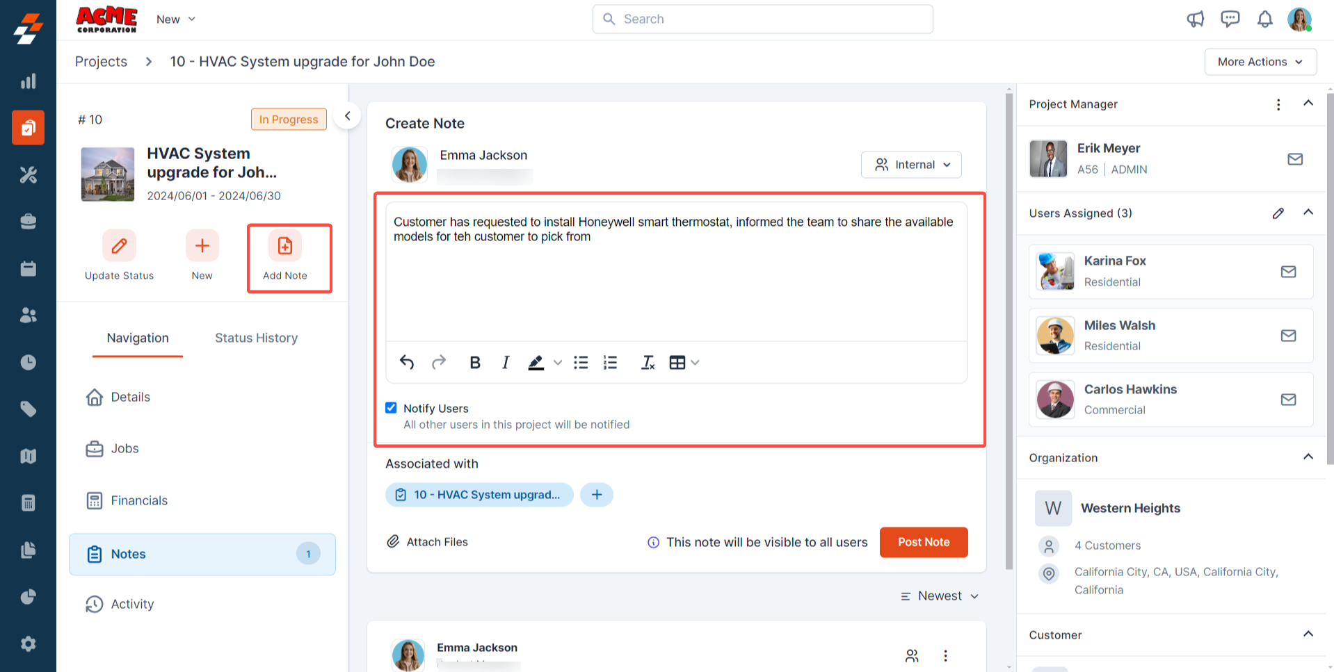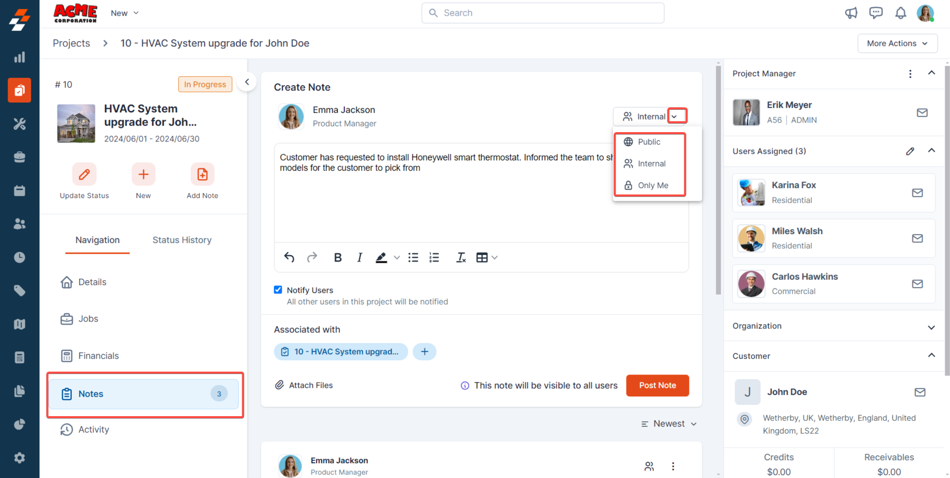 3. By default, the notes will be associated with the Project. You can also associate the notes with other modules such as Customer, Property, Asset, etc.