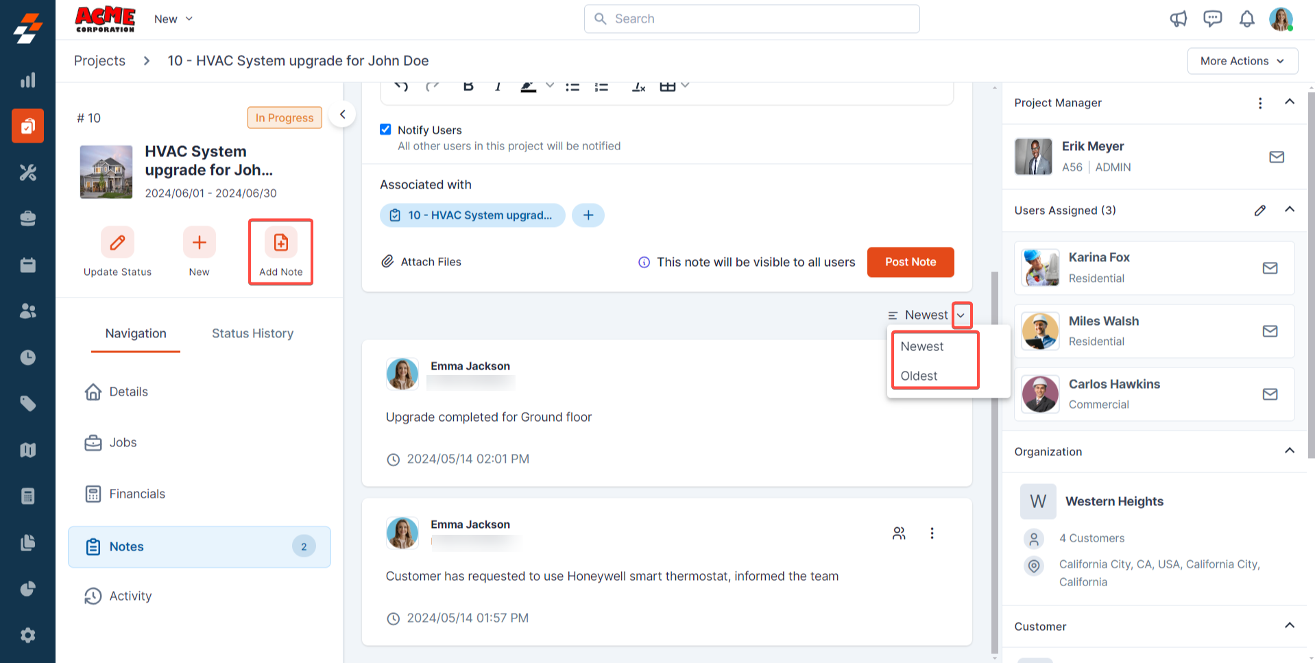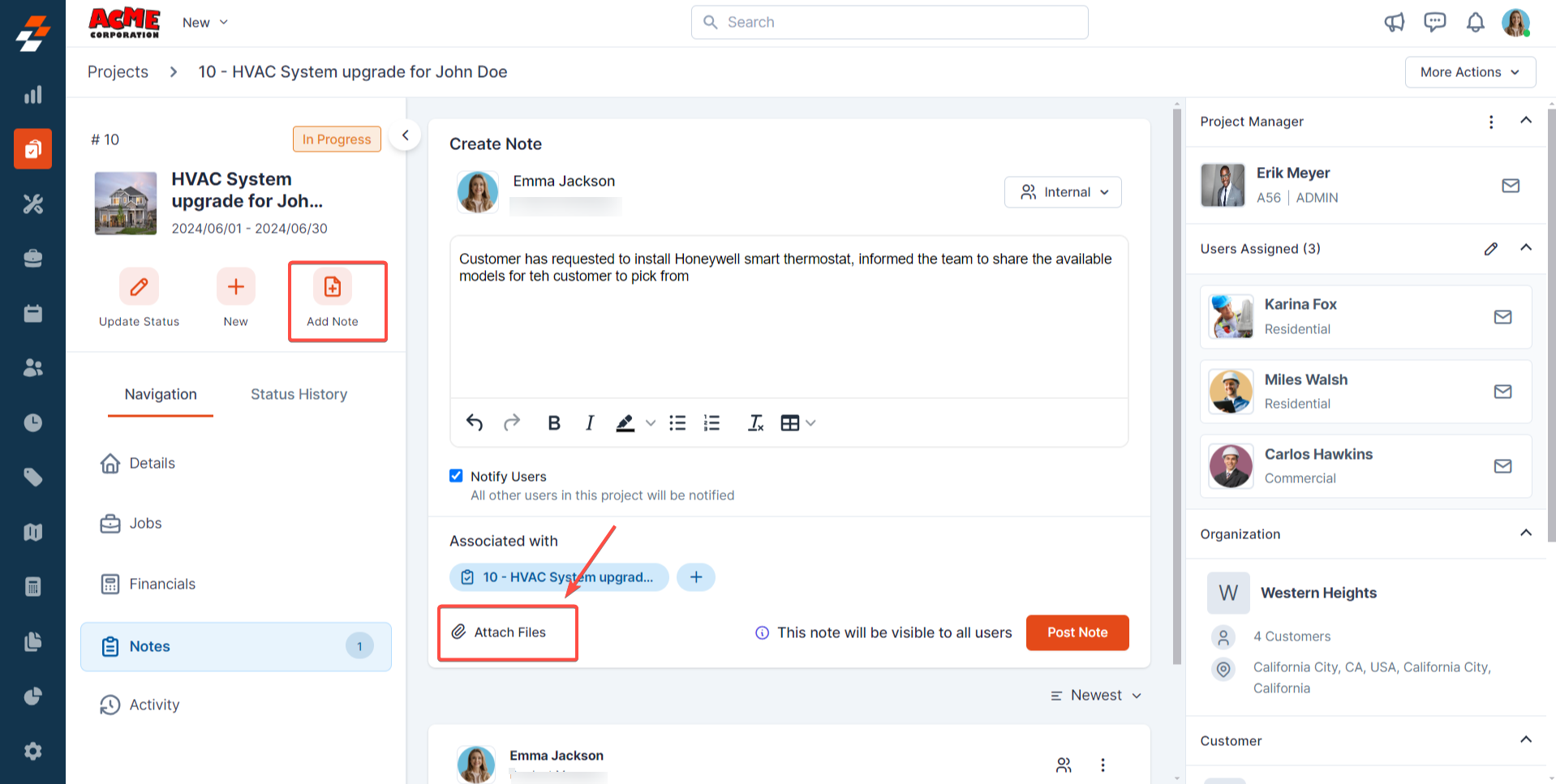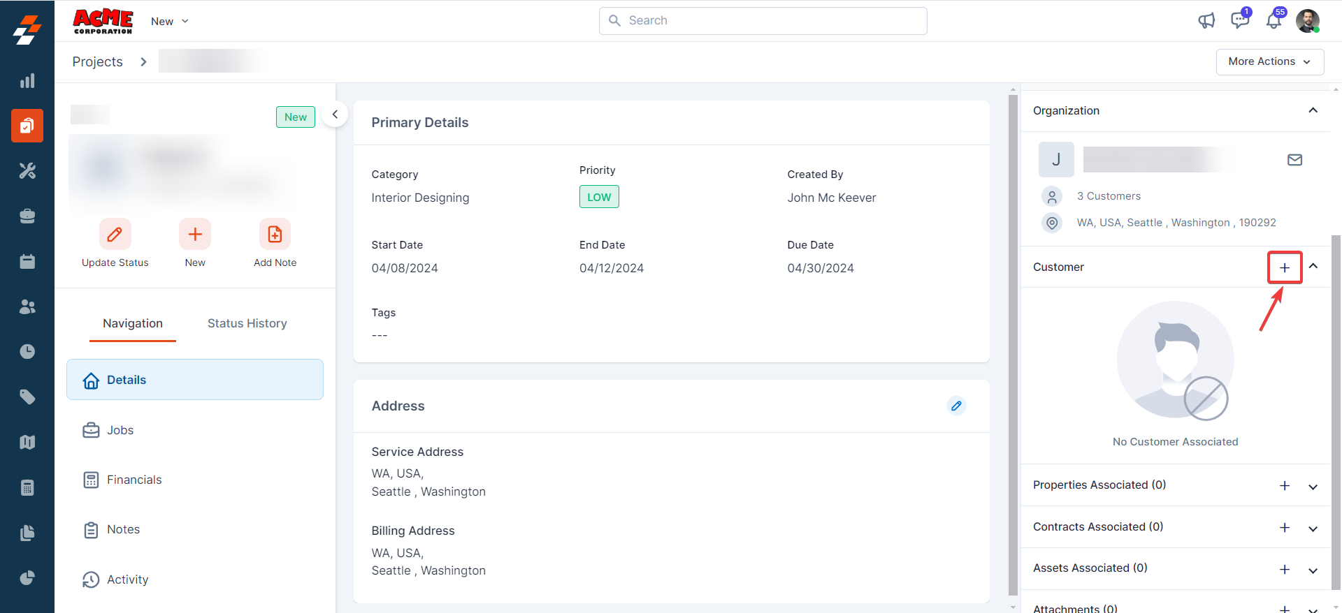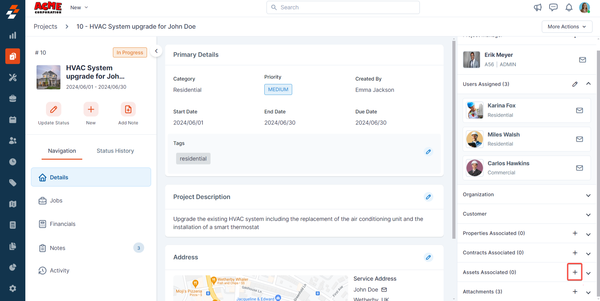 3. By default, the notes will be associated with the Project. You can also associate the notes with other modules such as Customer, Property, Asset, etc.