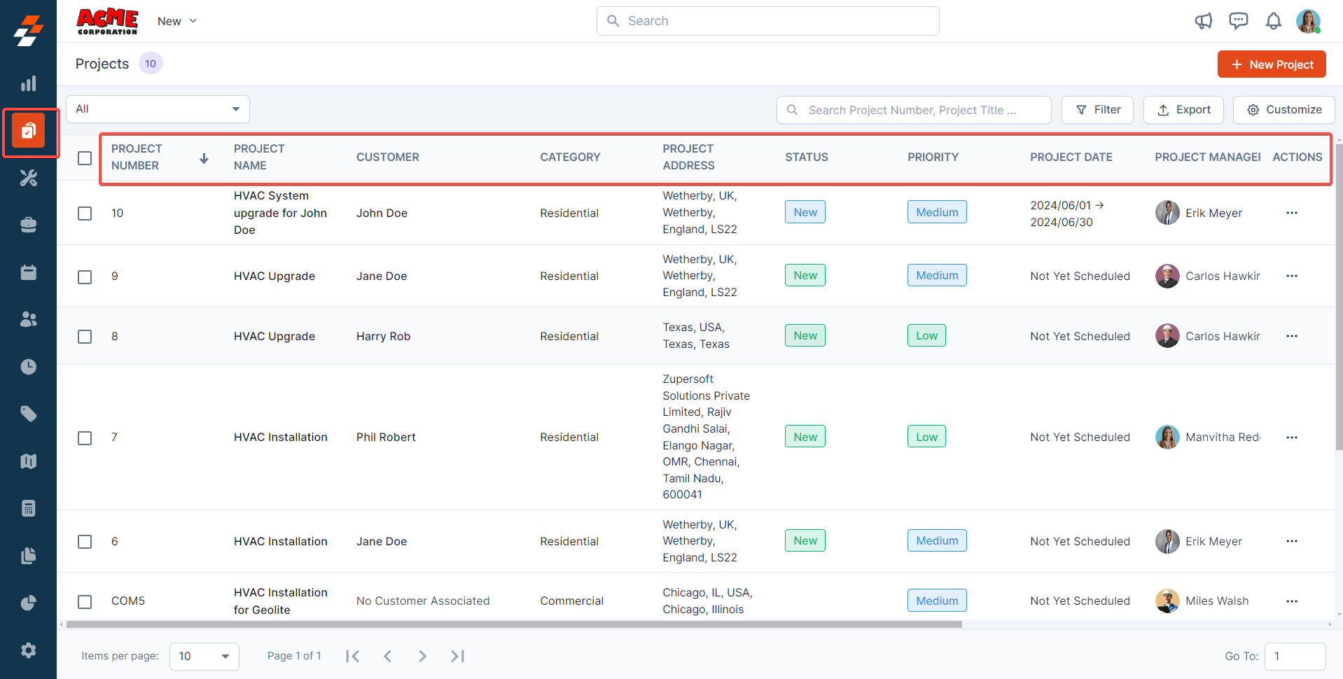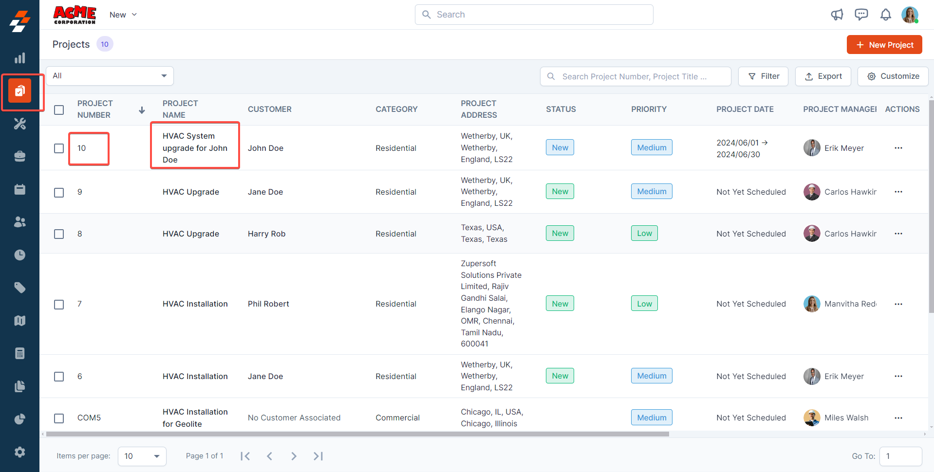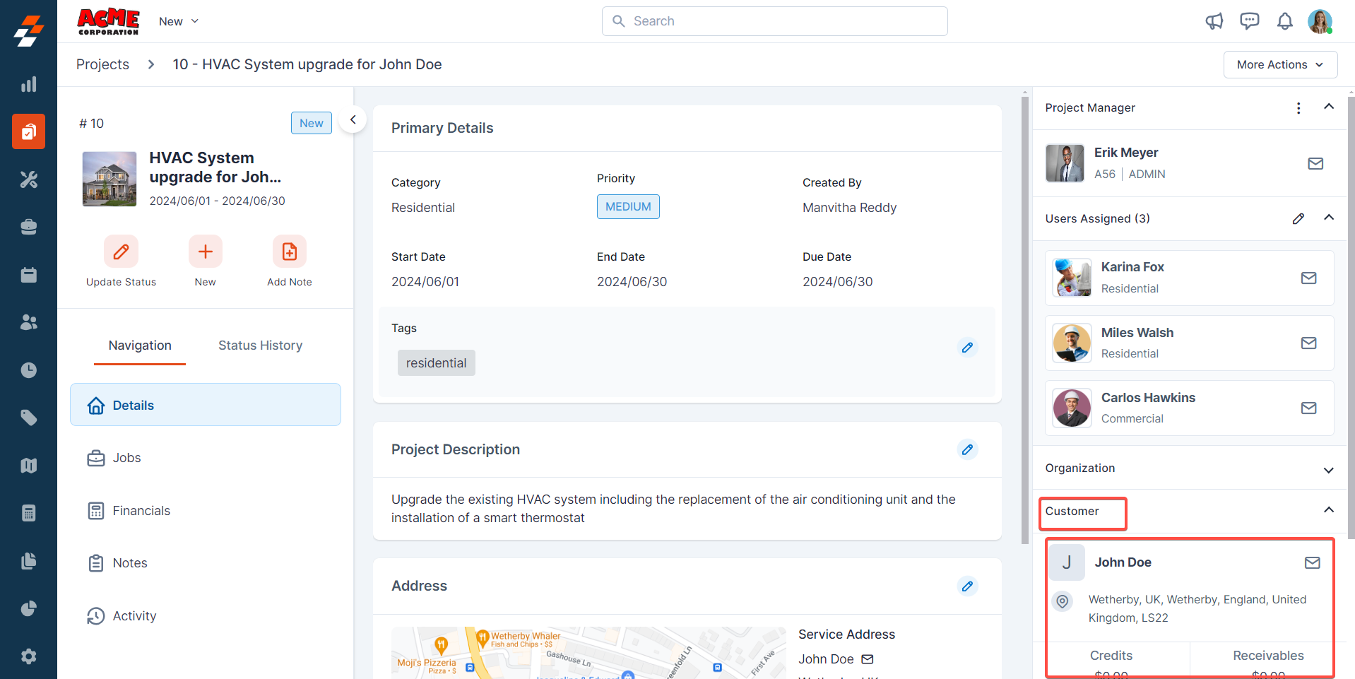 Here, you can view the Customer associated with the Project along with their credits and receivables.