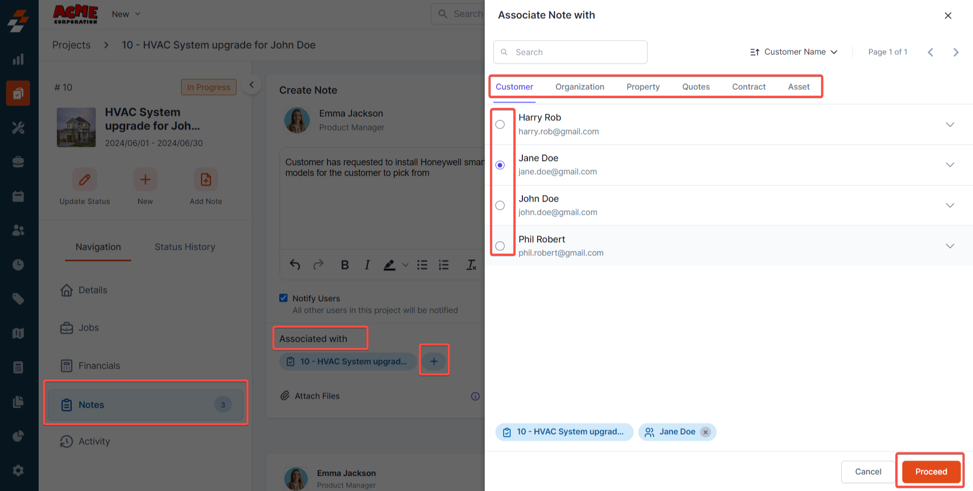 To do so, click the “+” option under "Associated with" and choose the Job, Customer, Organization, and other modules to which the notes should be associated. Once chosen, click "Proceed" to associate the notes with the selected module.