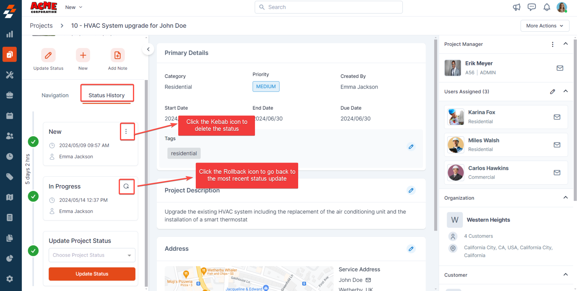 3. You can then view the history of the project status from the “Status History” tab. From here, you can delete a status by clicking the "kebab" icon or roll back the most recent status update using the Rollback icon next to the status name.