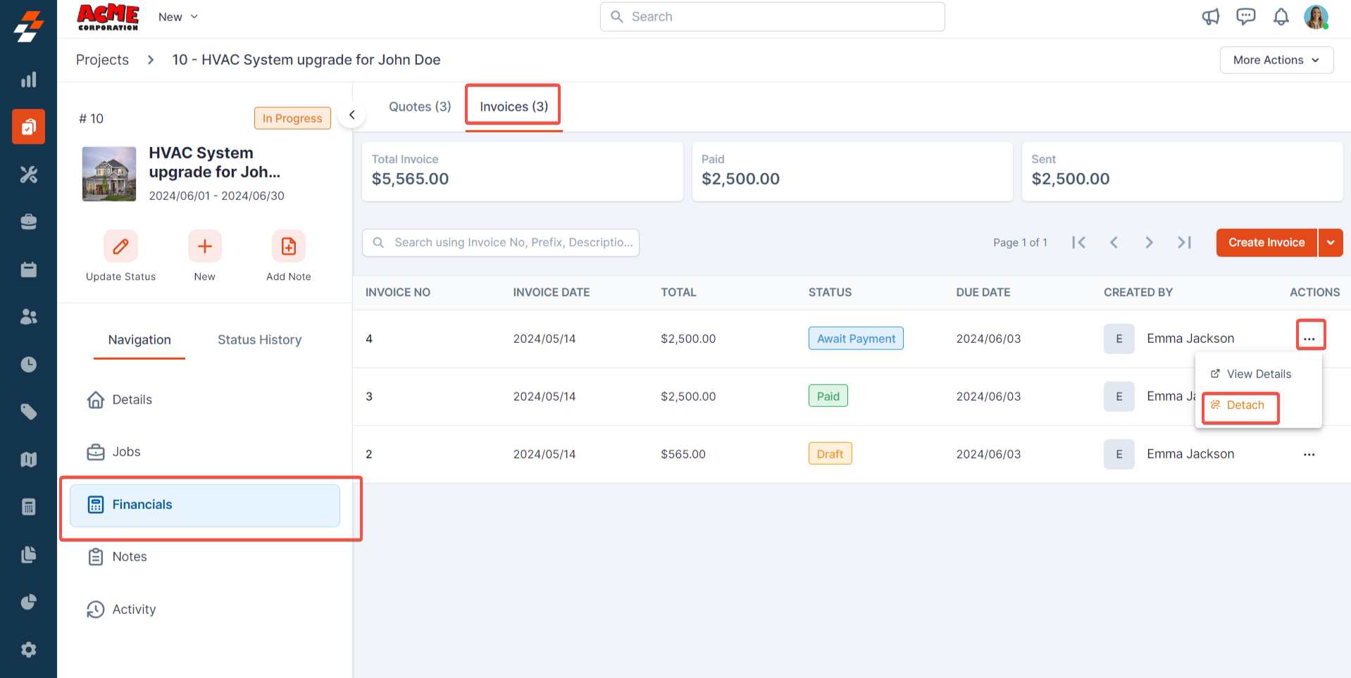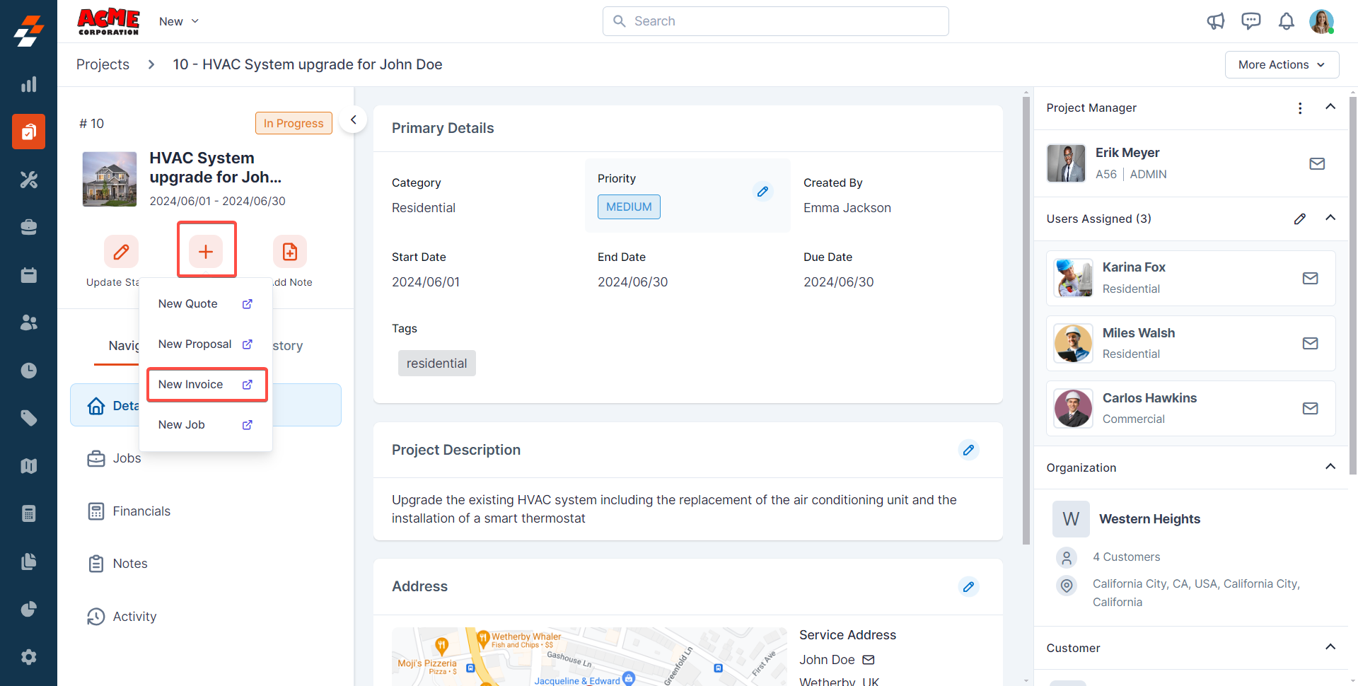 The "+ New" icon allows you to quickly create a new quote, proposal, invoice, and job for this project, which will then be associated with the "Financials" and "Jobs" sections of this project.