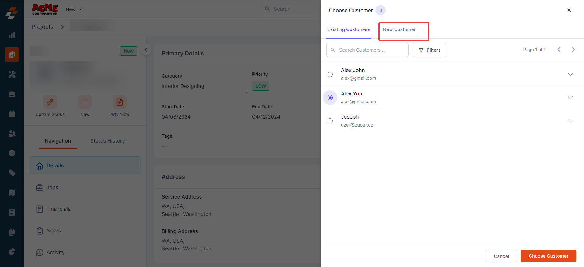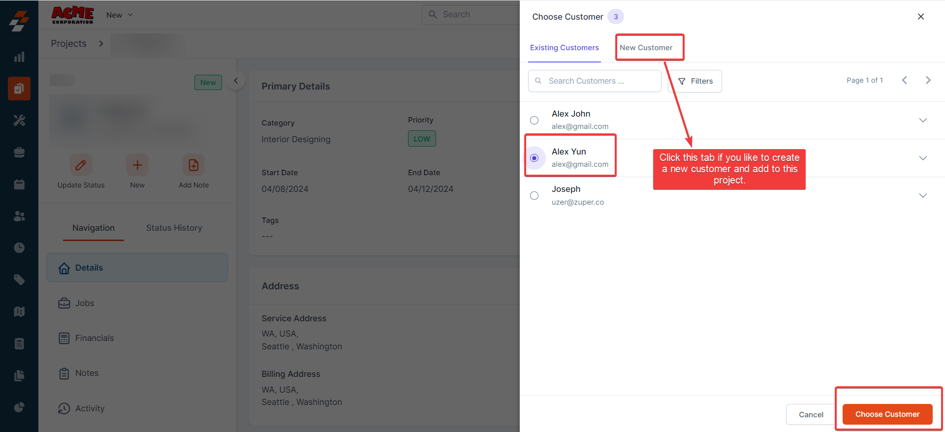2. Choose any of the existing customers associated with the organization from the "Existing Customers" tab. Once chosen, click the "Choose Customer" button. The customer will be added to the project successfully.