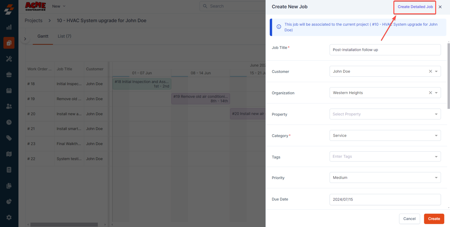 2. If you would like to create a detailed job, including service tasks, parts/services, property, assets, and more, click "Create Detailed Job" at the top right corner of the sidebar. You will be redirected to the new job creation page.