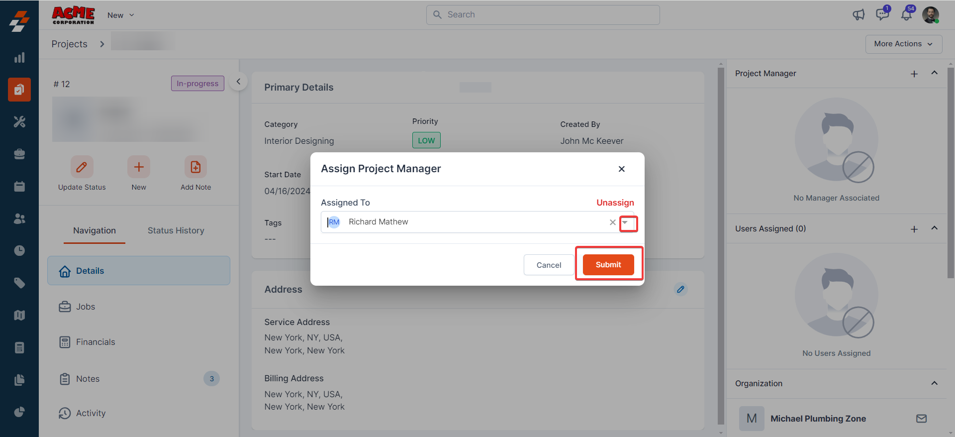 2. A pop-up appears. Choose the project manager from the dropdown menu and click the "Submit" button to associate the selected manager with this Project.