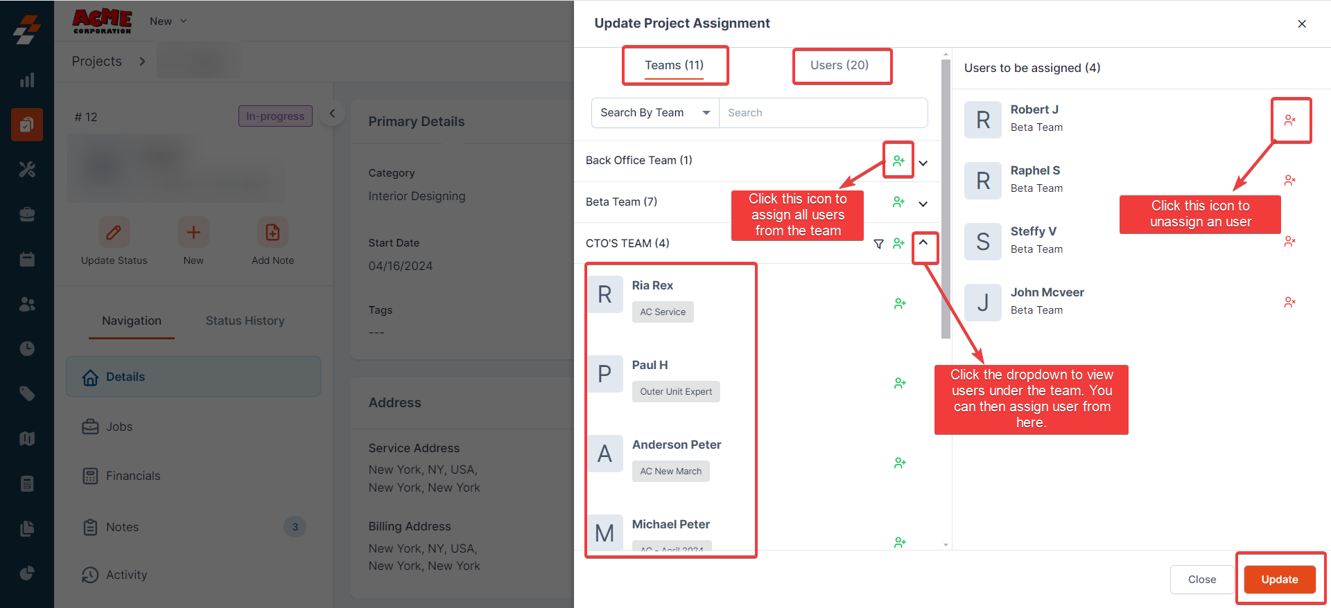 2. A sidebar appears on the right with teams and users. Assign a user from the team or assign all users from the team. Once assigned, click the "Update" button to update them.