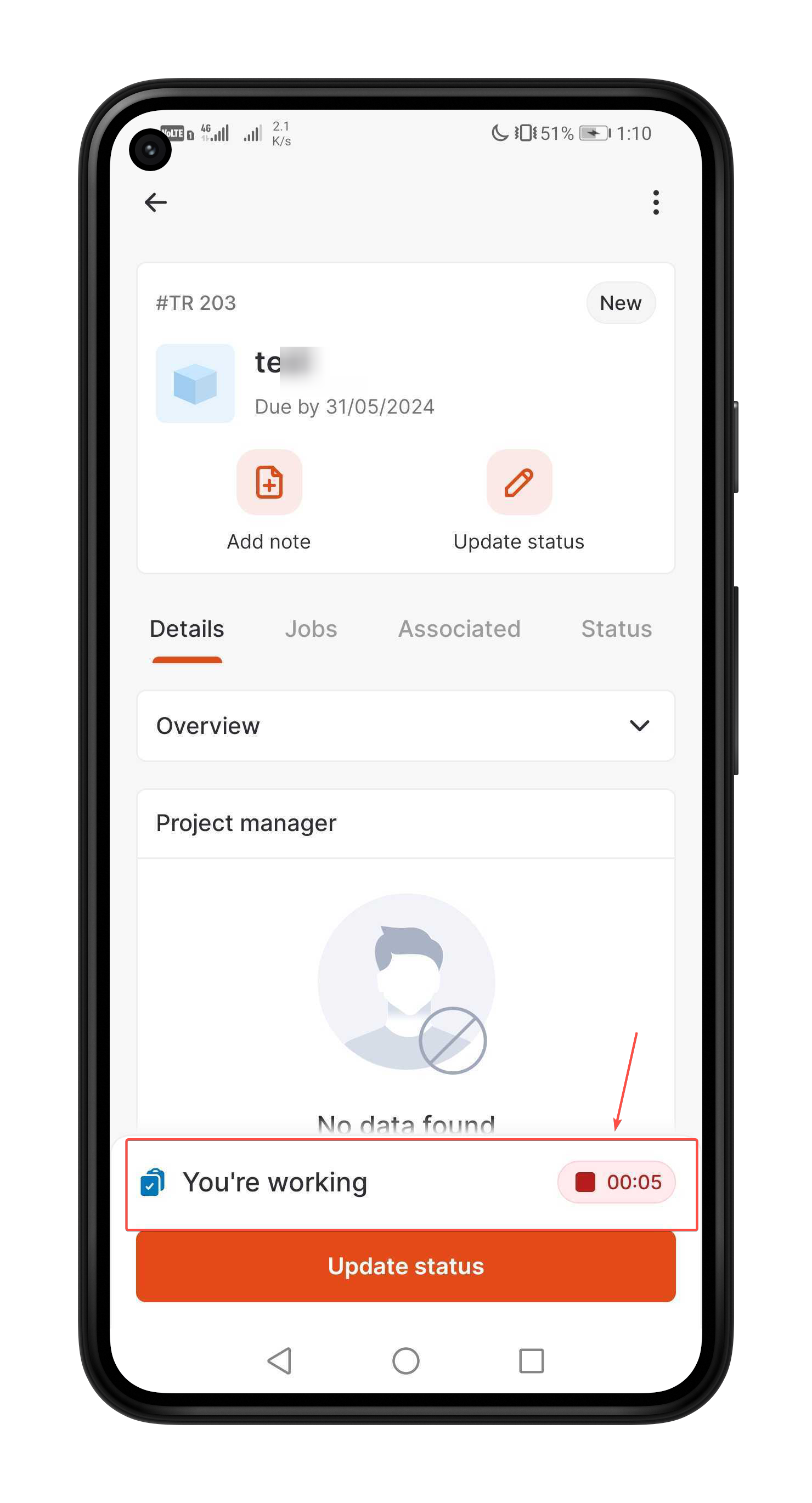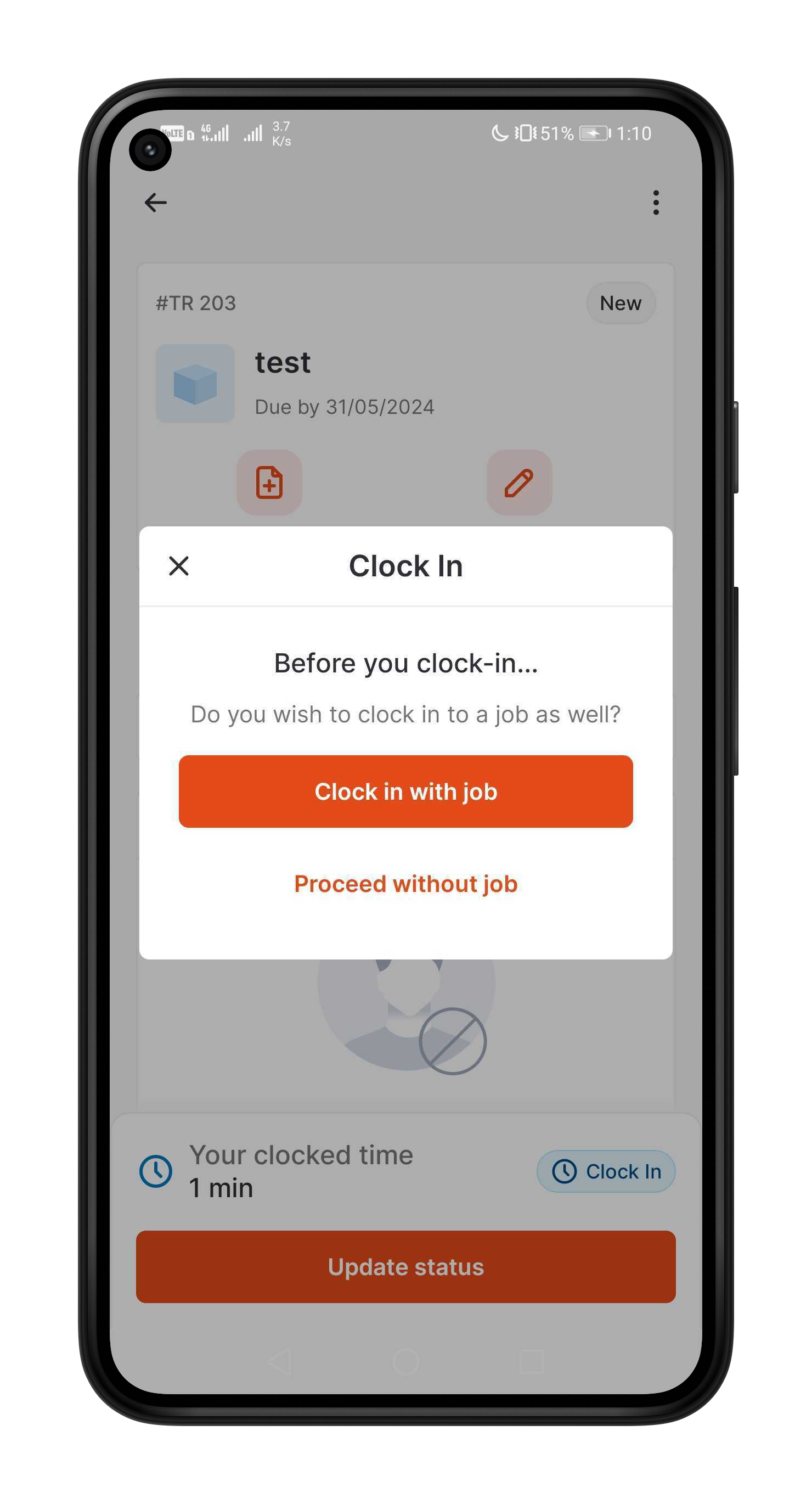 3. On the details page, click on “Clock-in” above the “Update status" button. You will be prompted to clock in to the project either with or without a job.