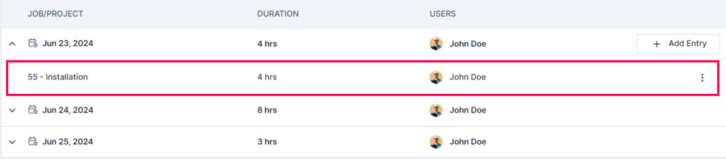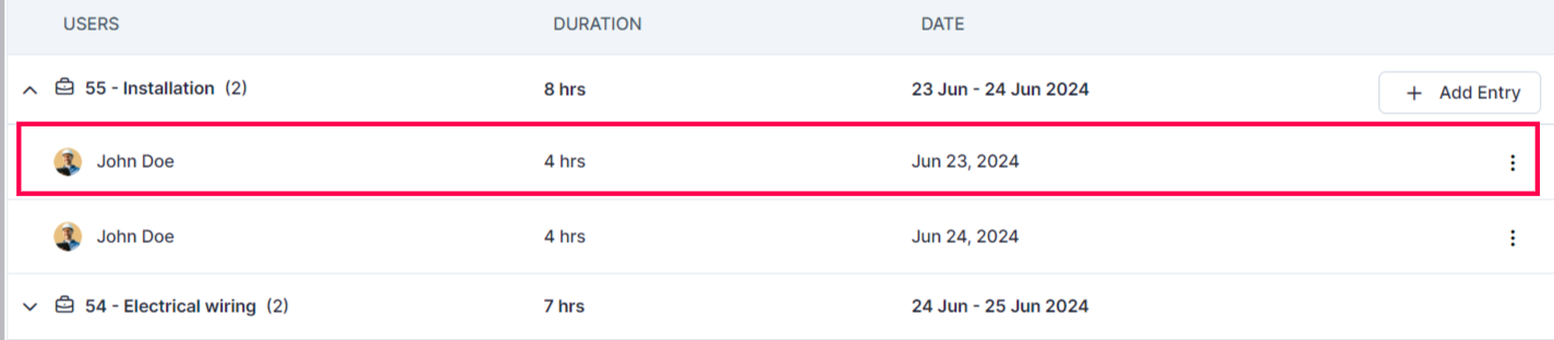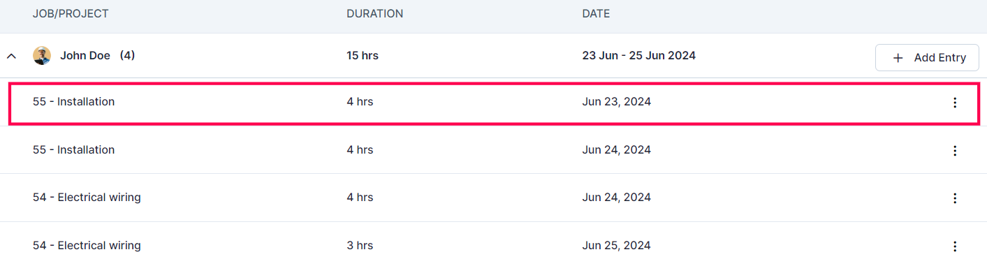 When the technician clocks in and out on the same day for different jobs, they will be reflected as separate entries. For example, on 24th June, John Doe has entries for both 'Installation' and 'Electrical Wiring', and these are reflected as separate entries.