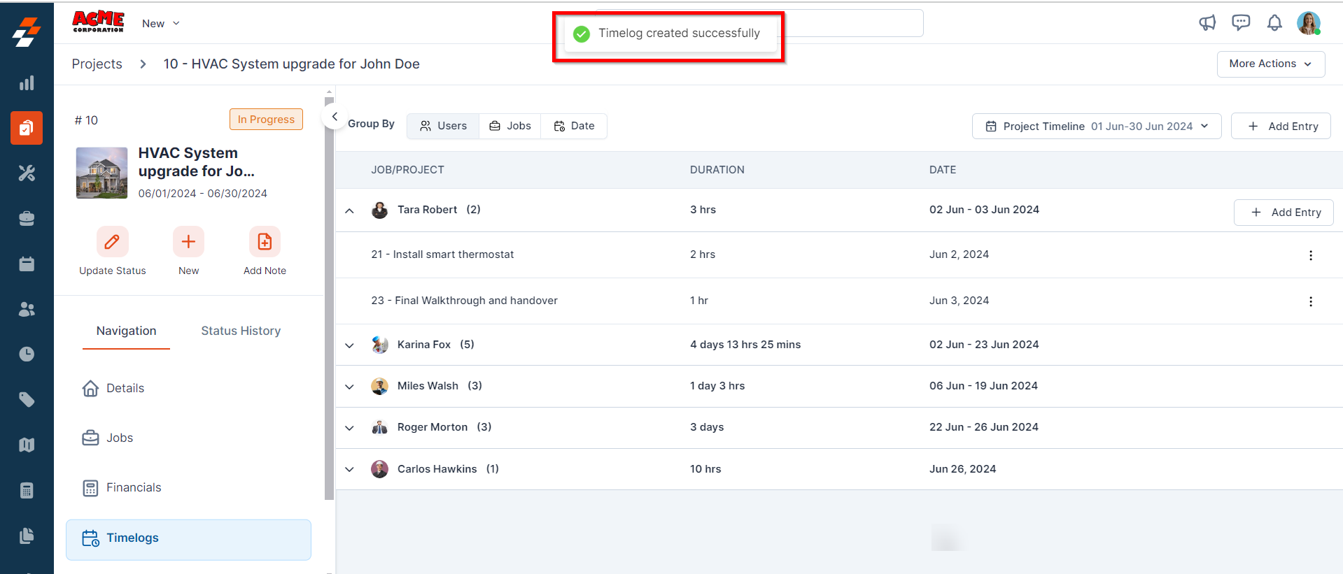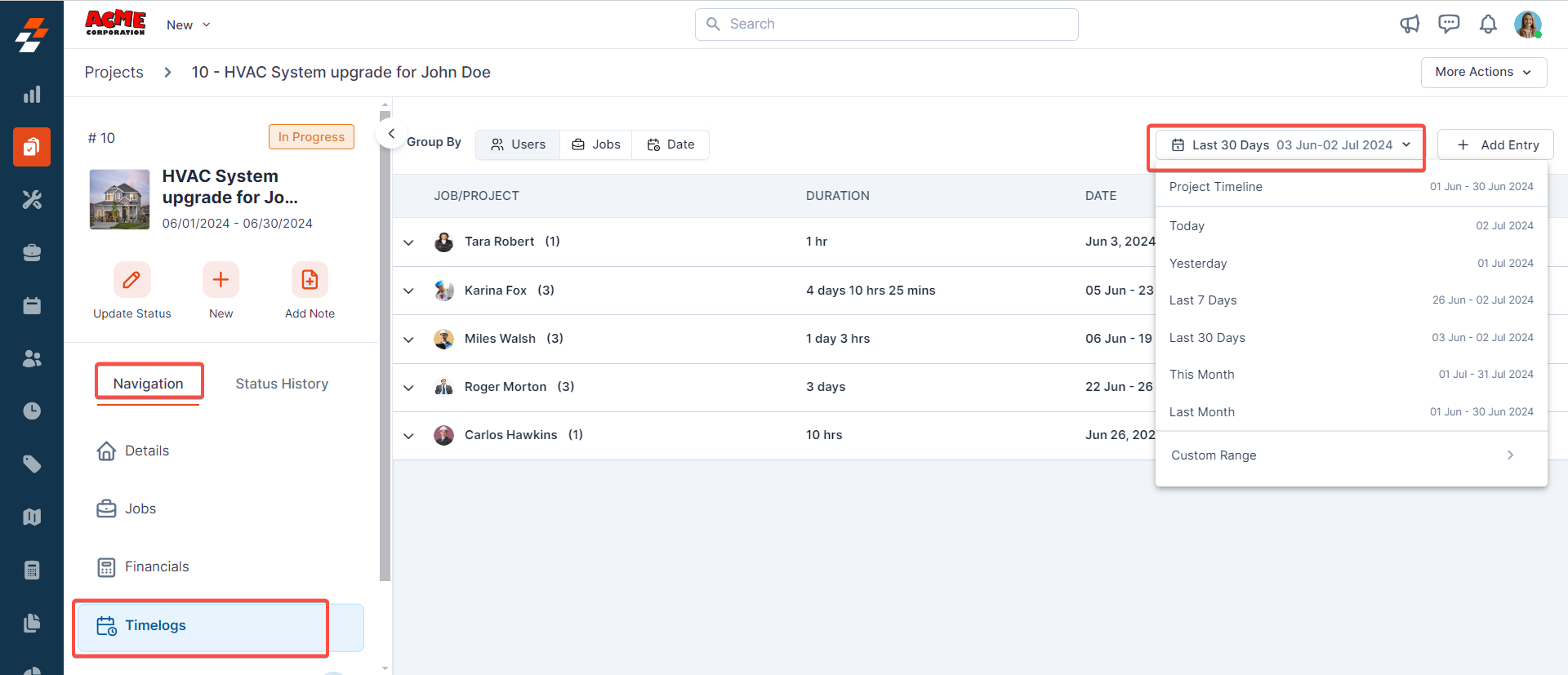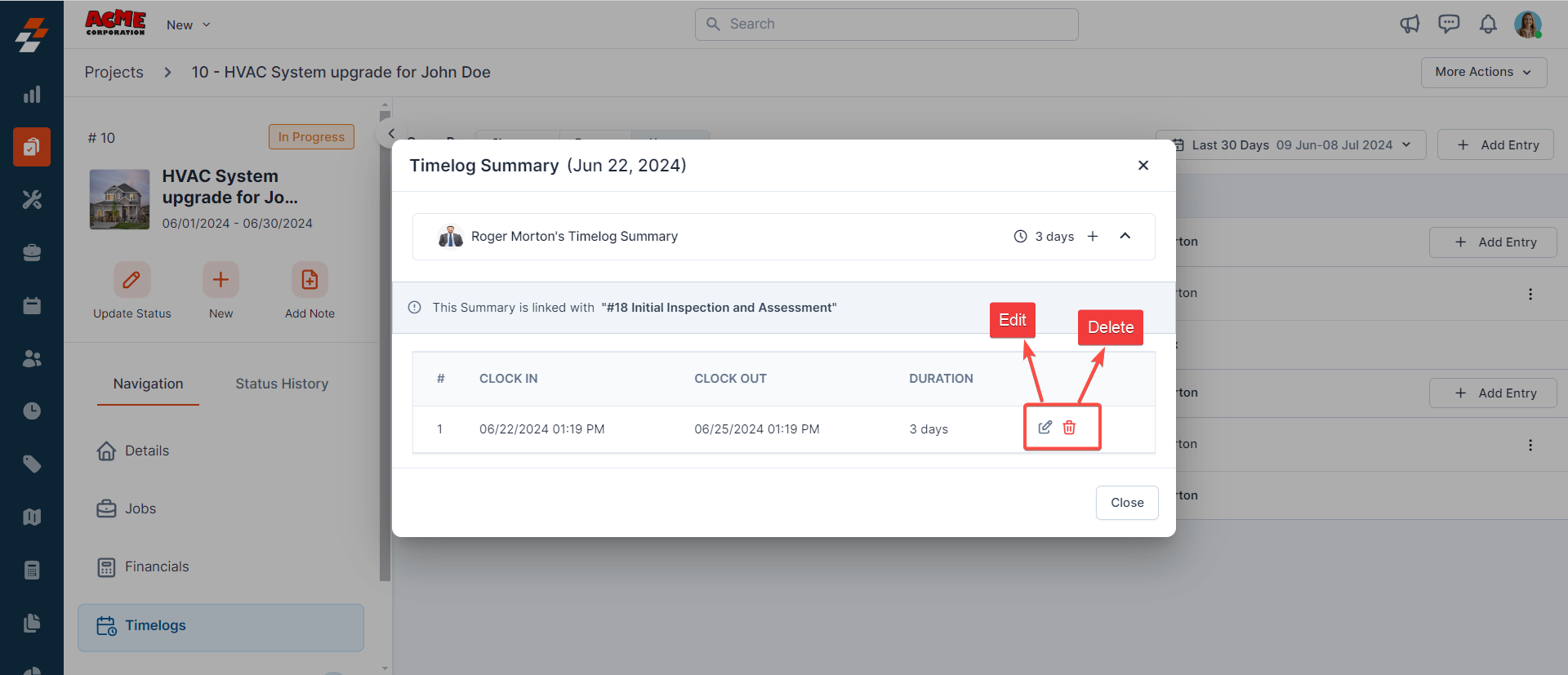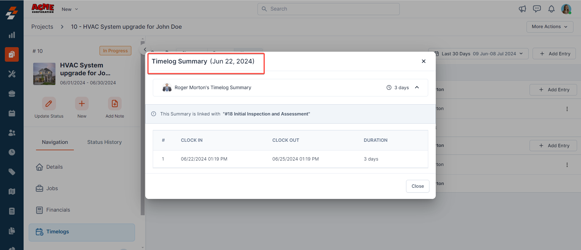 To help you better understand timelog entry, here’s an example. Consider technician “John Doe,” who worked on two jobs, ‘Installation’ and ‘Electrical Wiring,’ on different dates for an HVAC Installation project. His clock-in/out entries for the two jobs are as follows: