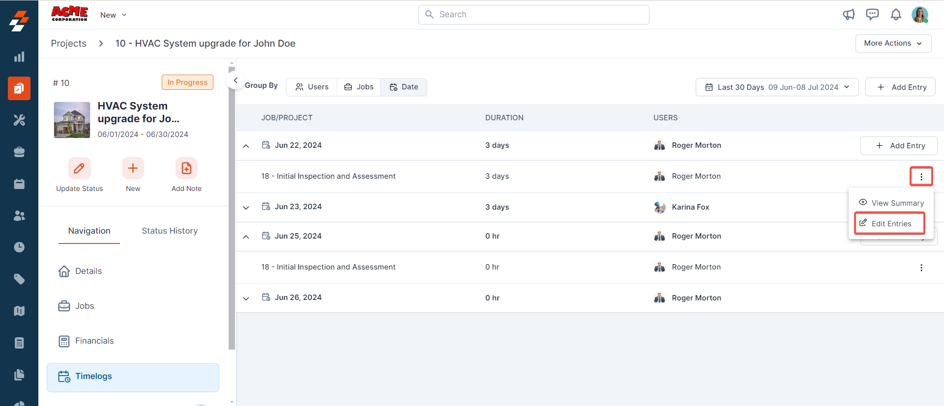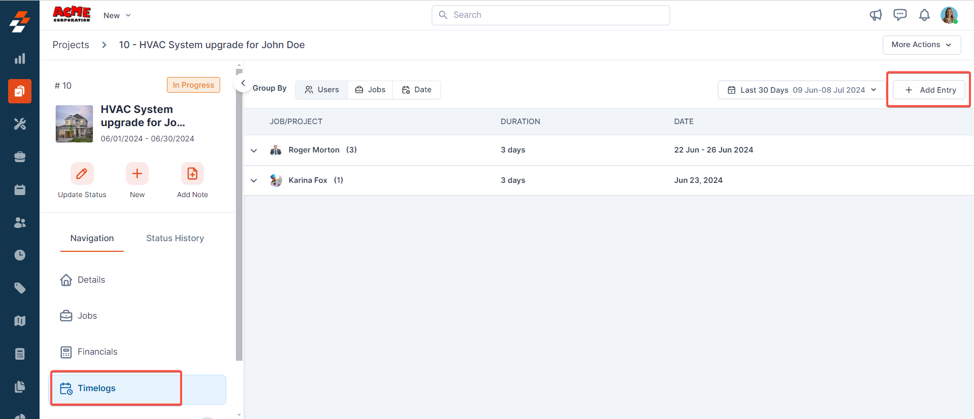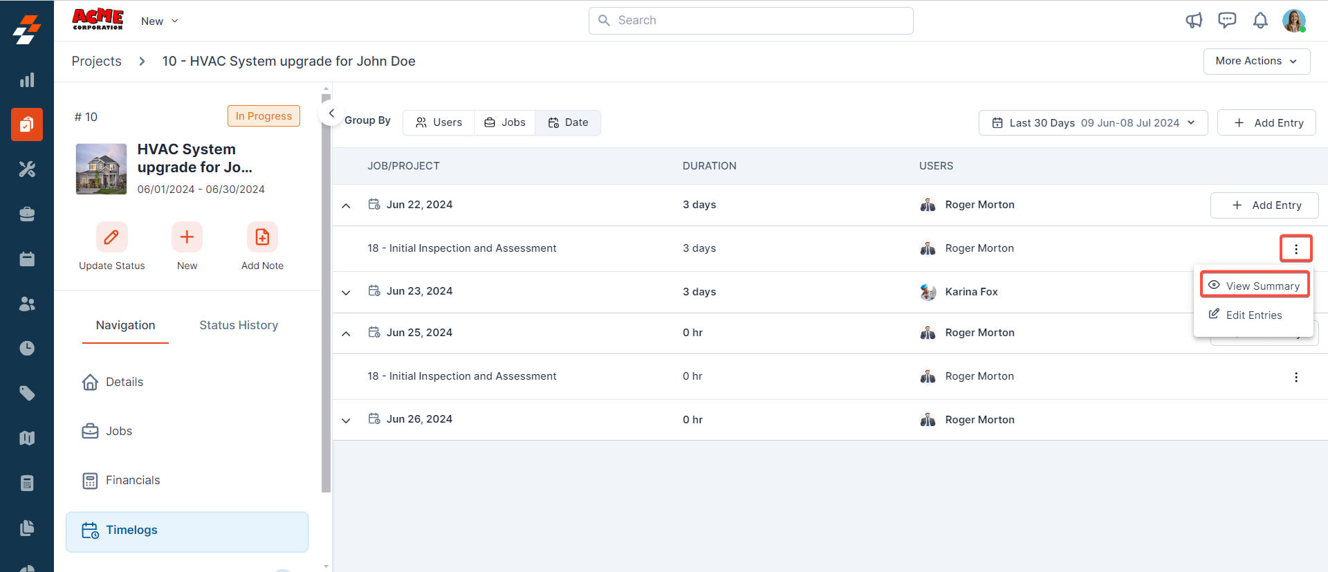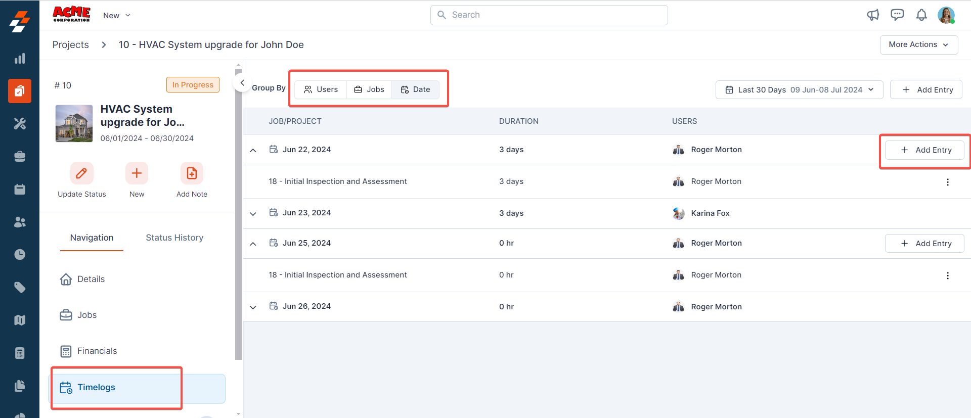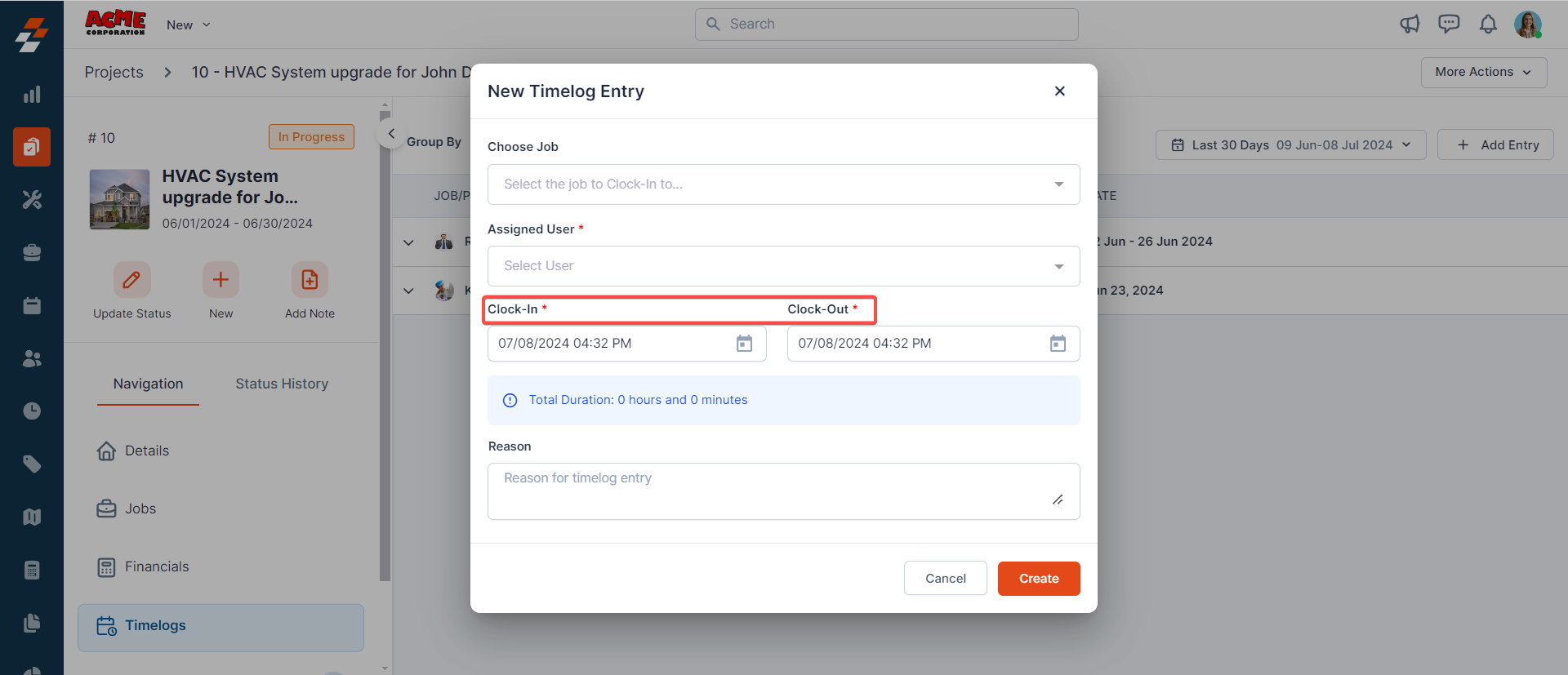 To help you better understand timelog entry, here’s an example. Consider technician “John Doe,” who worked on two jobs, ‘Installation’ and ‘Electrical Wiring,’ on different dates for an HVAC Installation project. His clock-in/out entries for the two jobs are as follows: