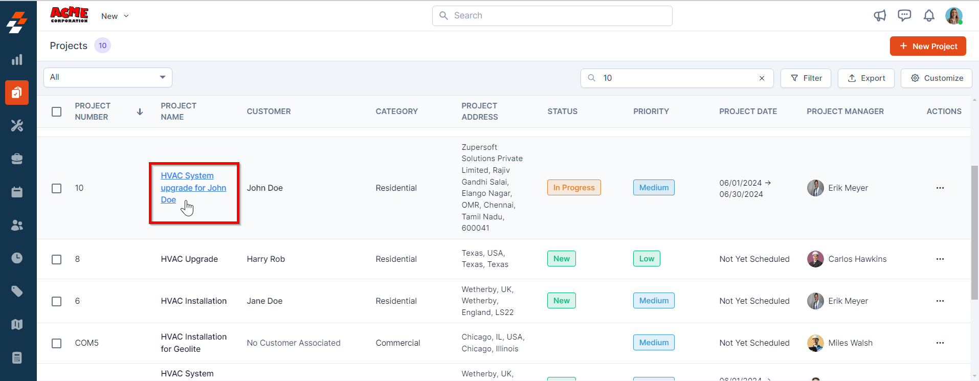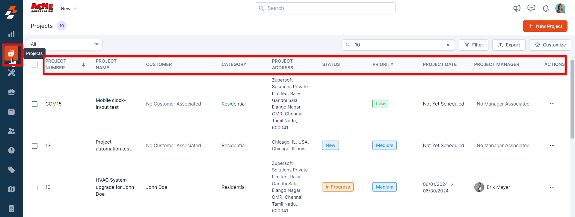 1. Click the "Projects" icon from the left navigation menu. You can view the list of projects with project name, category, status, priority, and other details on the projects listing page.
