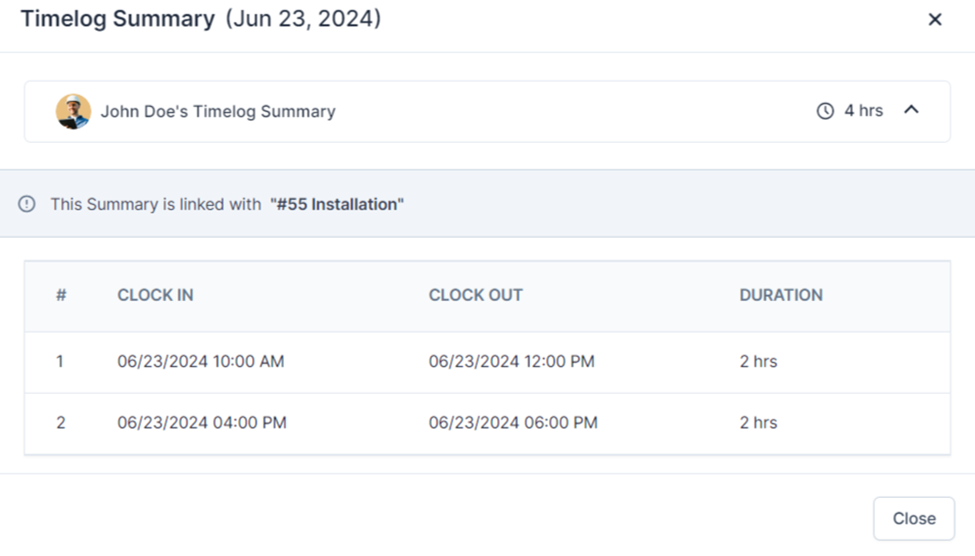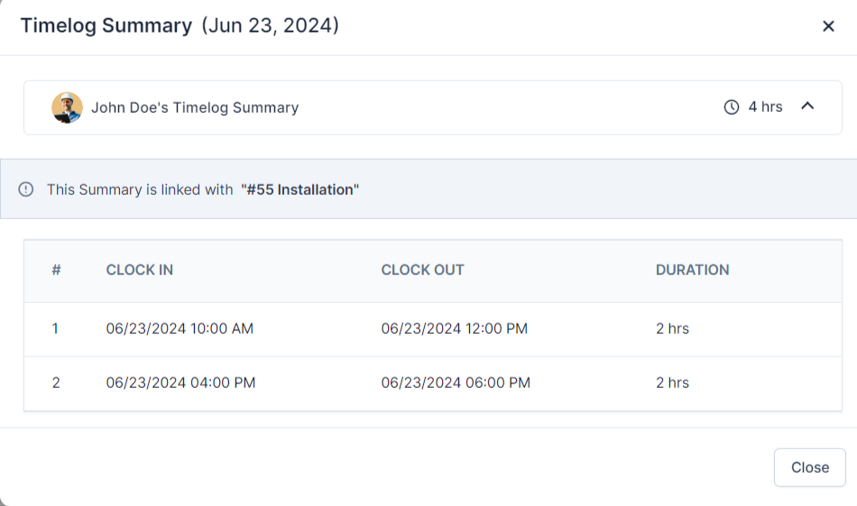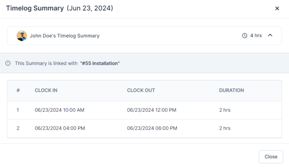 When the technician clocks in and out of a job multiple times on the same day, they are combined into a single entry for that date (you can still view the breakdown of each entry). For example, for 'Installation' on 23rd June, John Doe has clock-in/out entries from 10:00 AM to 12:00 PM and from 4:00 PM to 6:00 PM. These entries are combined into a single entry with a total duration of 4 hours.