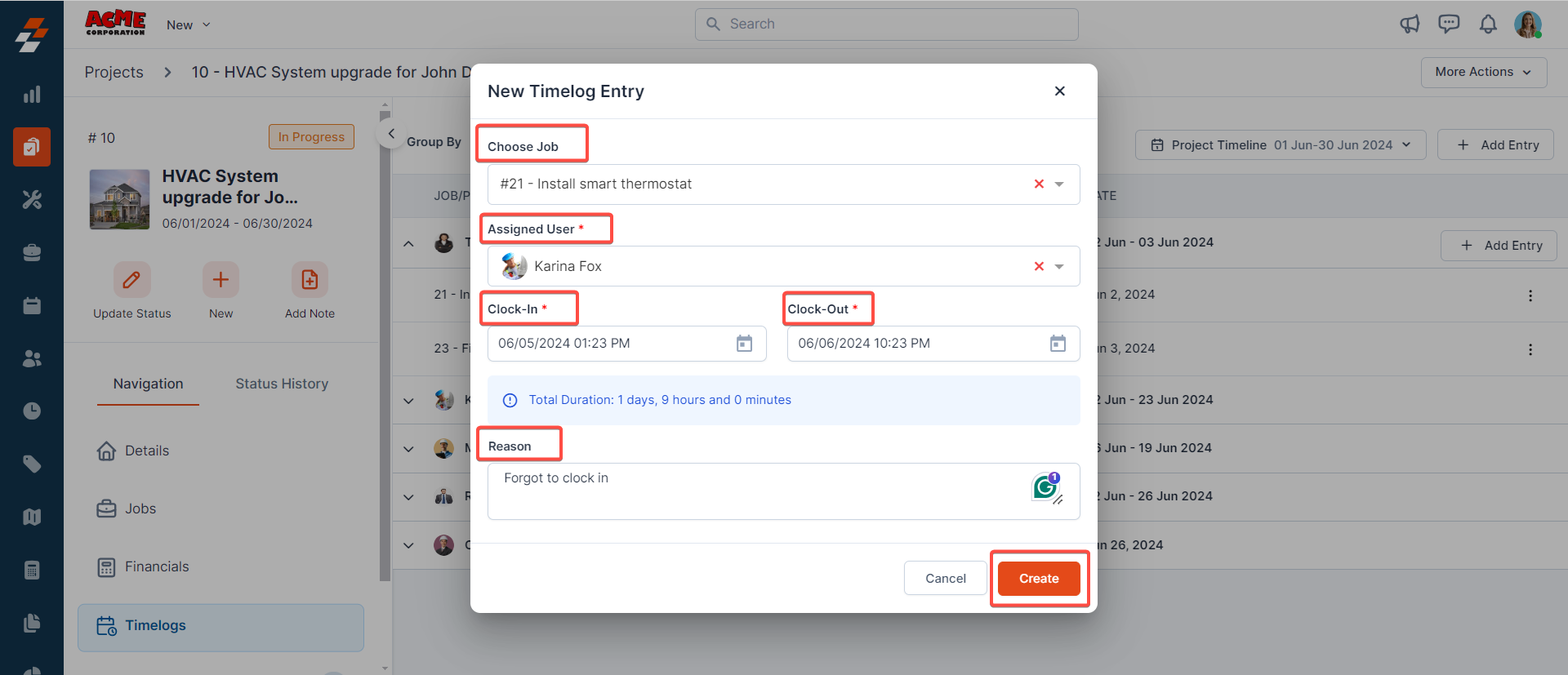 4. Once done, click the “Create” button. The timelog will be successfully created for the user.