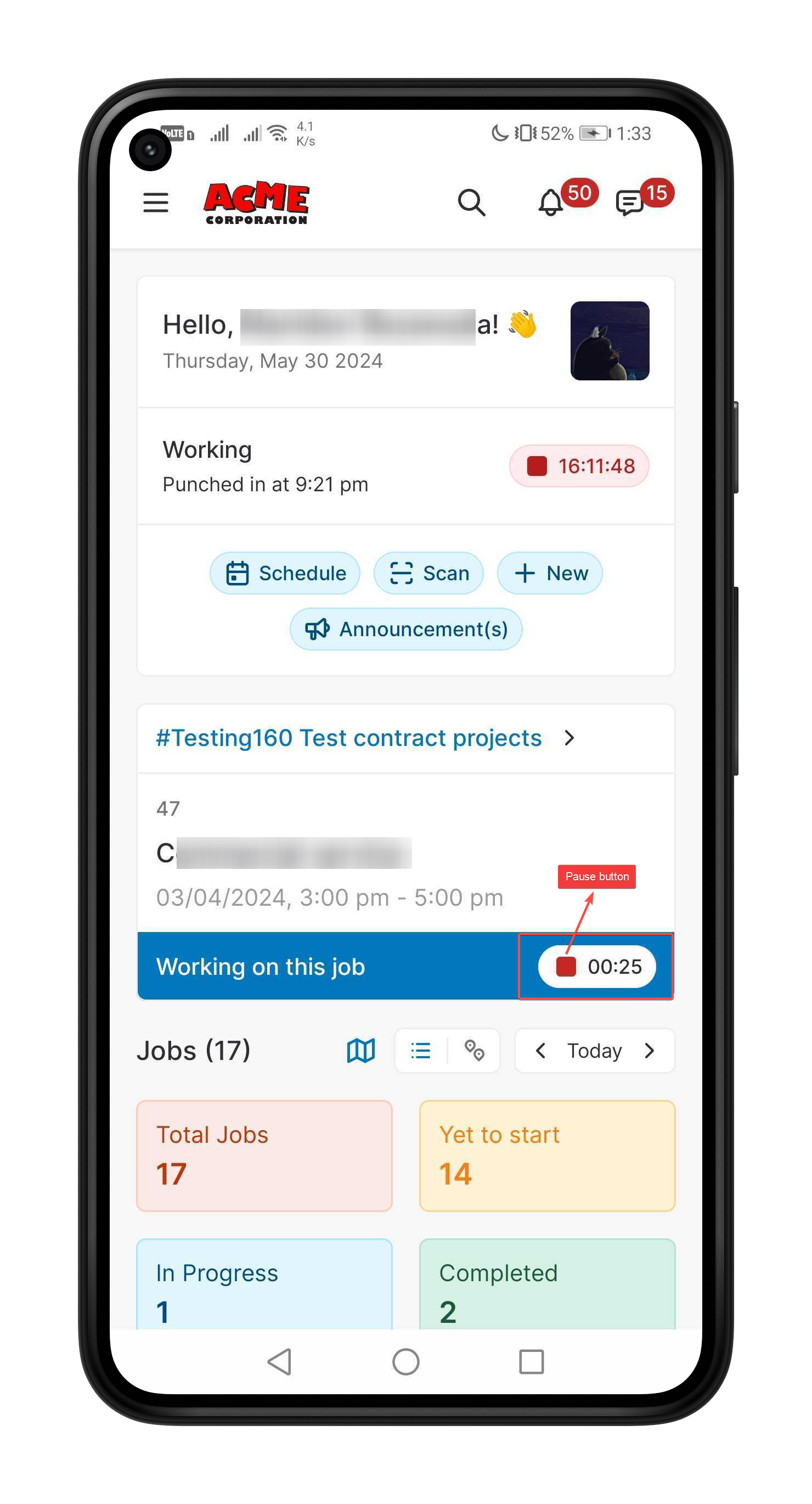 6. To pause the timer, tap the pause button, which clocks the user out of the job. To resume working on the job again, you need to clock in again, and the timer will restart for the specific date.