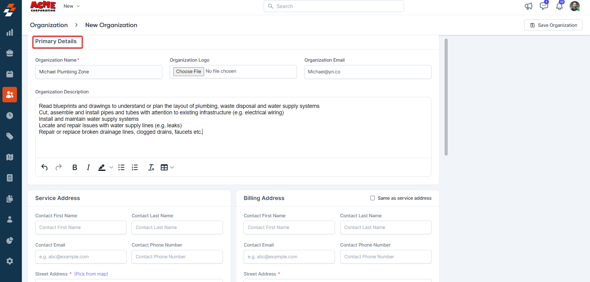 The Organization module in Zuper is designed to help manage all relevant company details. This module allows users to easily add and edit organization information, ensuring all necessary data is centralized and accessible.