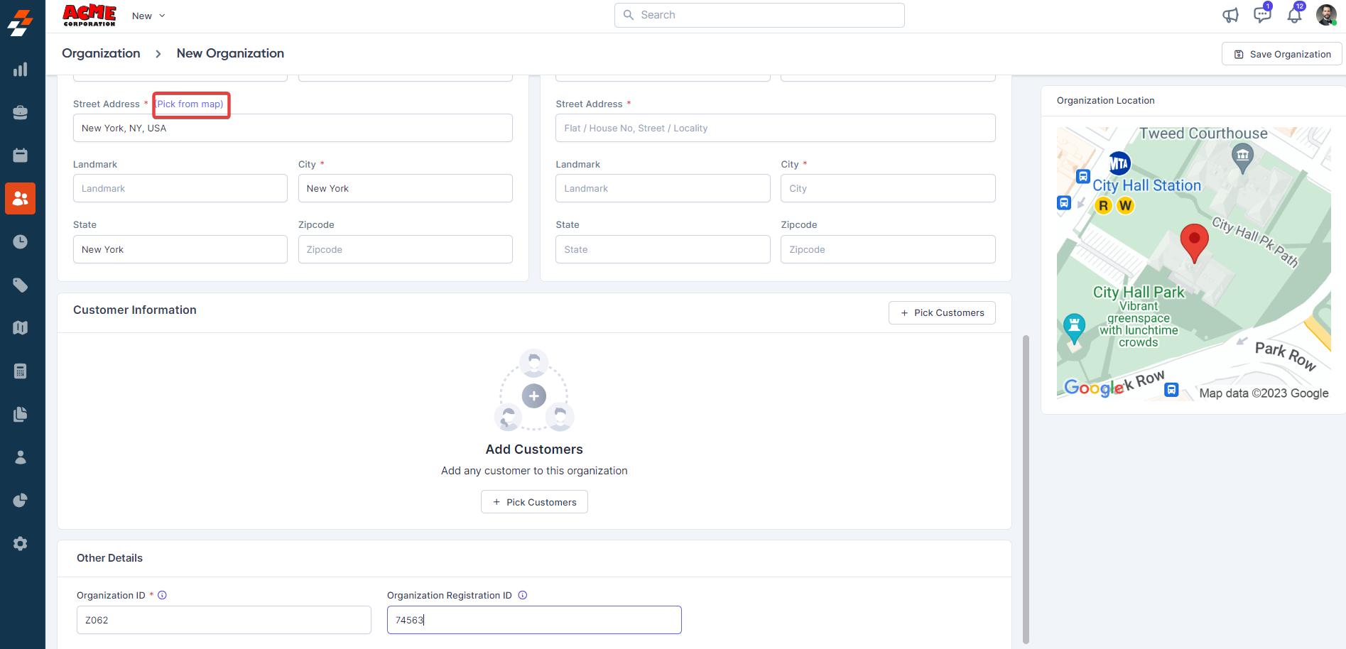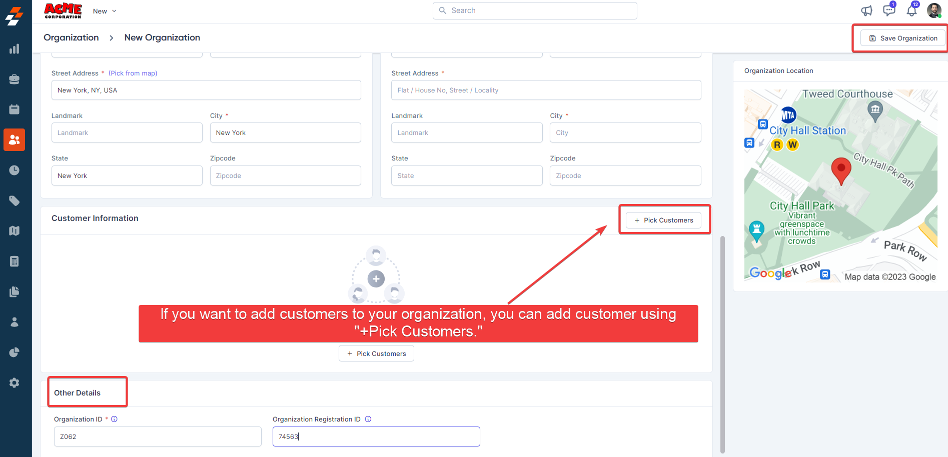 7. Click the "+ Pick Customers" button to add customers to the organization from the pop-up that appears.