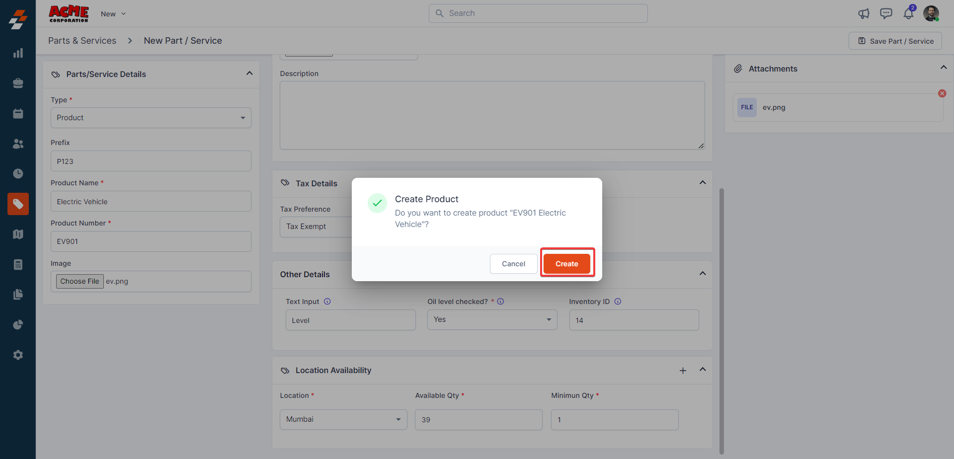 5. A dialog box appears. Click the "Create" button to create the product.