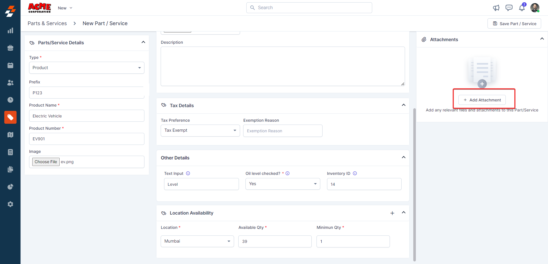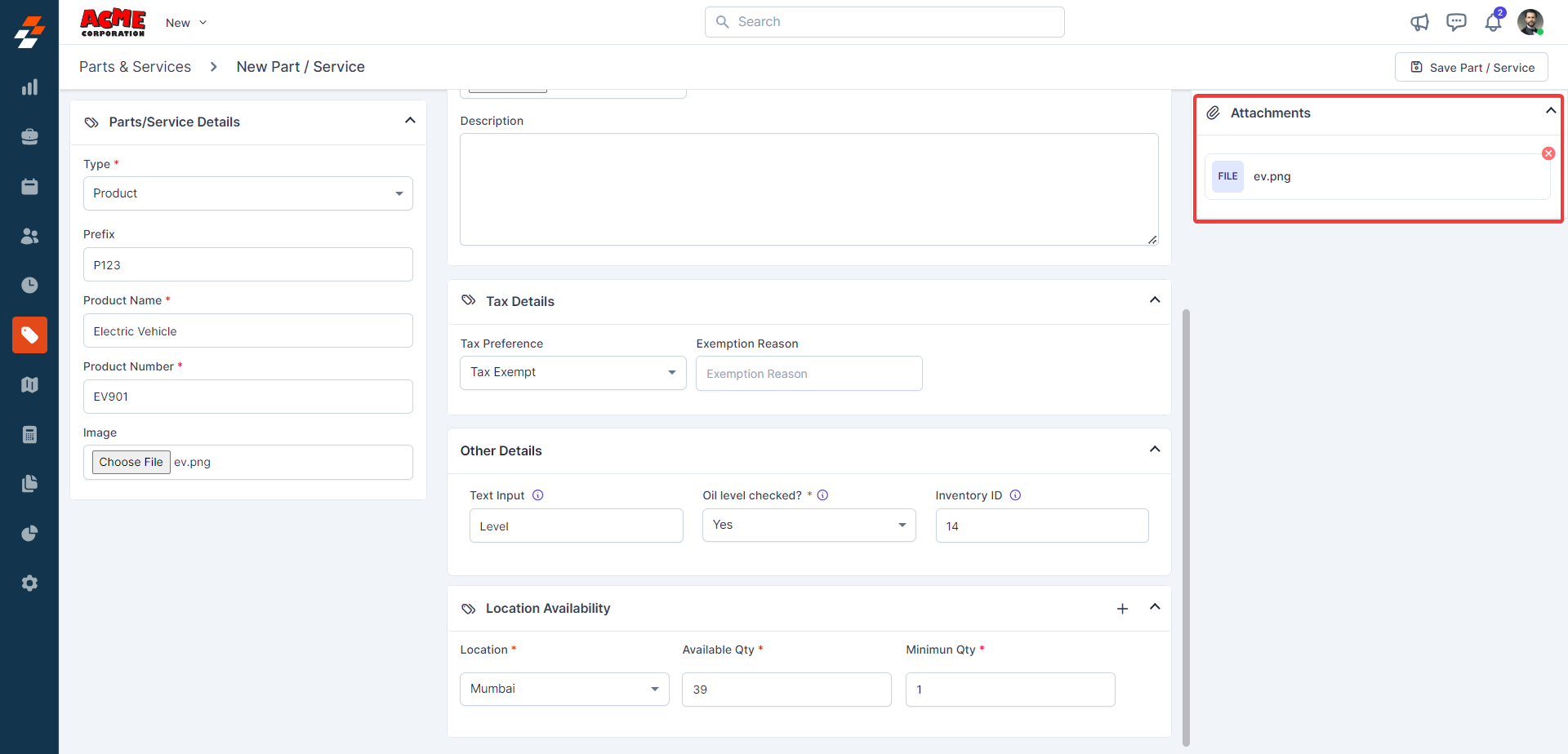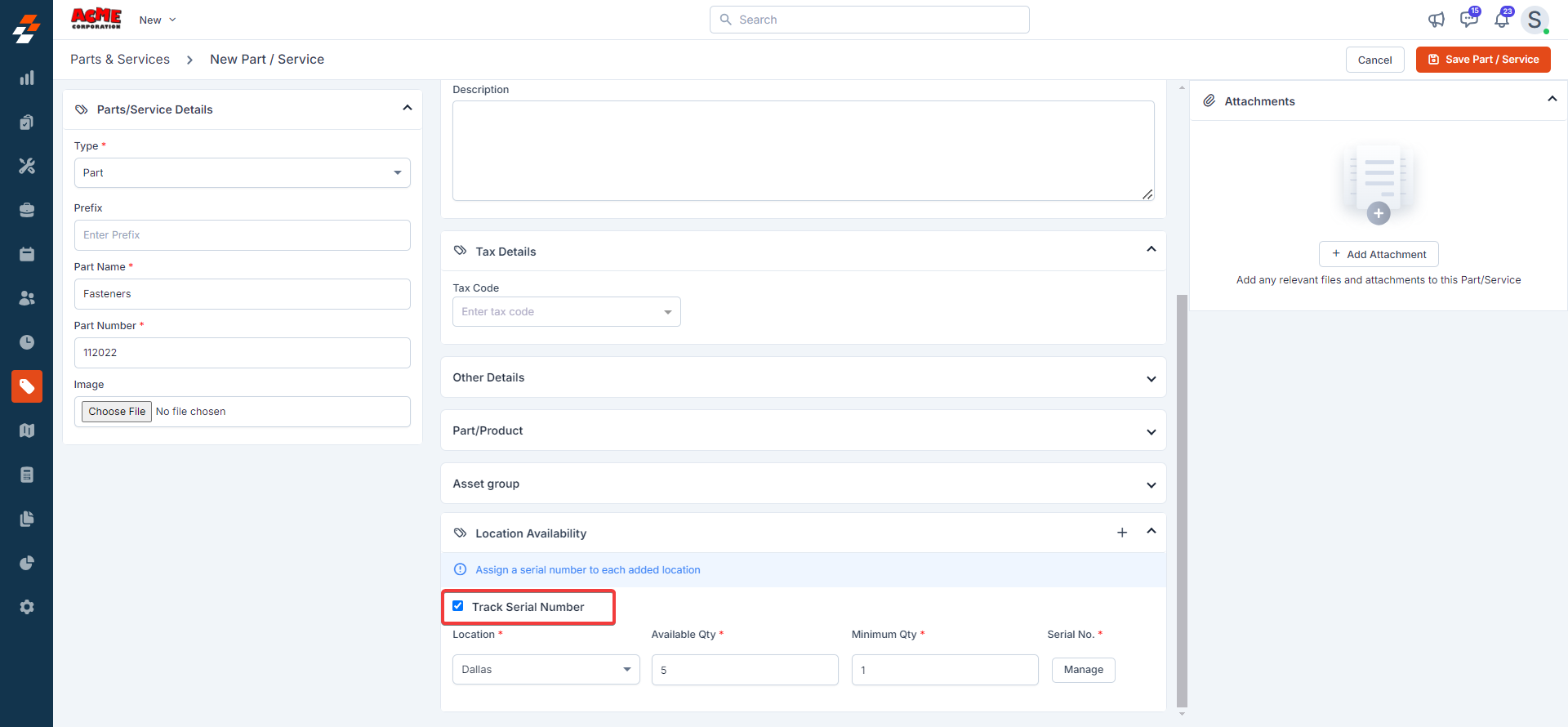 Note: After saving the “Part,” the same can be tracked under the “Location Availability” section.