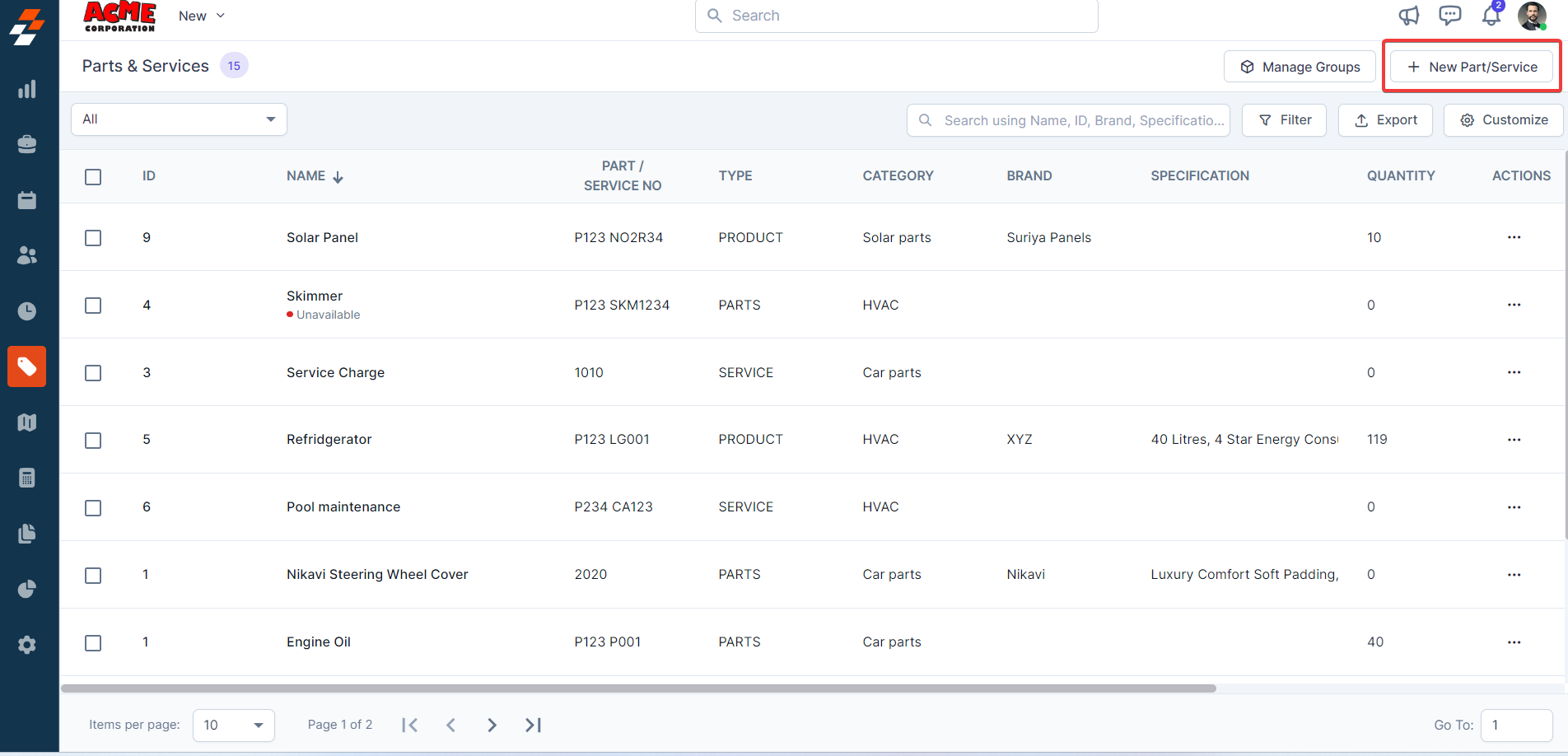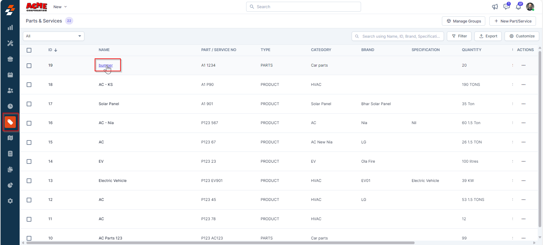 1. Click the "Parts & Services" icon from the left navigation menu, then select the desired part or service from the list.