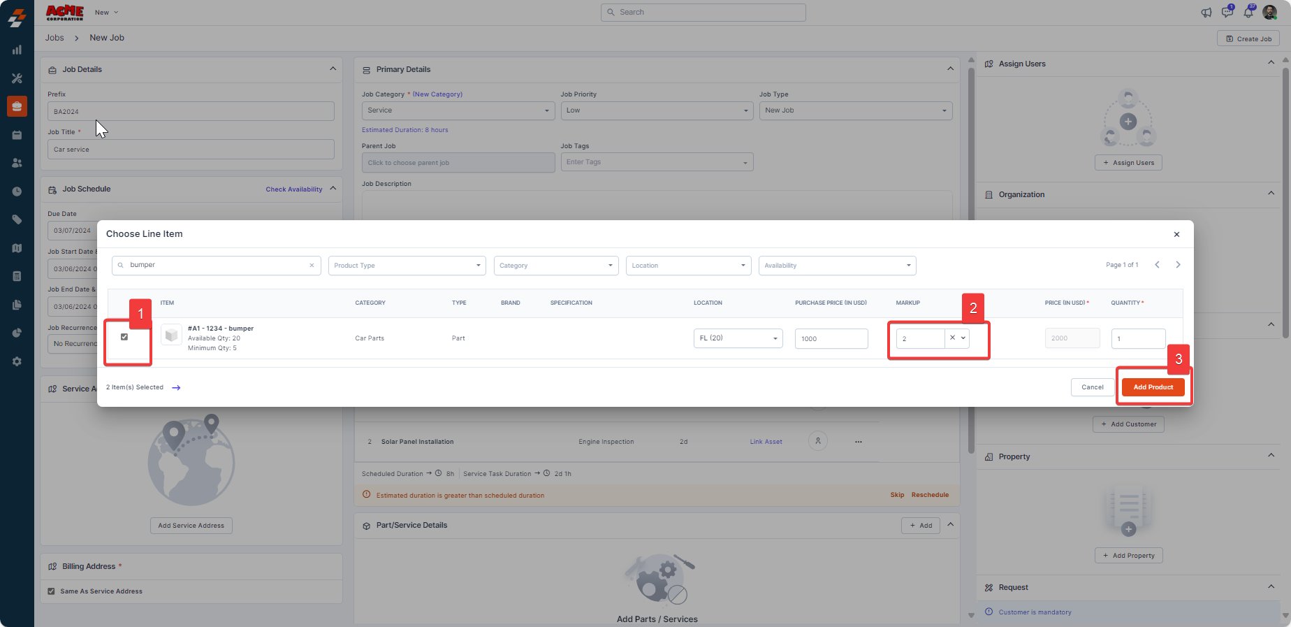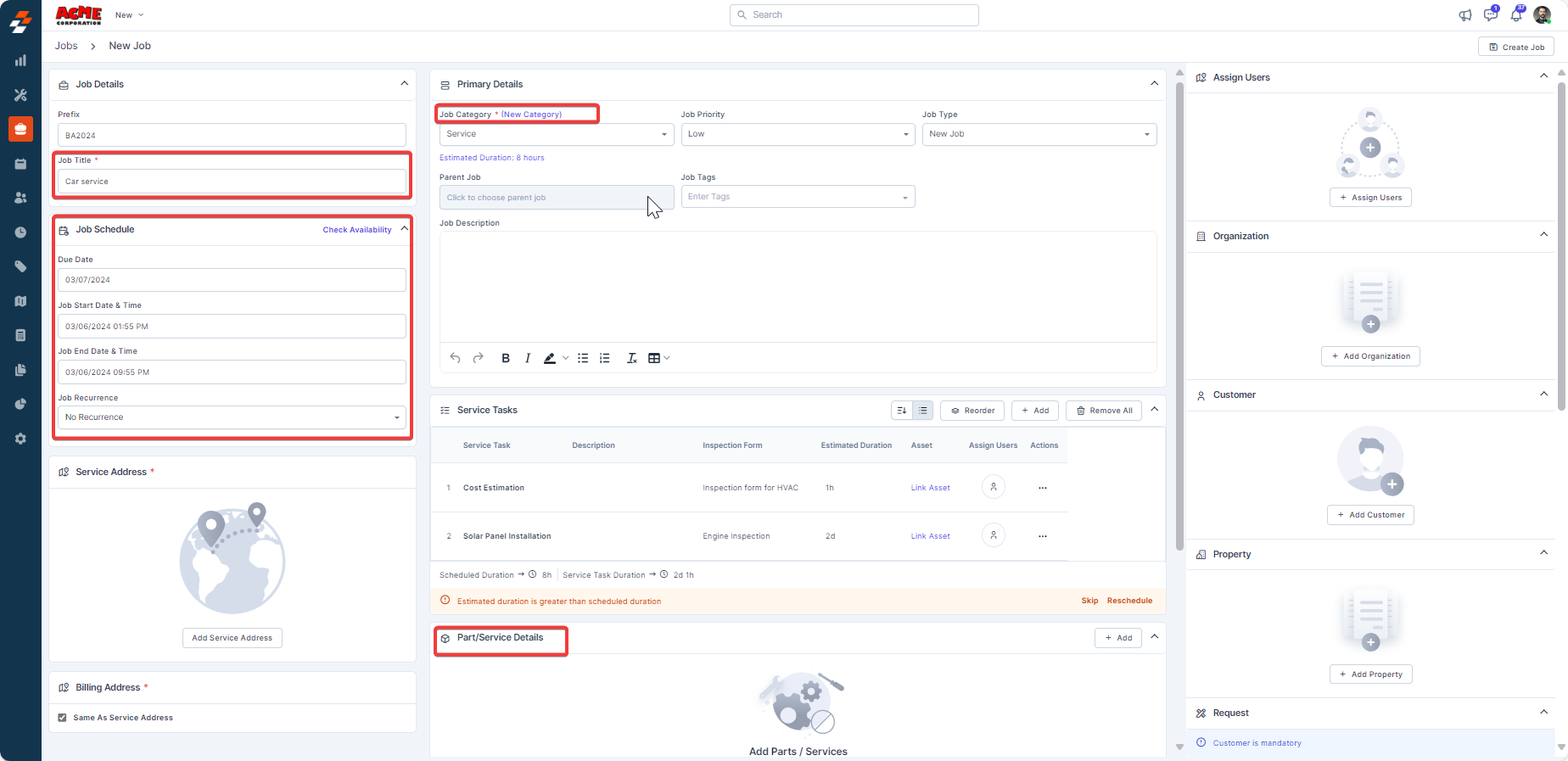 3. Add the job details, including title, category, due date, and part/service details.