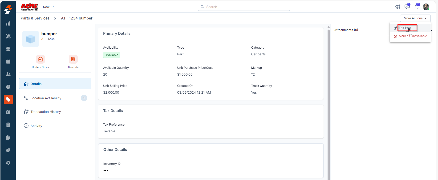 2. Once in the respective part or service, click "More Actions" at the top right corner and select "Edit Part." From there, you can make the necessary changes to the Markup.
