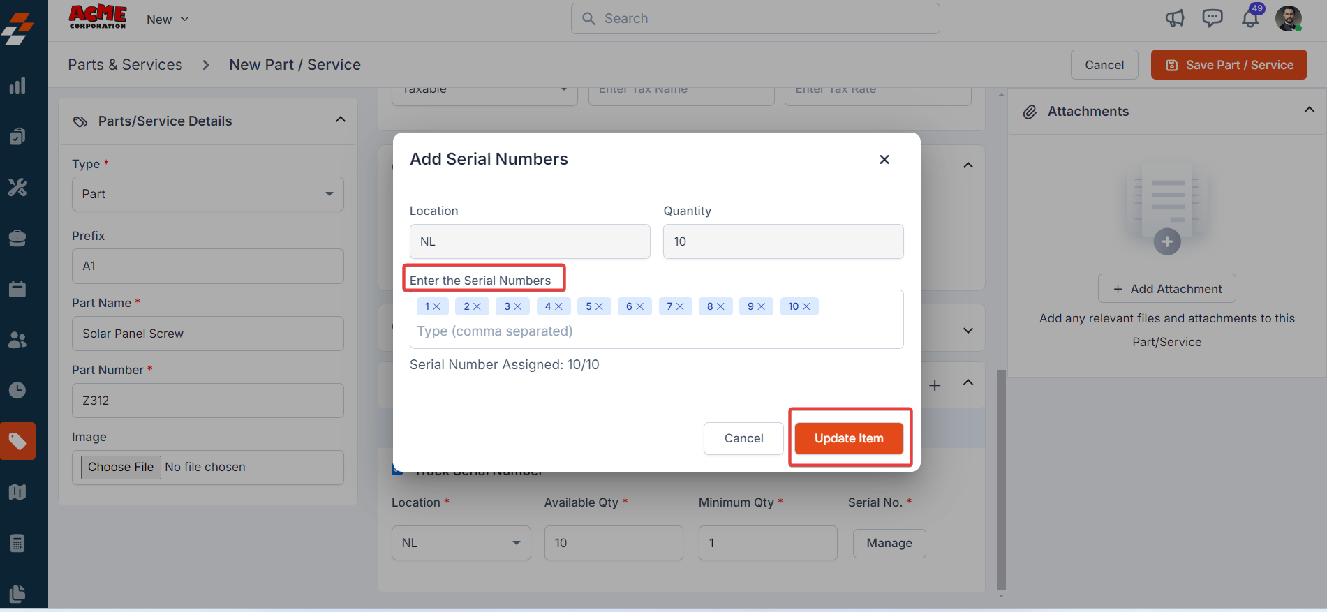 2. Add the serial numbers required for the parts. You need to enter the serial number one by one and press "Enter" key to save the serial number. Finally, click the “Update Item” button.