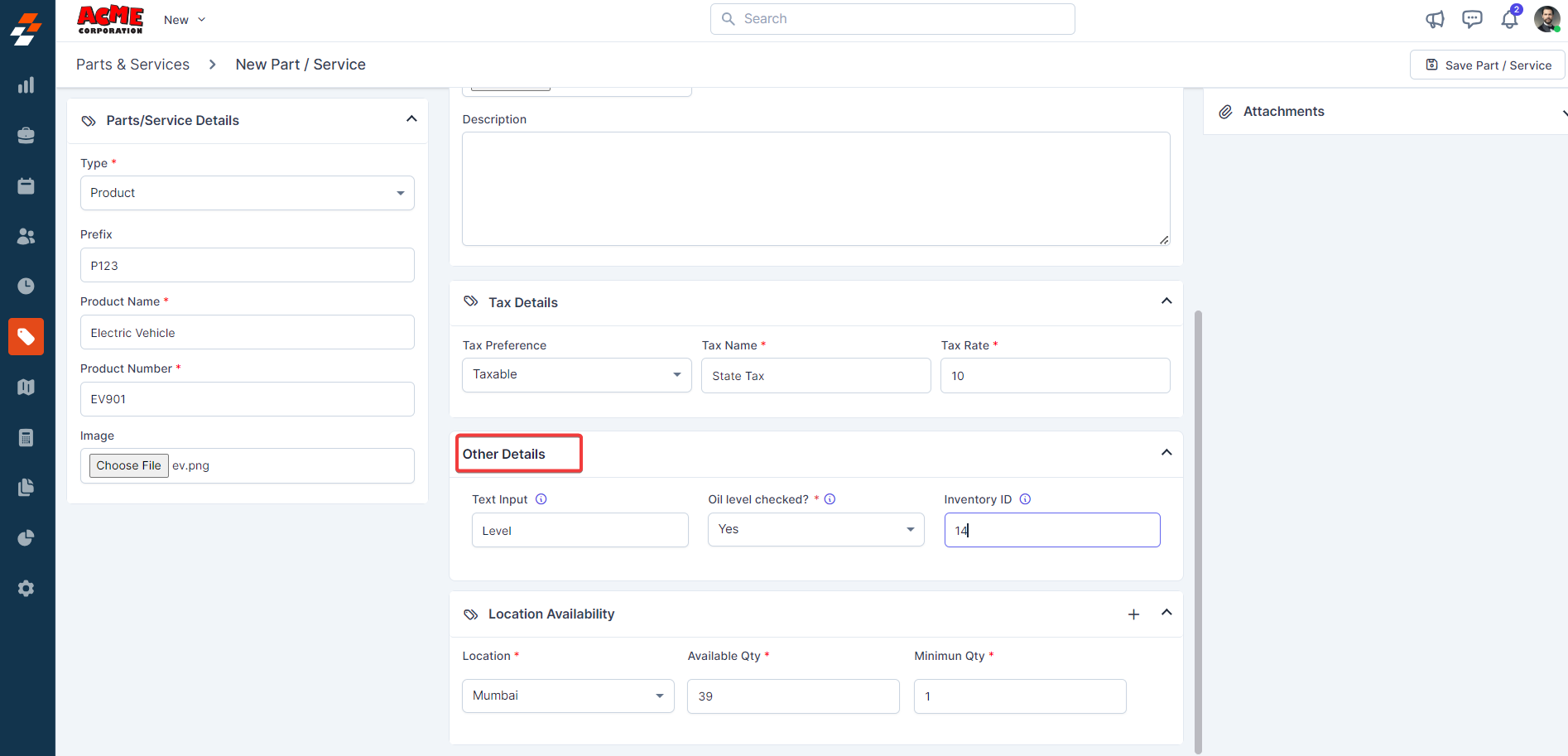 F. Attachments and Save the Part/Service