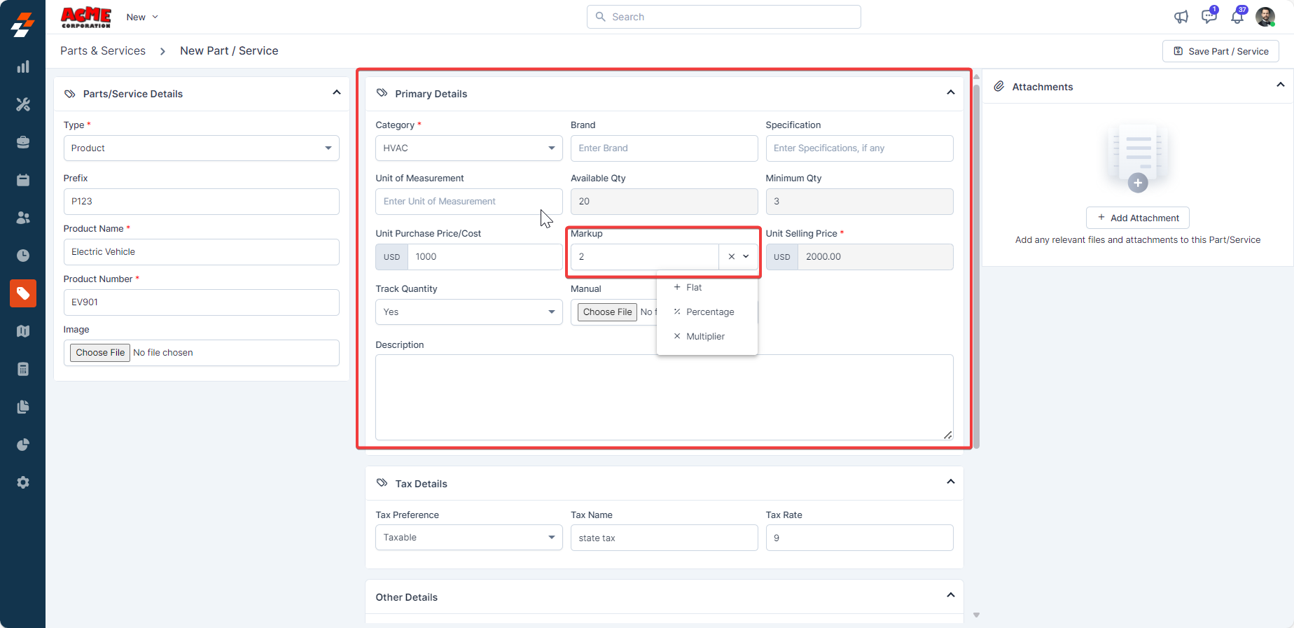 To edit a part/service markup, you must create a job, quote, or invoice. While creating, add the part/service and edit it. To do so, follow these steps: