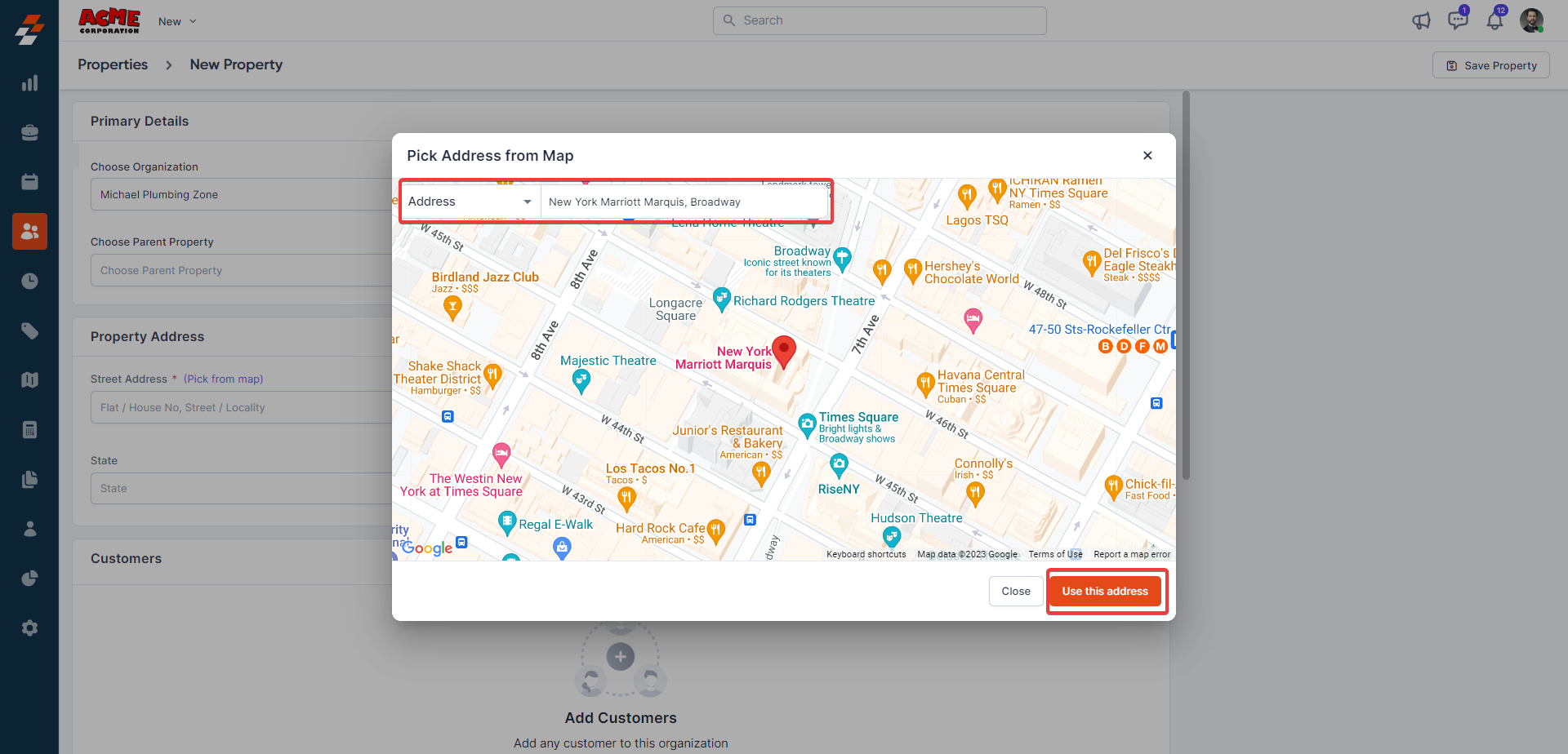 6. Select "Address" or "Geo-Coordinates." Enter the address or coordinates, and click the "Use this address" button. The address, including the landmark, city, state, country, zip code, and geo-coordinates, will be auto-filled.