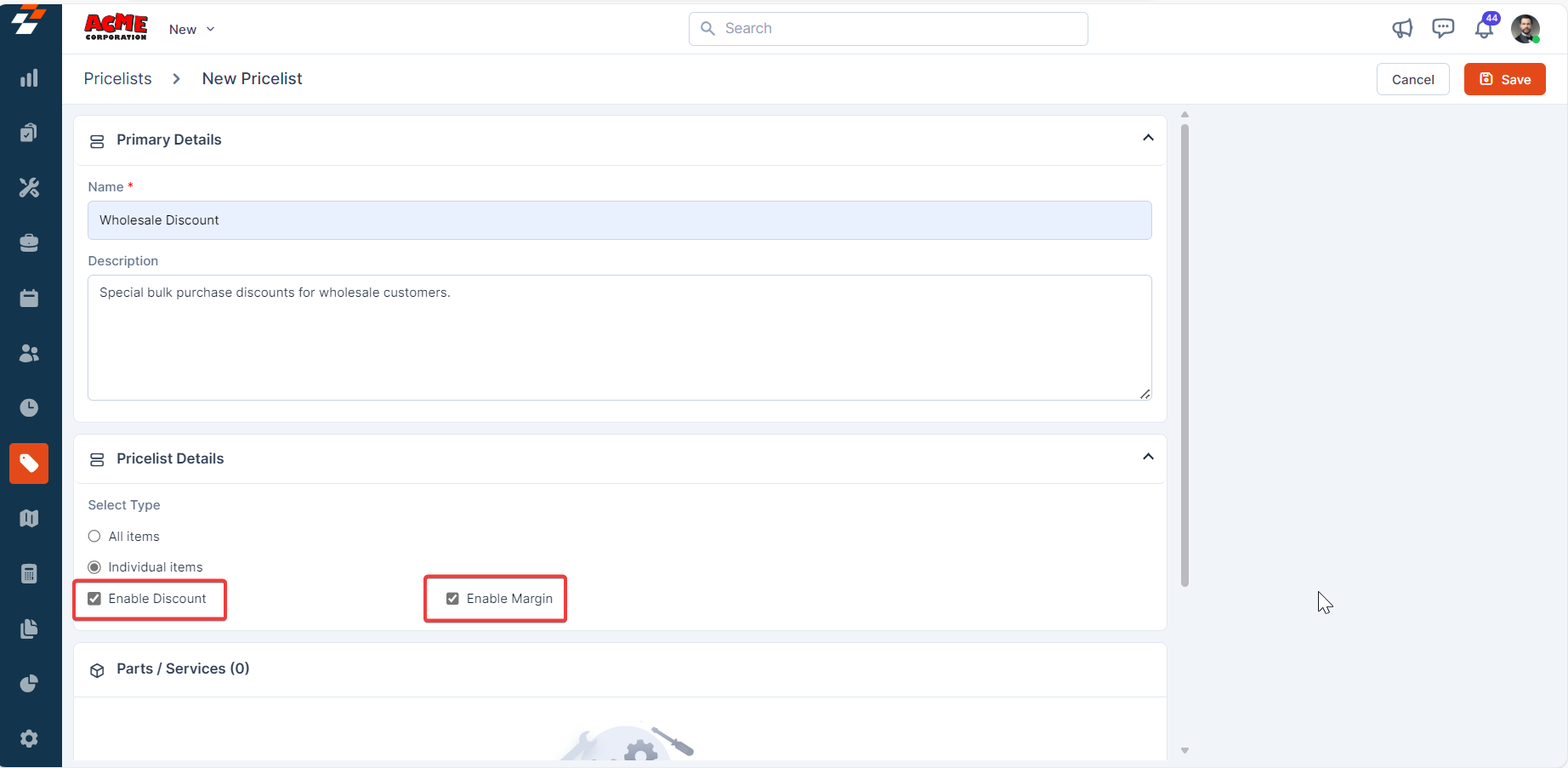 Note: You must activate the respective checkboxes during pricelist creation or editing to include a margin or discount in your pricing.