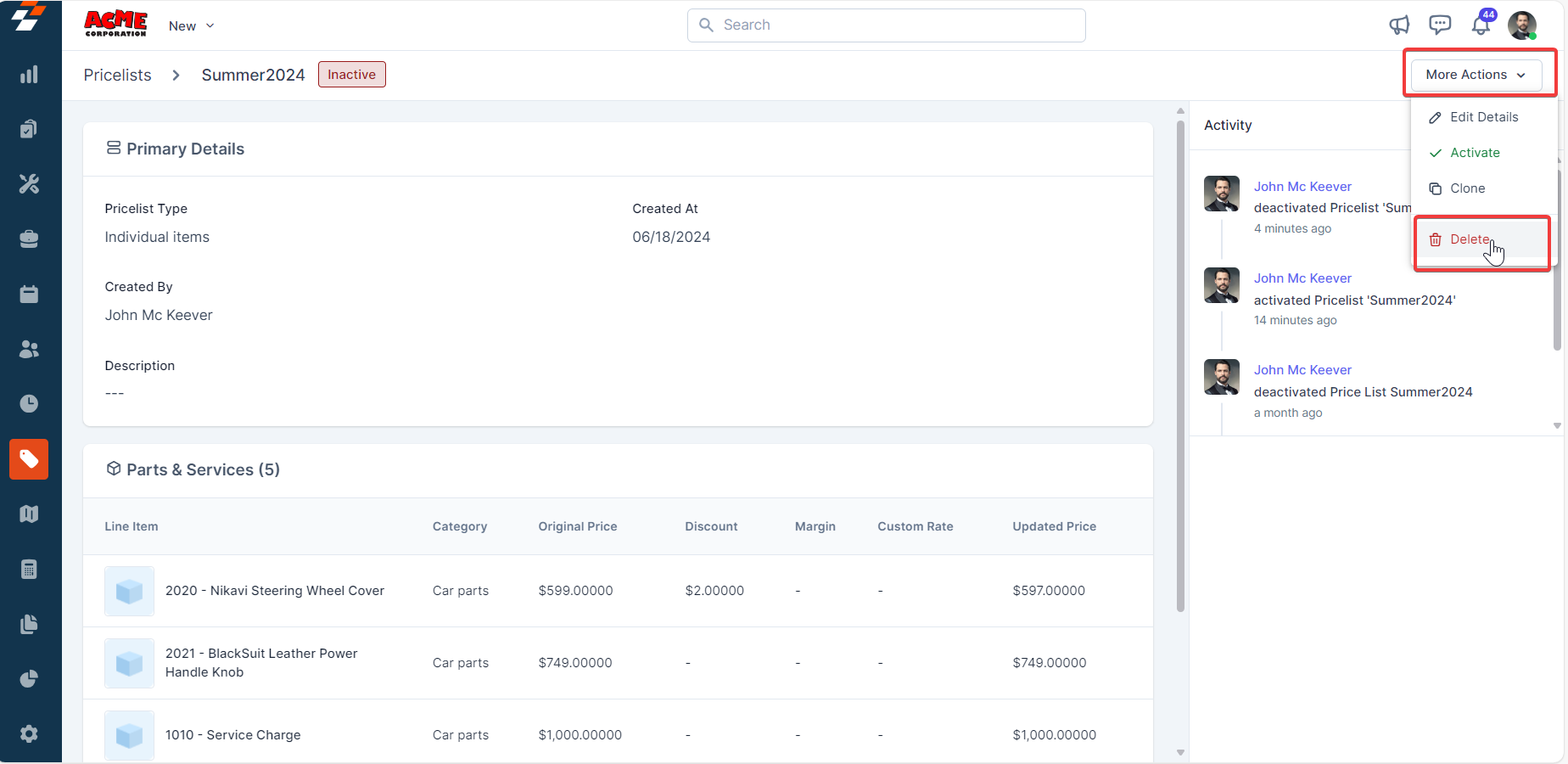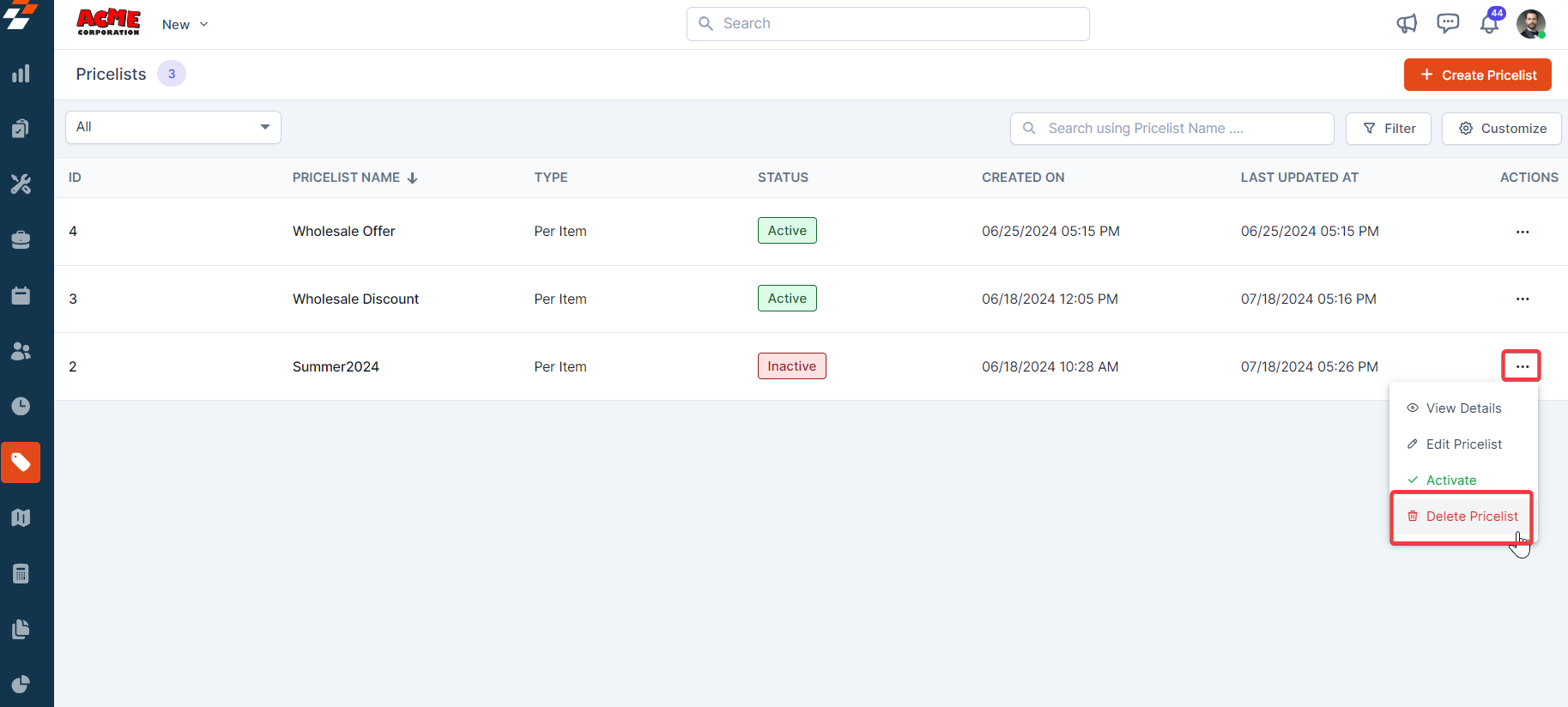 creating a pricelist, making updates, or deactivating and deleting a pricelist, these procedures facilitate streamlined pricelist management within the