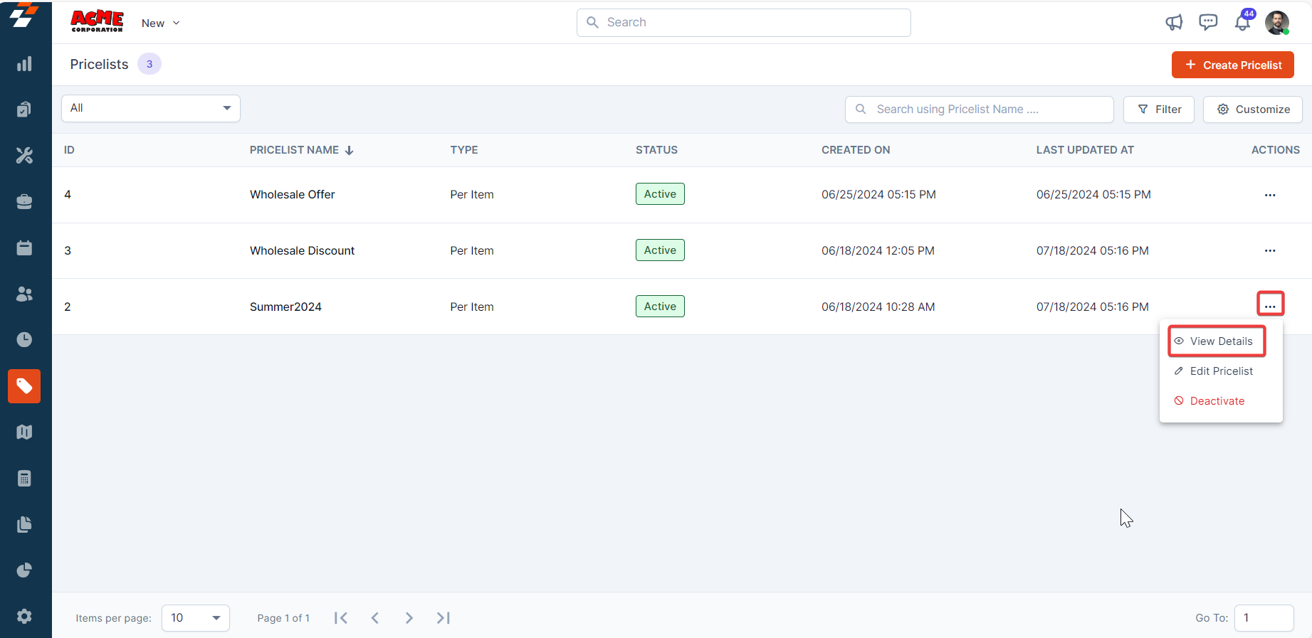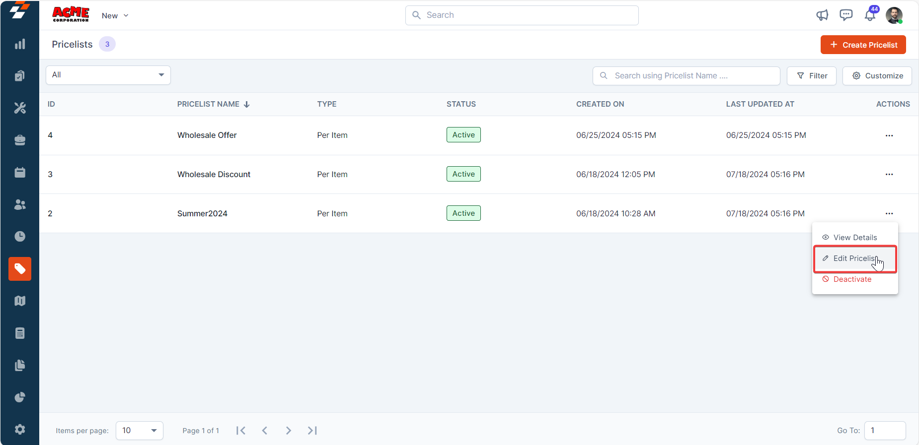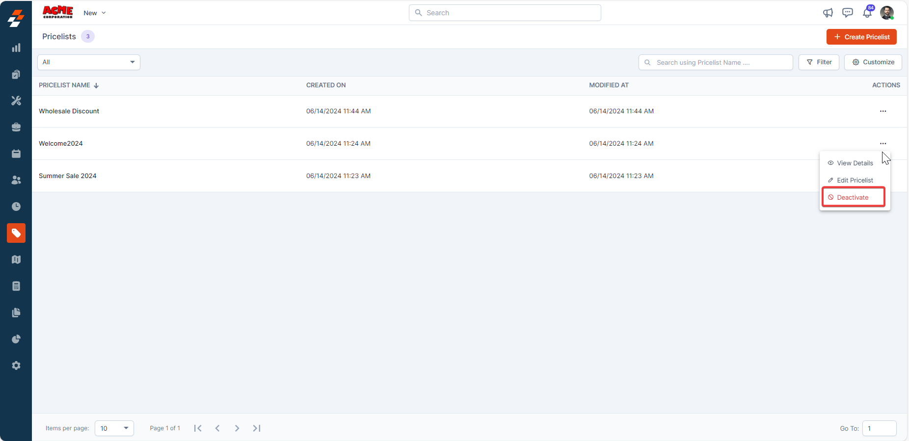 - On the Pricelists listing page, select the pricelist you want to deactivate.