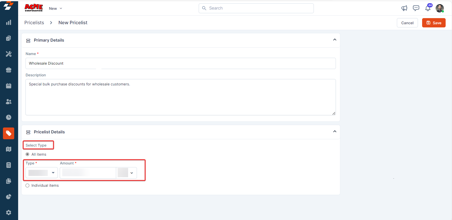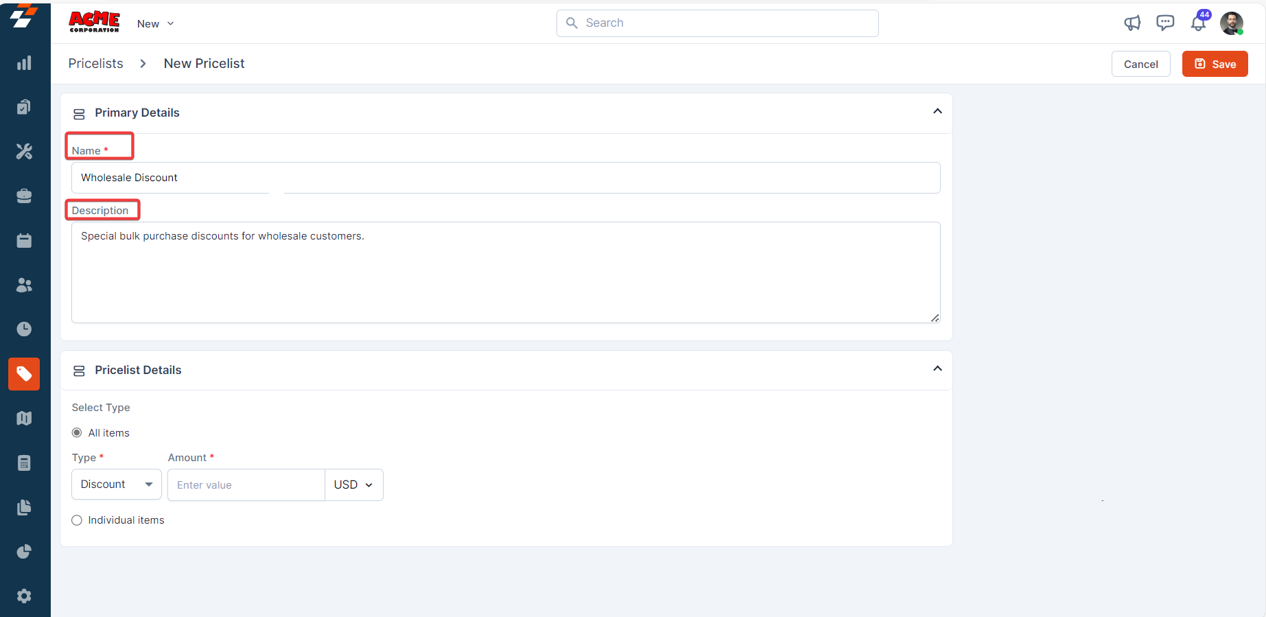- Name (Mandatory): Enter a unique name for the pricelist.