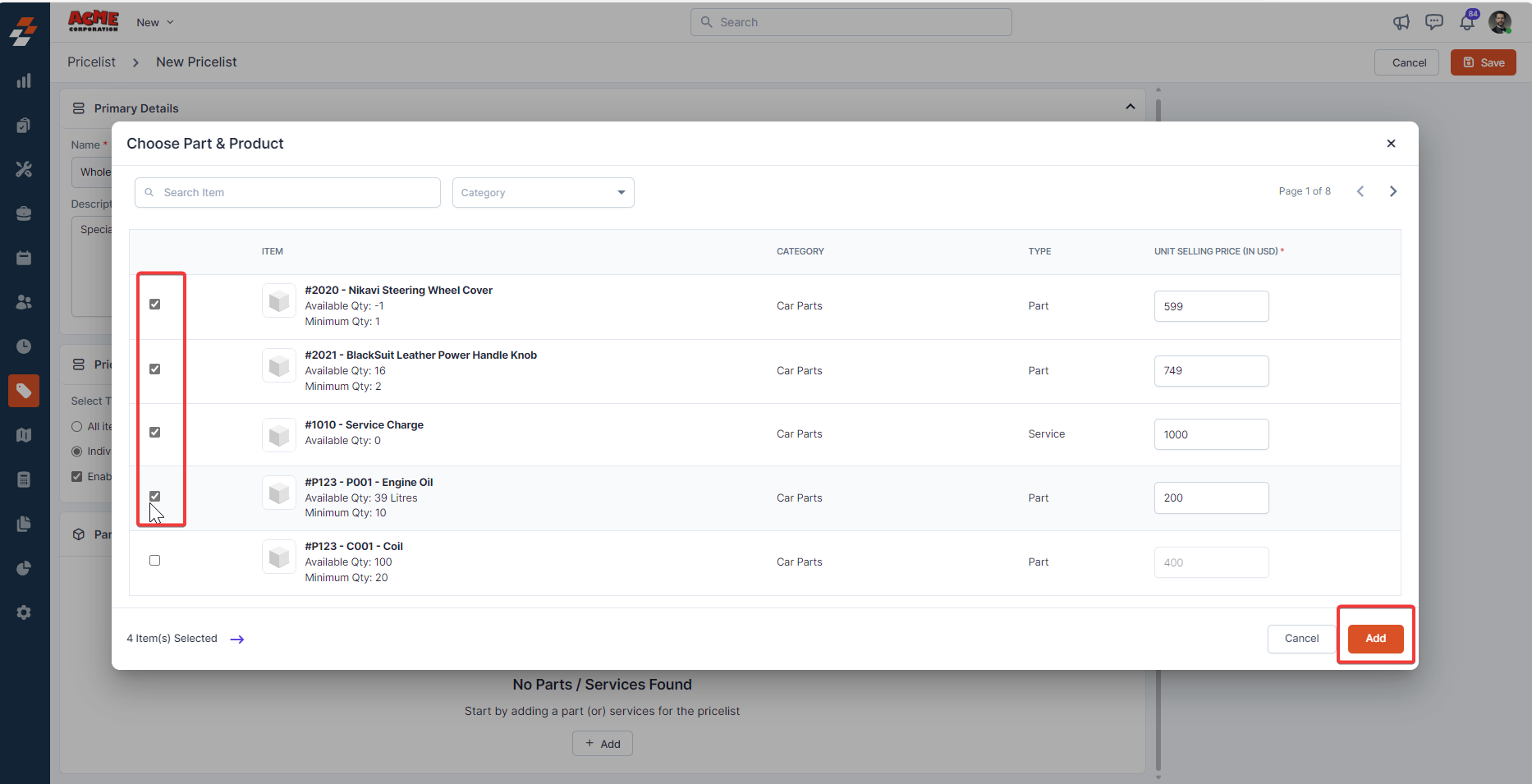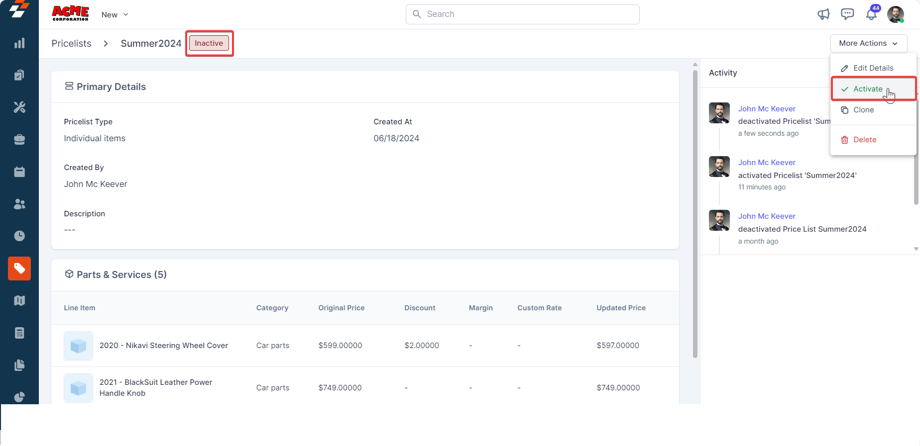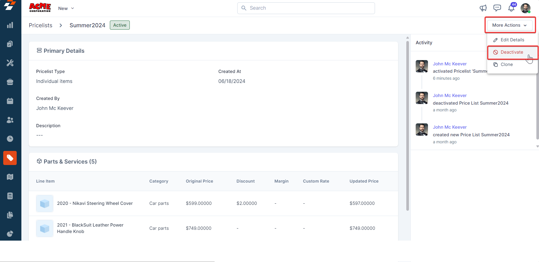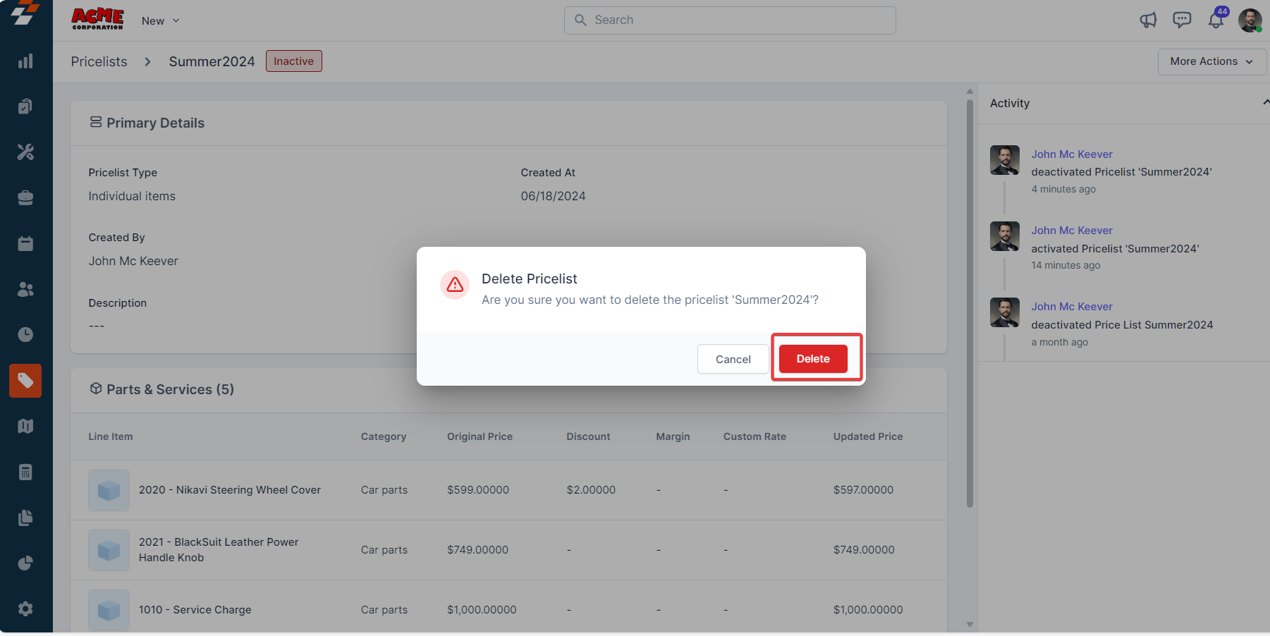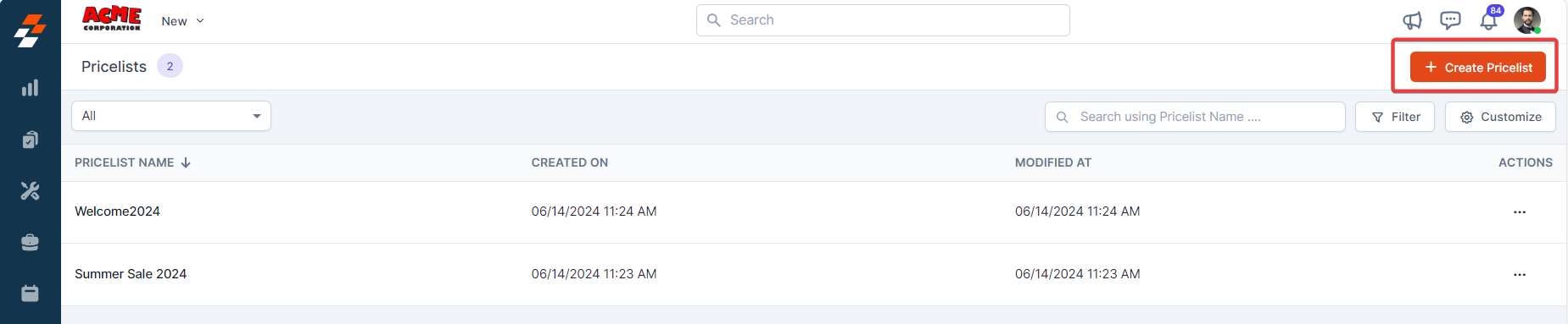The Pricelists listing page displays all the created pricelists with details such as the pricelist name, description, type, status, created date, modified date, created by, and associated customers. To access the Pricelists page, click the “Parts & ...