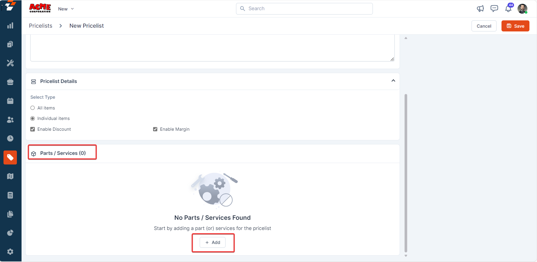 Navigation: Parts & Services --> Pricelist --> + Create Pricelist