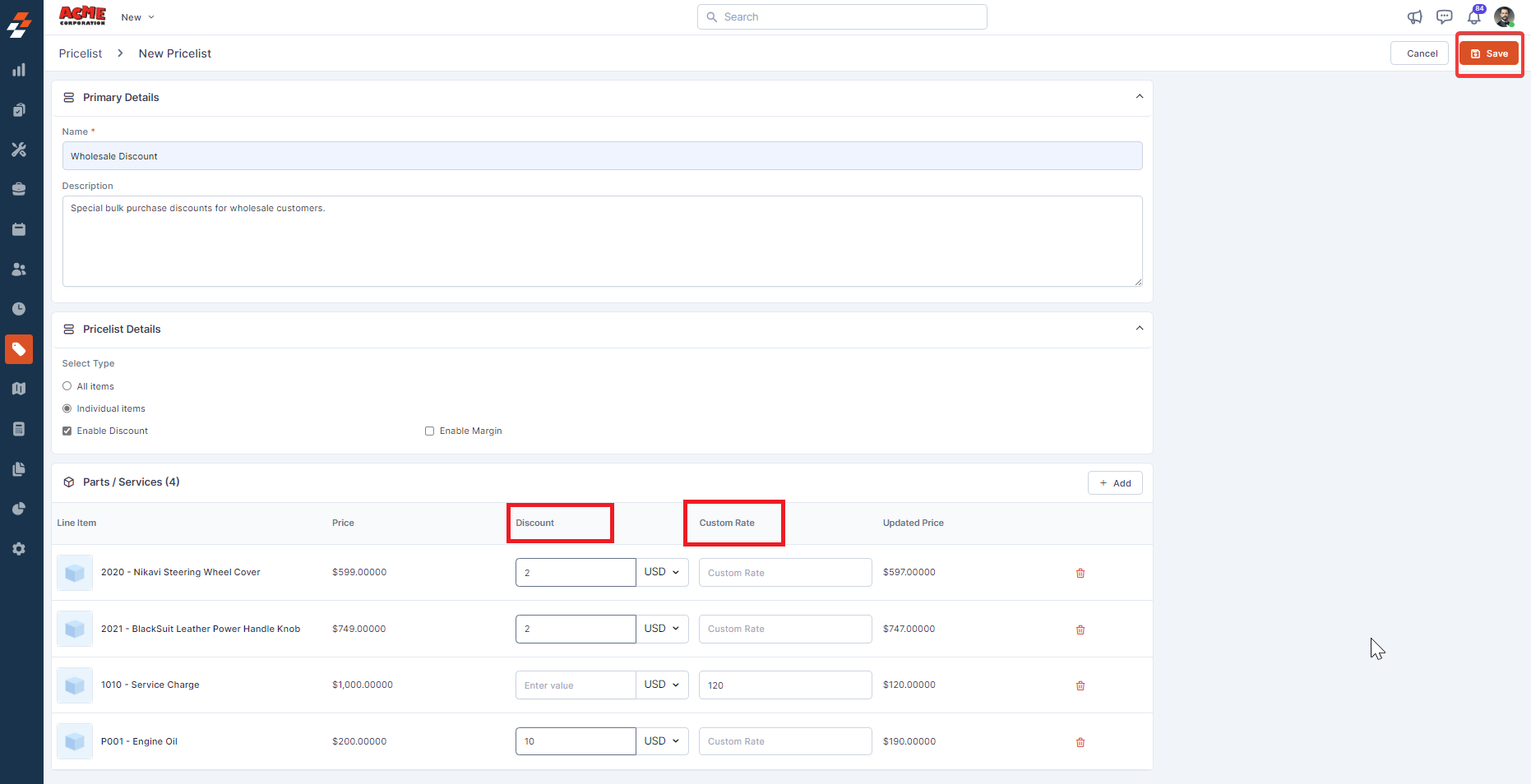 - Discount: A flat or percentage amount subtracted from the selling price you set in the master list for a part or service. The updated selling price, reflecting the applied discount, will be displayed accordingly in the Updated Price field.