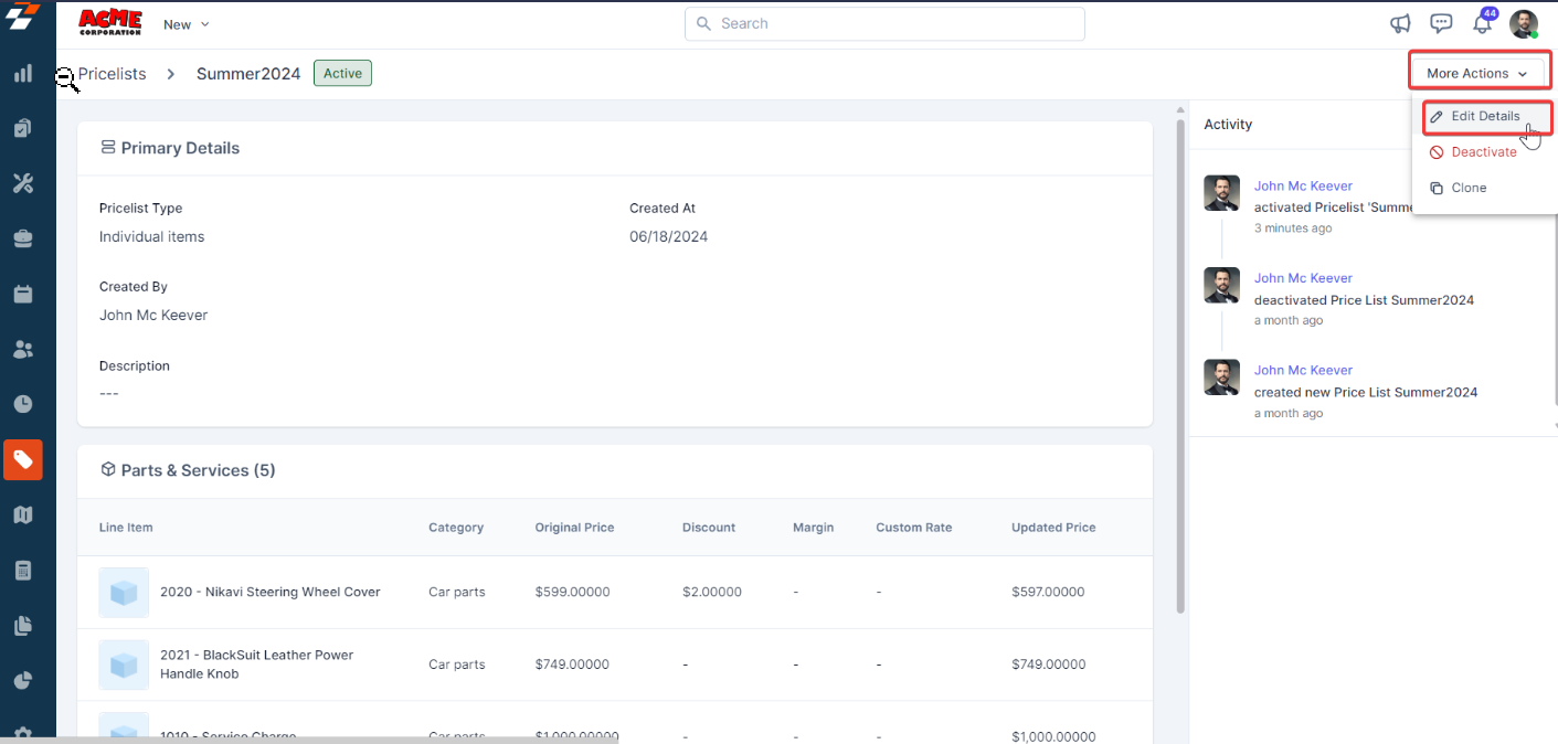 the Pricelist details page, under “More Actions,” select “Edit Details.”