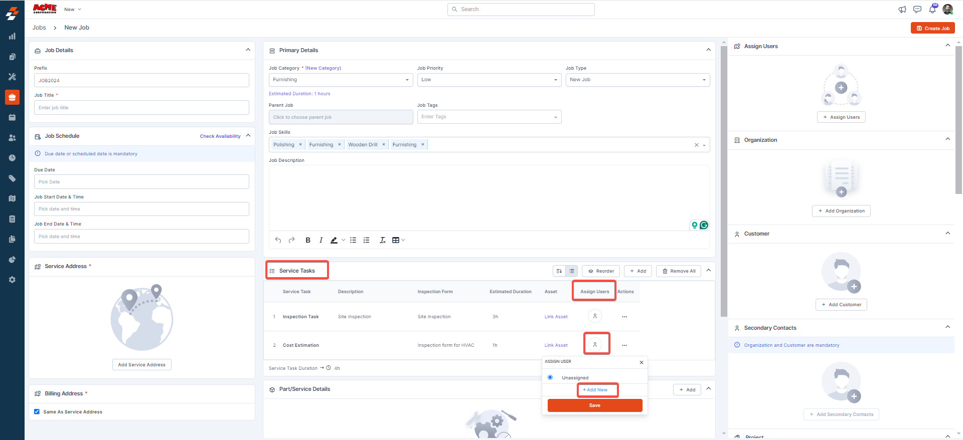 2. Select the "Job Category" under the "Primary Details" section. Based on the selected category, the service tasks will be automatically populated under the "Service Tasks" section.