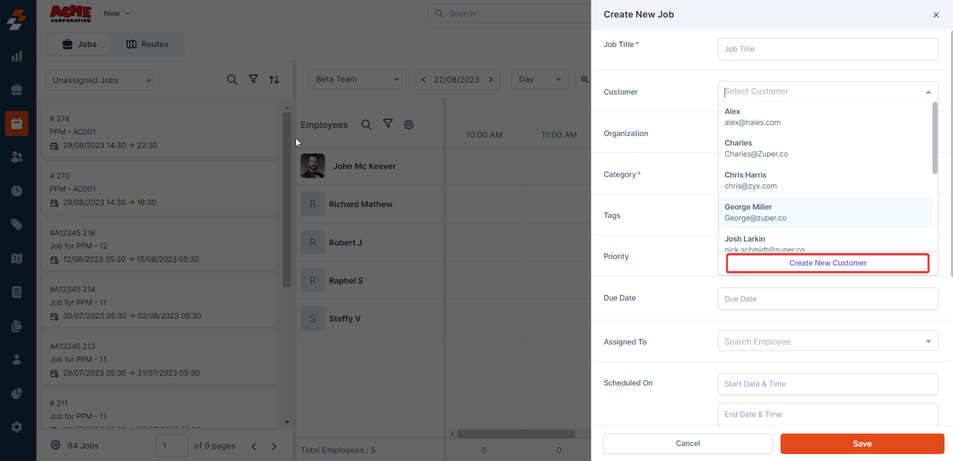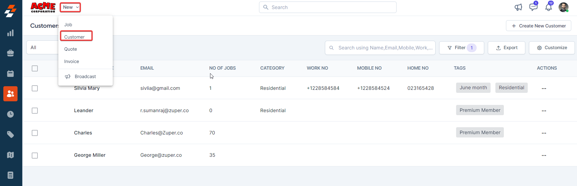 In addition to bulk importing customer data to Zuper, users can create a new customer one at a time in three different ways.