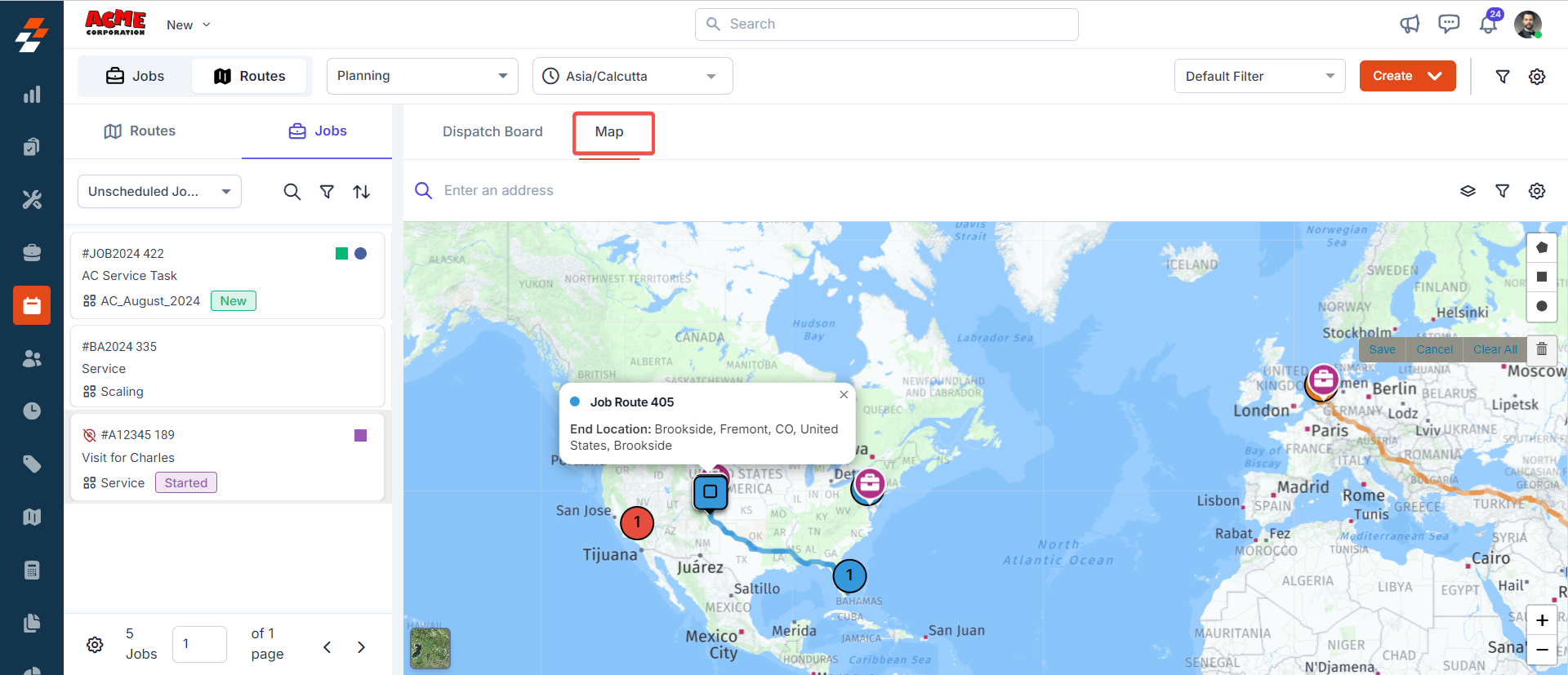 From the image above, it's evident that the "#JOB2024422 AC Service Task" job is located near the "Job Route 405" route. With this recognition, you can efficiently plan and create a route to complete the job.